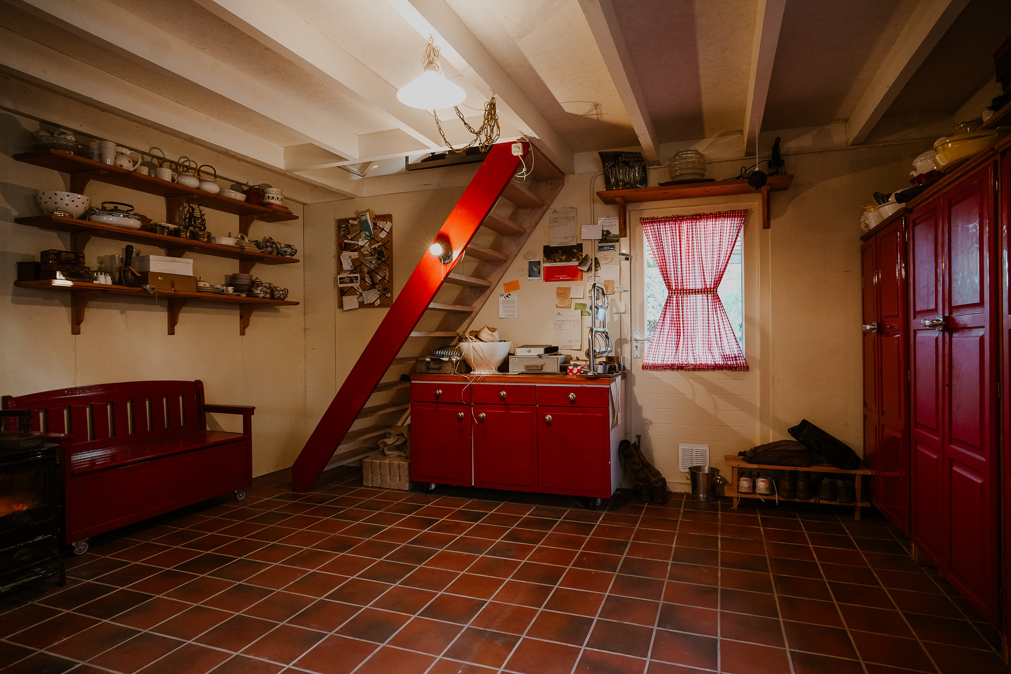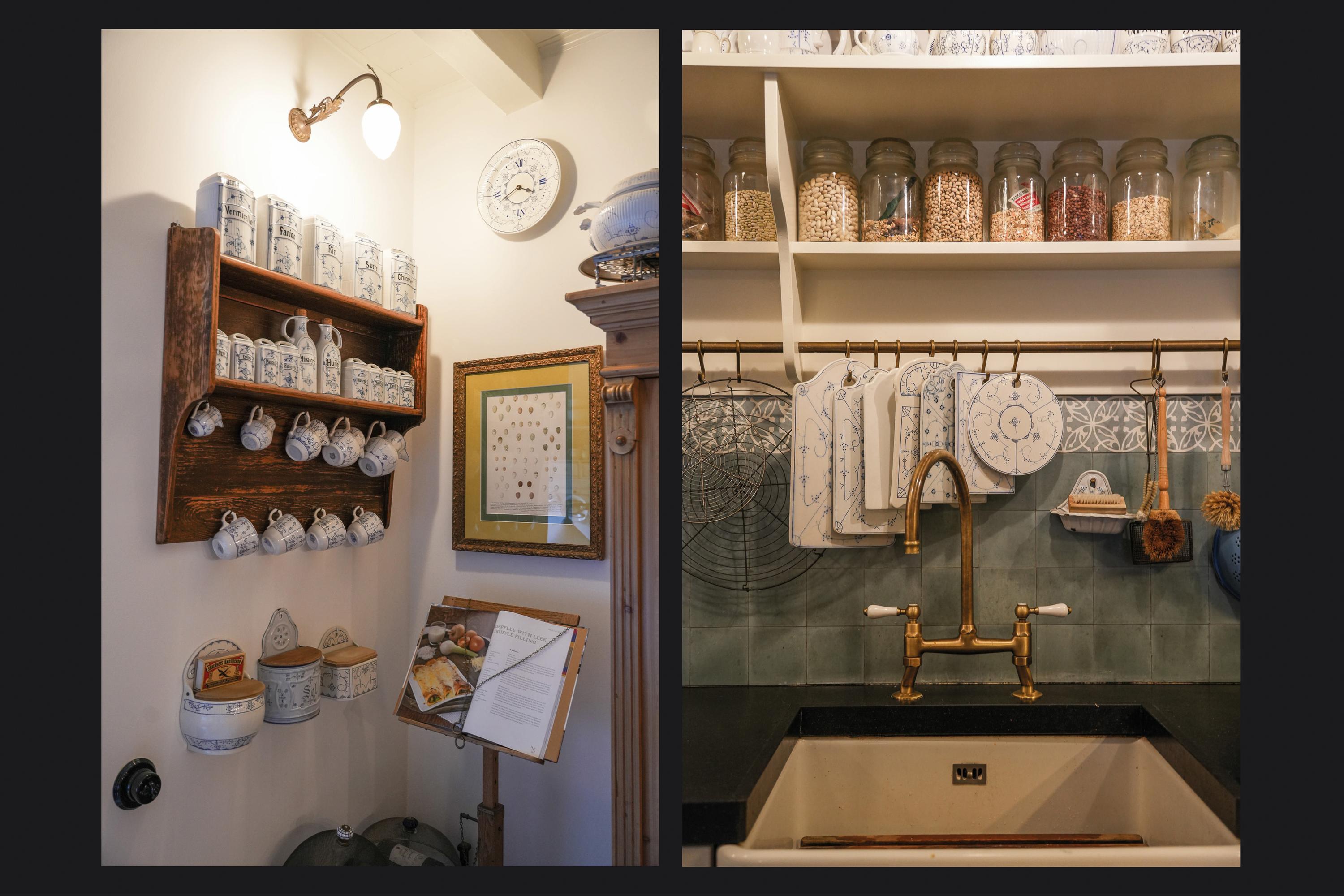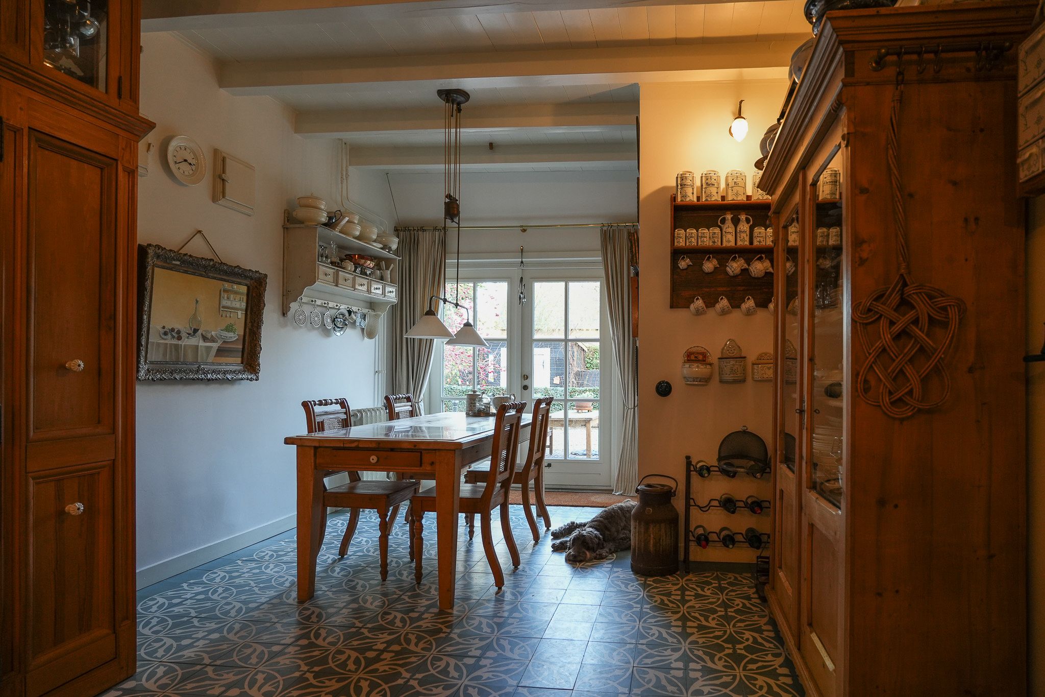 In de keuken zijn diverse ambachtelijk getimmerde vaste (boeken)kasten aanwezig, waarin ook de toegang tot de wijnkelder subtiel is weggewerkt.