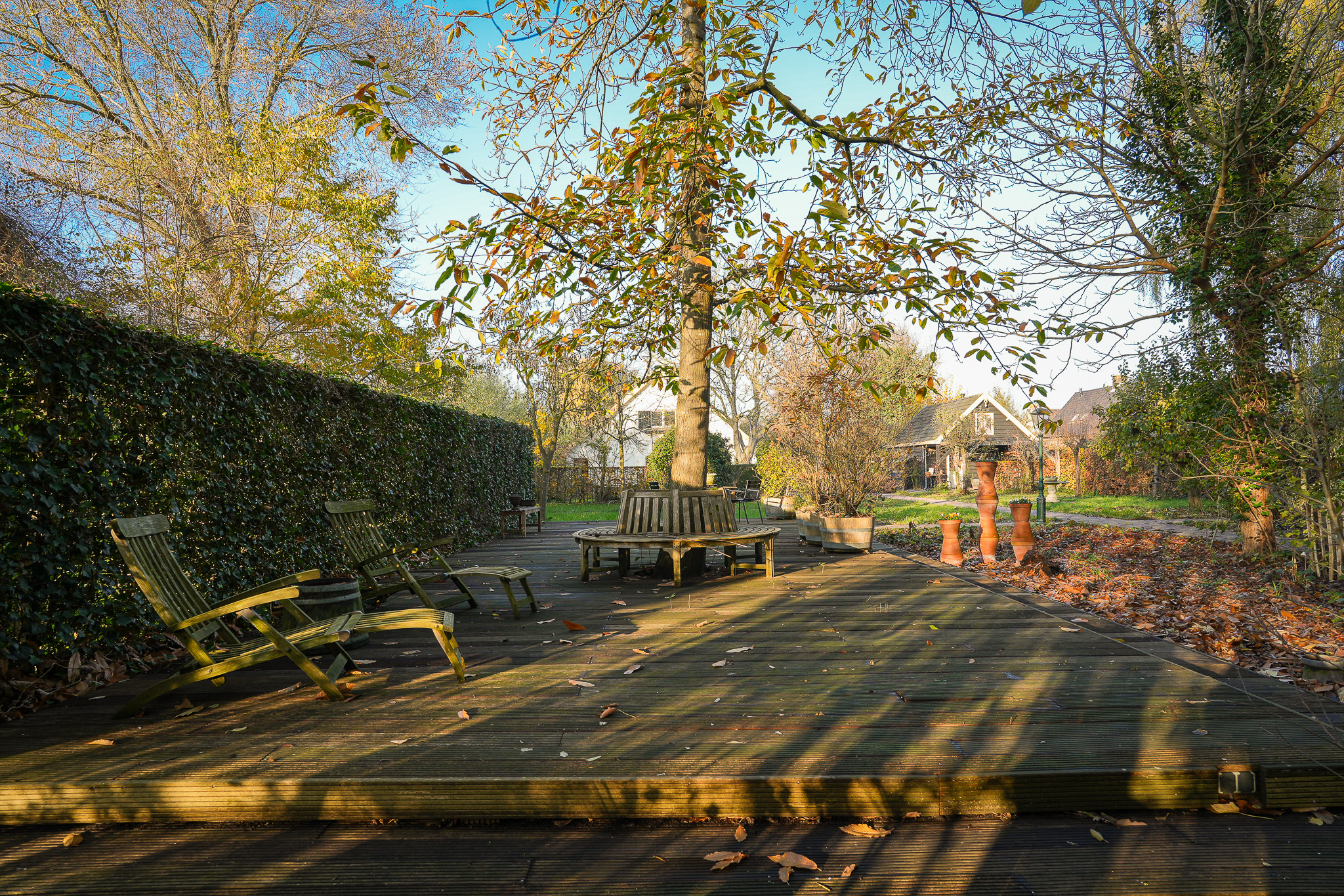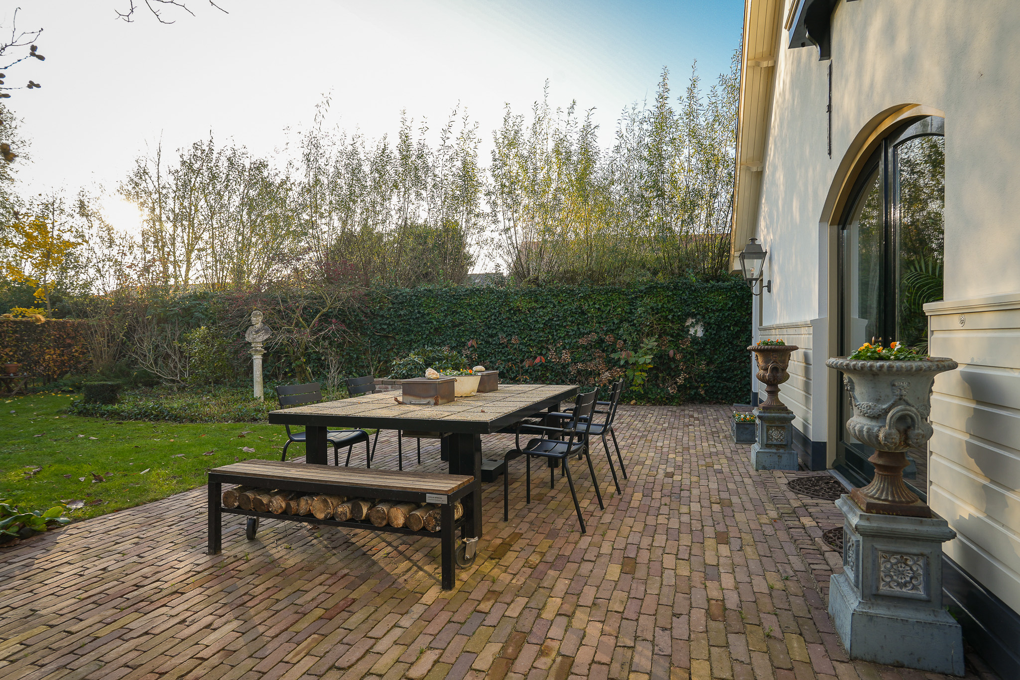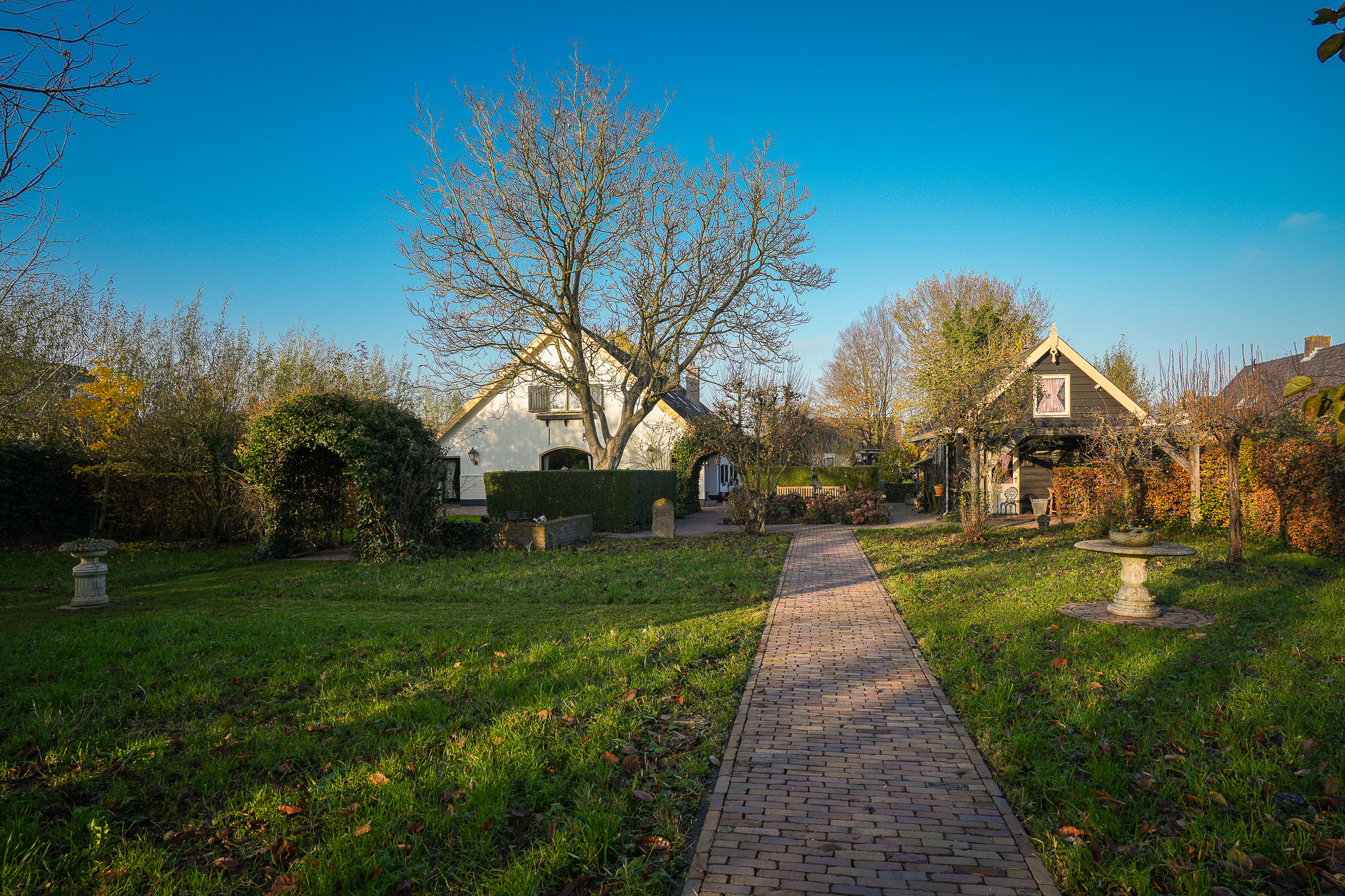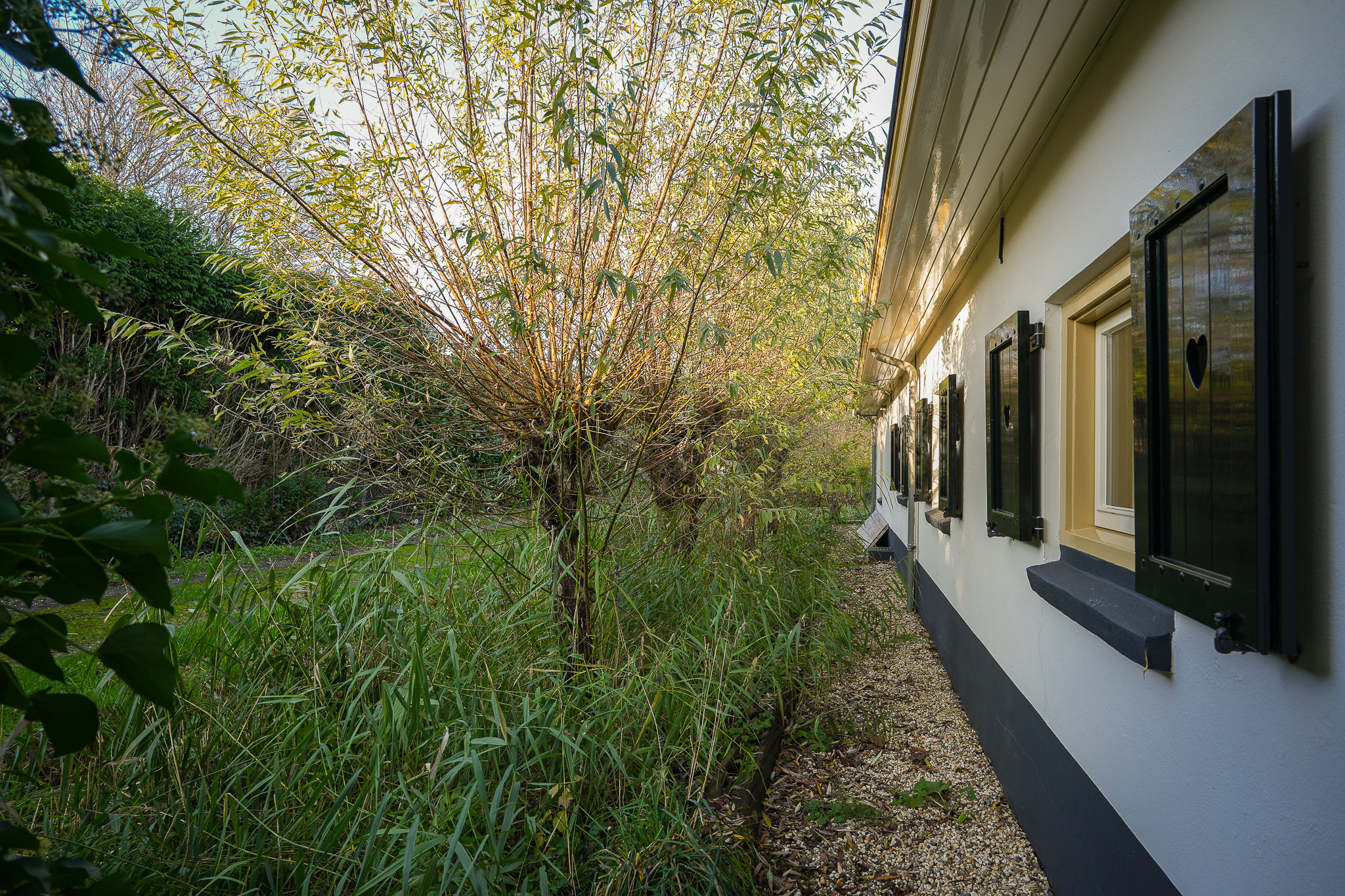 Het perceel van bijna 5.000 m² met onder meer een onderhoudsarme bloementuin is een waar paradijs voor vogels en insecten. Het perceel is omzoomd door knotwilgen, aan de voorzijde staan een oude pruimenboom en een karakteristieke treurwilg. Links van de woonboerderij bevindt zich een oprit voor meerdere auto’s, waarvan er twee onder de carport passen.