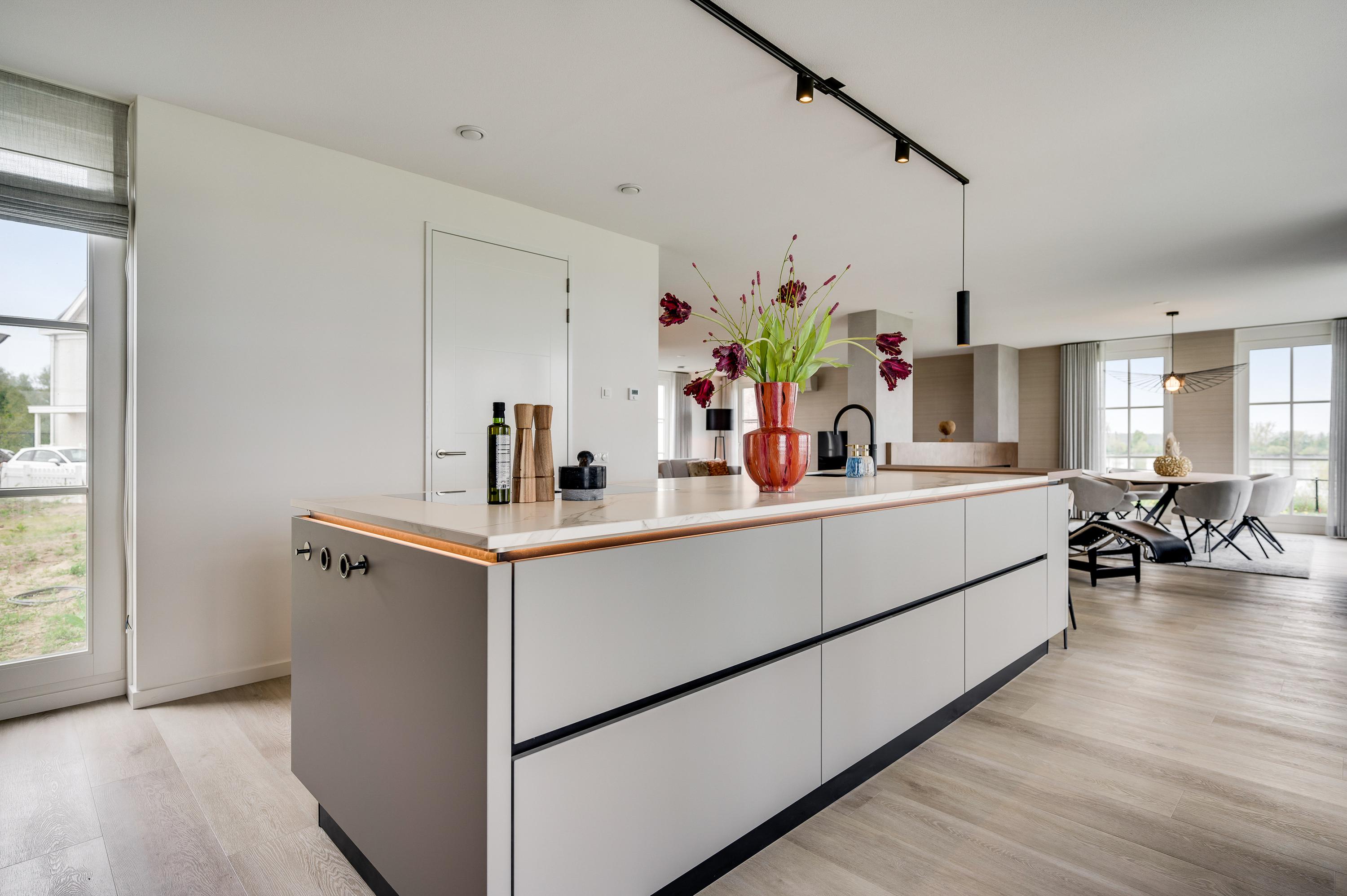 Aan de kopse kant van het eiland is een barretje gecreëerd. Hier geniet je in de ochtend van een kopje koffie en de krant of maken de kinderen huiswerk terwijl je aan het koken bent. Aan alle gemakken is gedacht, zo is er een quooker met warm en koud water, een Bora inductiekookplaat, een vaatwasser, koelkast, diepvries en wijnklimaatkast van Miele en een oven en magnetron van AEG.