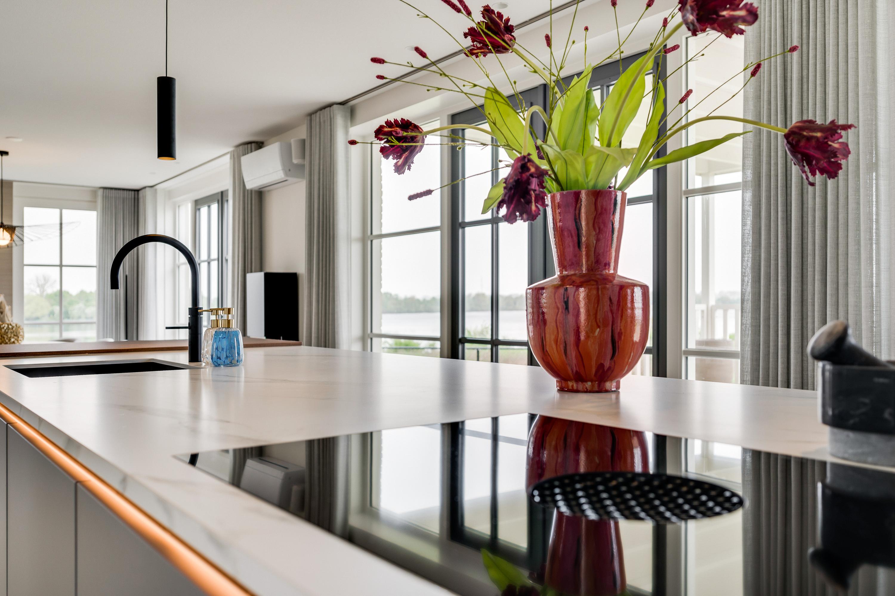 Vanuit de eetkamer kijk je uit over het water en kun je genieten van een geweldig uitzicht.