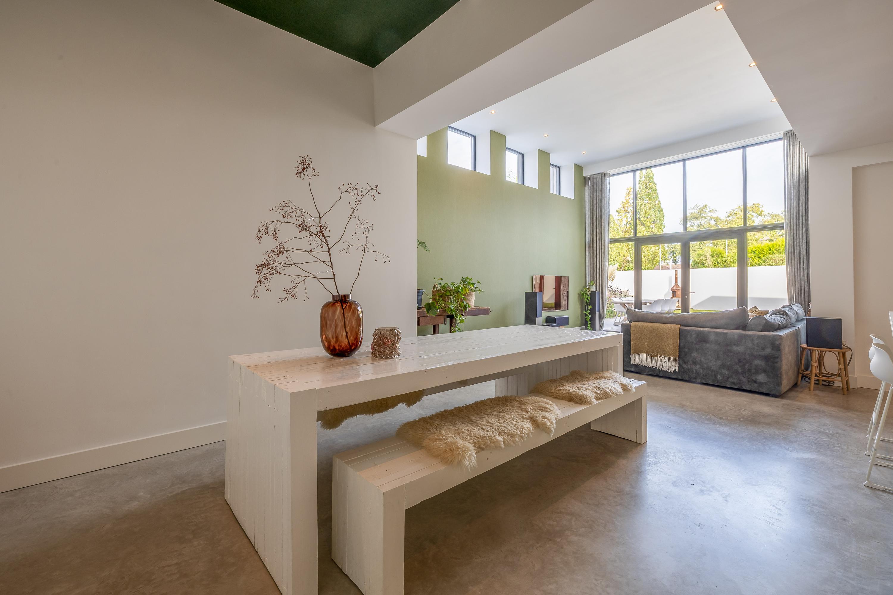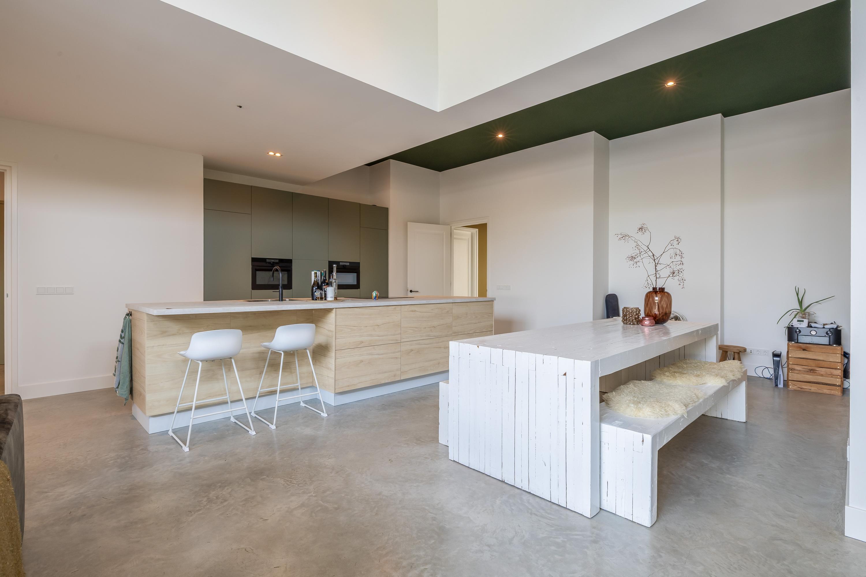 In de riante woonkamer met open keuken is eveneens veel natuurlijke lichtinval door de grote glazen pui aan de achterzijde en de kleinere ramen bovenin. Door de hoogte van de ruimte is het een zeer grote en prettige leefruimte.