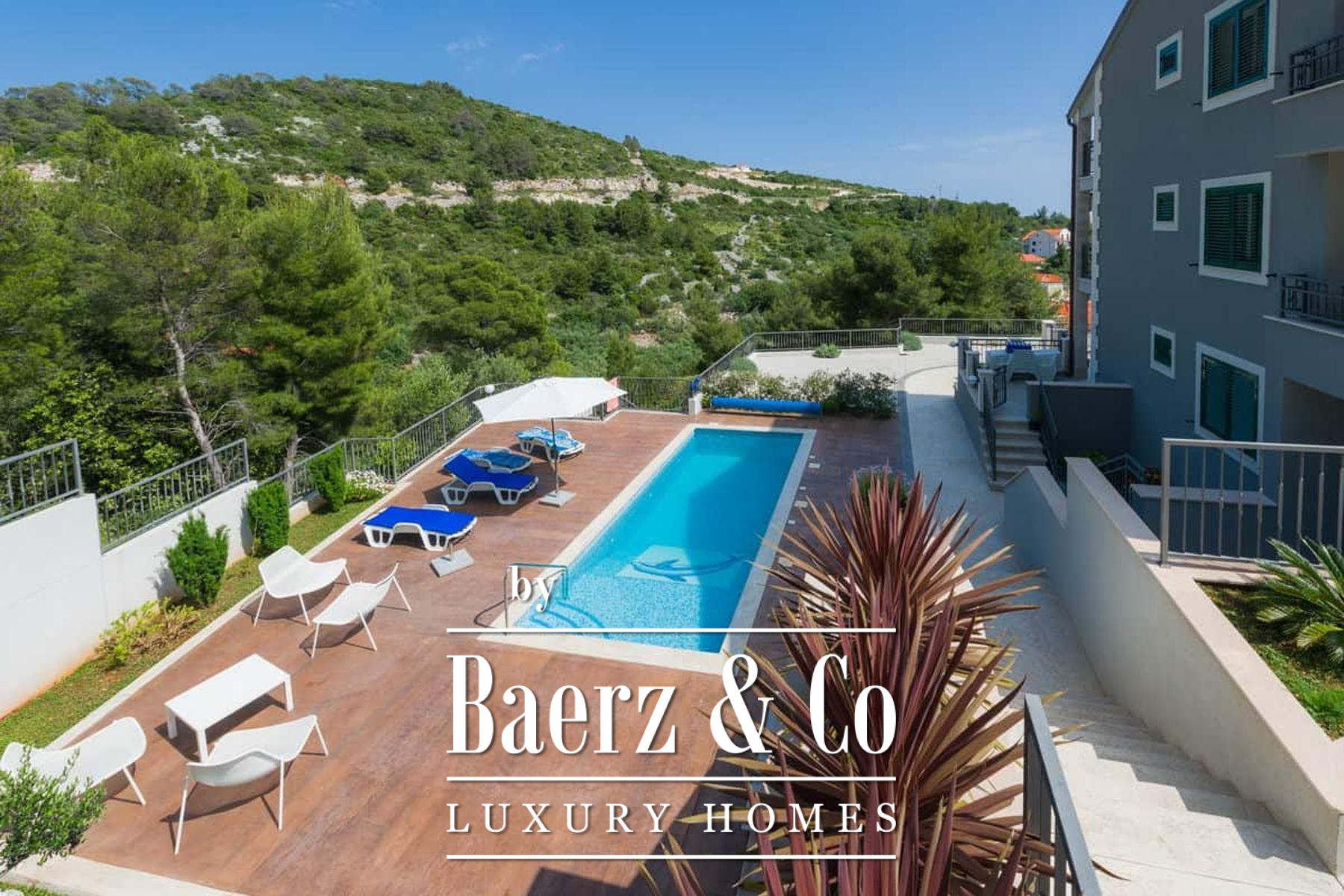 Buiten vormt het aangelegde perceel van 1.012 m² het hart van het eigendom, met een gedeeld zwembad omgeven door volwassen groen. De rustige sfeer en de uitzonderlijke nabijheid tot zee en strand onderscheiden dit object voor wie investeringsoverwegingen én een privé toevluchtsoord aan de Middellandse Zee zoekt. Appartementenhuis Hvar Milna is een buitenkans in een felbegeerd kustgebied.
