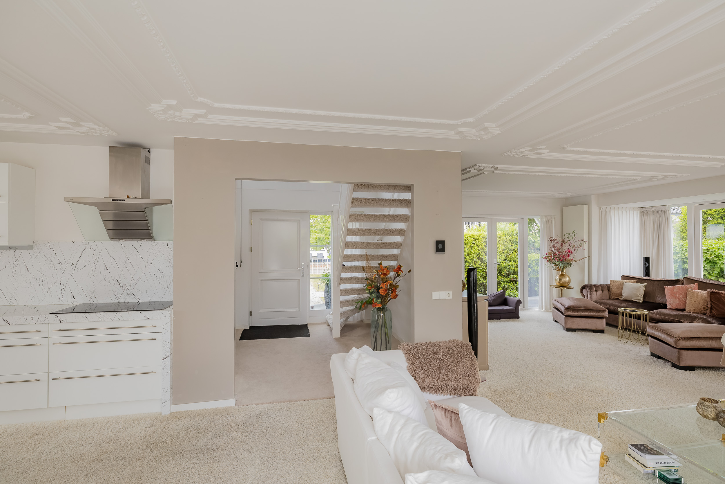 U betreedt de woning via een royale hal met vide en de trap naar boven. Een garderobe-nis met toiletruimte en meterkast zorgen voor een praktische indeling. De woonkamer is ruim, licht en sfeervol en voorzien van een grote erker, klassieke sierlijsten aan het plafond en een gezellige gashaard. Dankzij drie paar dubbele openslaande deuren én een schuifpui staat de living in directe verbinding met het zonnige terras aan het water.