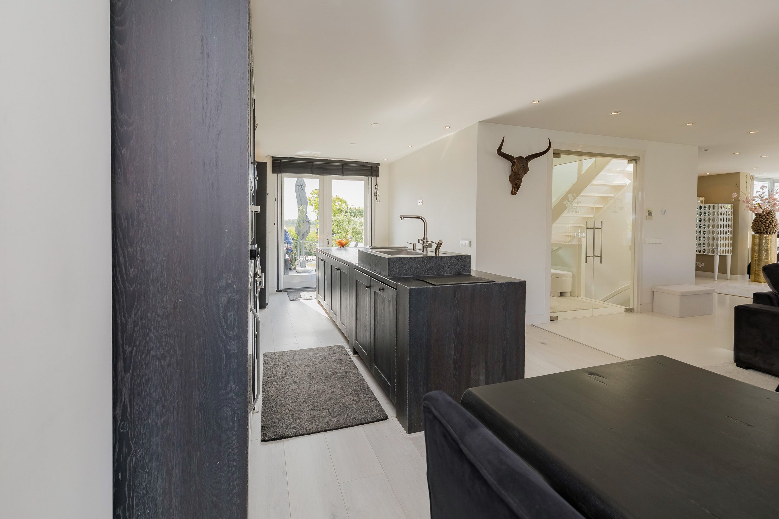 Via de lichte entree betreed je een royale, lichte woonkamer met een sfeervolle gashaard. De luxe harmonicadeuren zorgen niet alleen voor een zee van licht, maar verbinden de binnenruimte op harmonieuze wijze met het ruime vlonderterras aan het water.