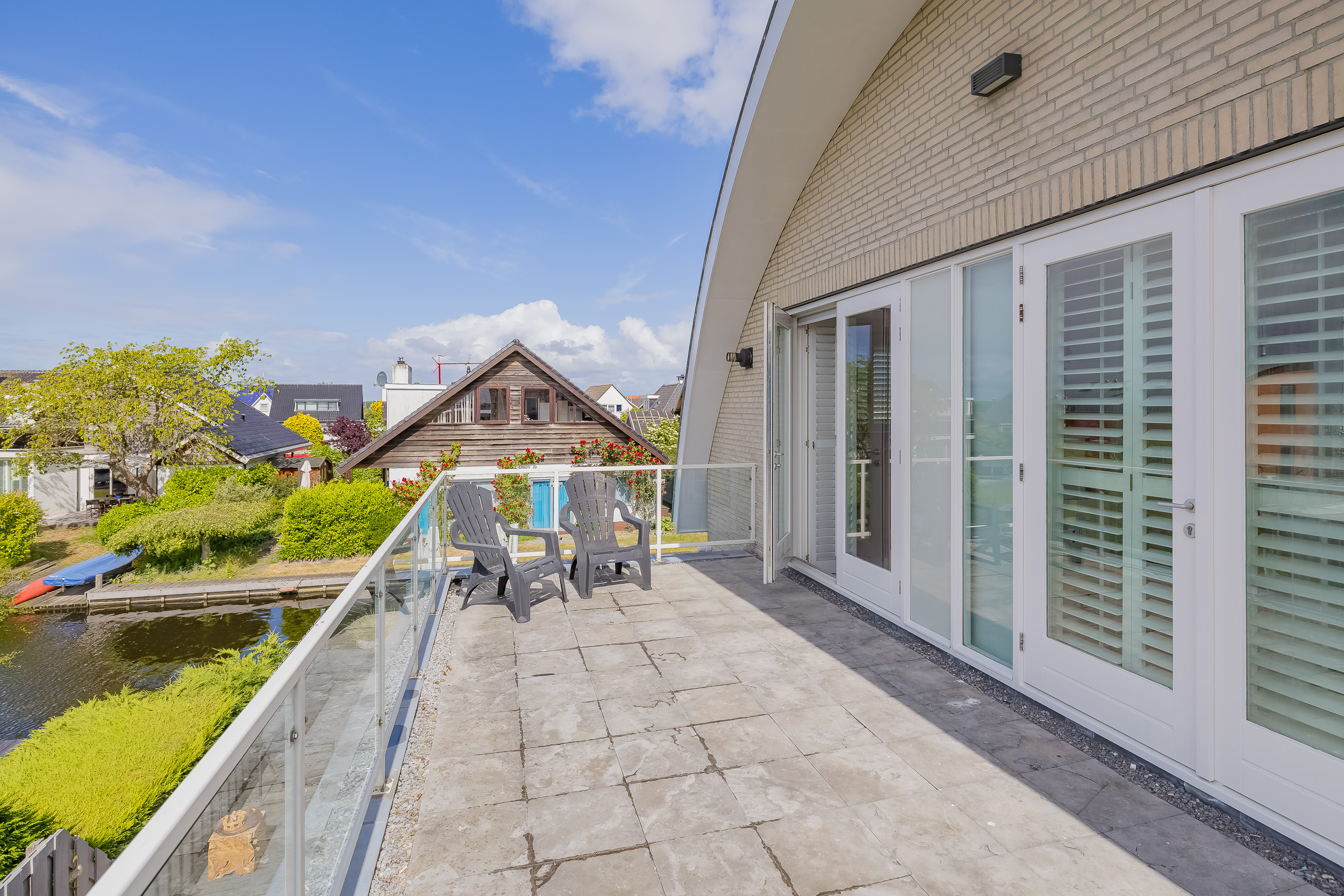 Het kunststof vlonderterras aan te achterzijde heeft meerdere zitplekken en een aanlegsteiger voor directe toegang tot vaarwater van de Kagerplassen. Hier geniet je van het uitzicht, de avondzon en vaar je in een mum van tijd naar het open water.