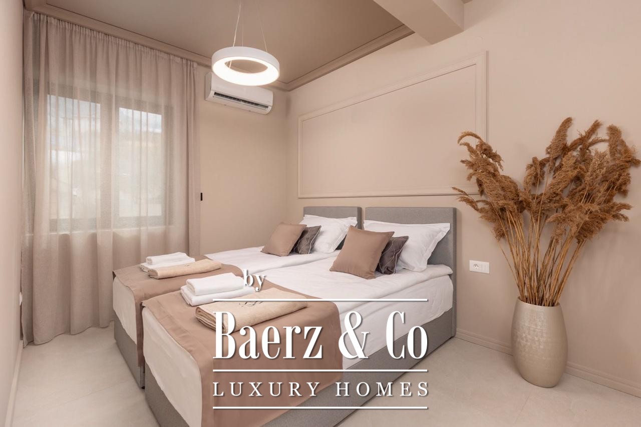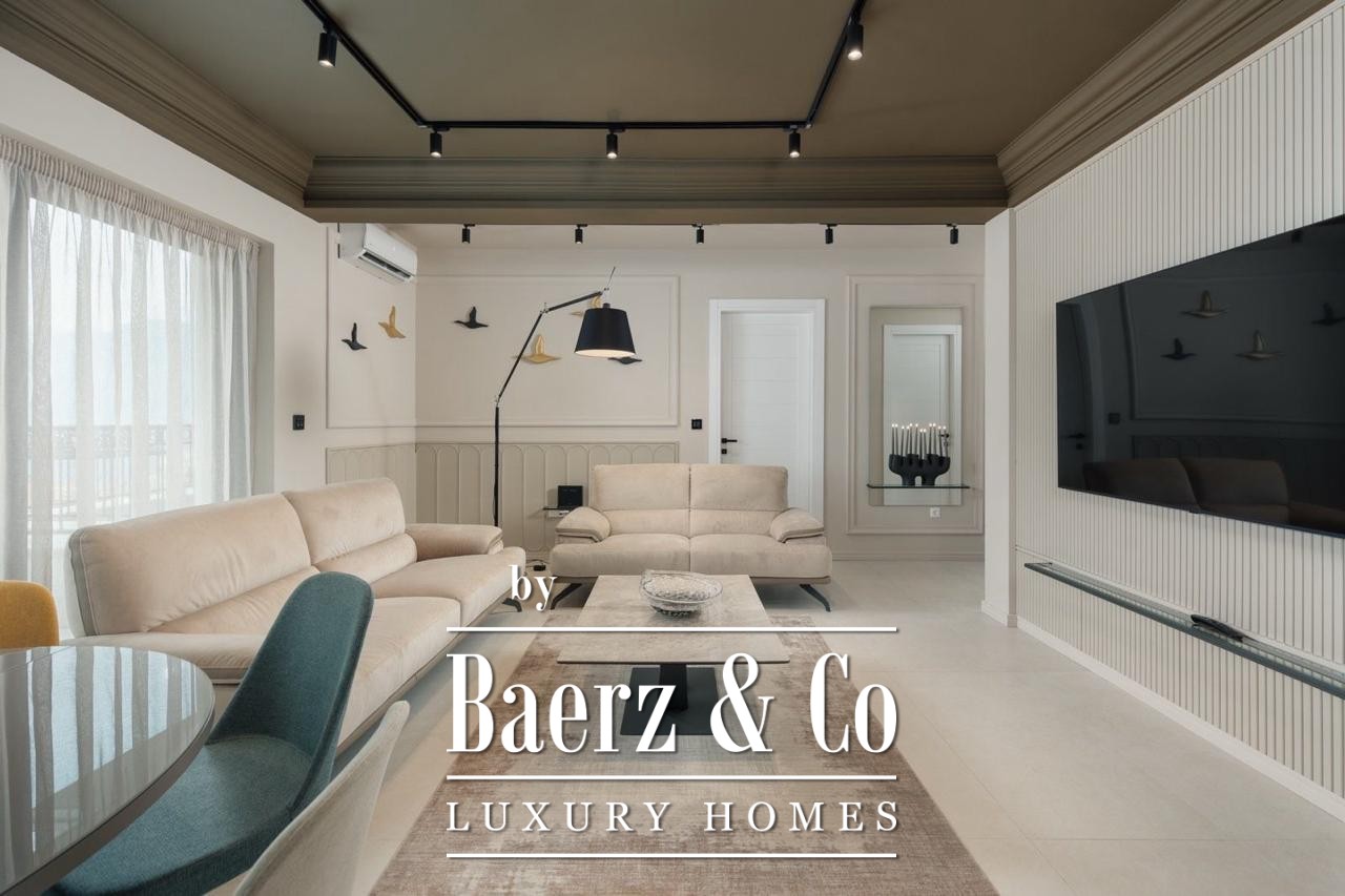Het appartement beschikt over drie slaapkamers, een badkamer, een aparte toiletruimte en twee terrassen. Vloerhoge ramen brengen het wisselende uitzicht over de baai van Kotor naar binnen en vormen een harmonieuze aanvulling op de 186 m² woonruimte, volledig gemeubileerd en klaar voor directe bewoning. Een doordachte indeling leidt via de hal naar de leefruimtes en terrassen, waar buitenleven wordt bepaald door het spel van zee en lucht.