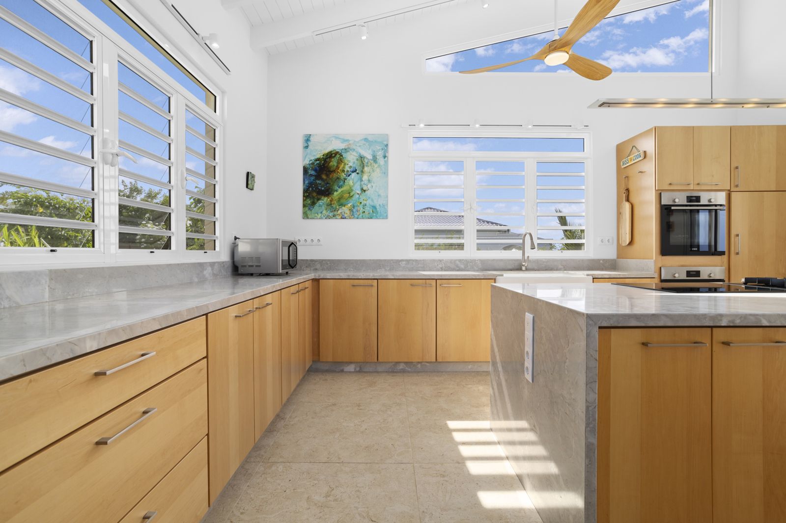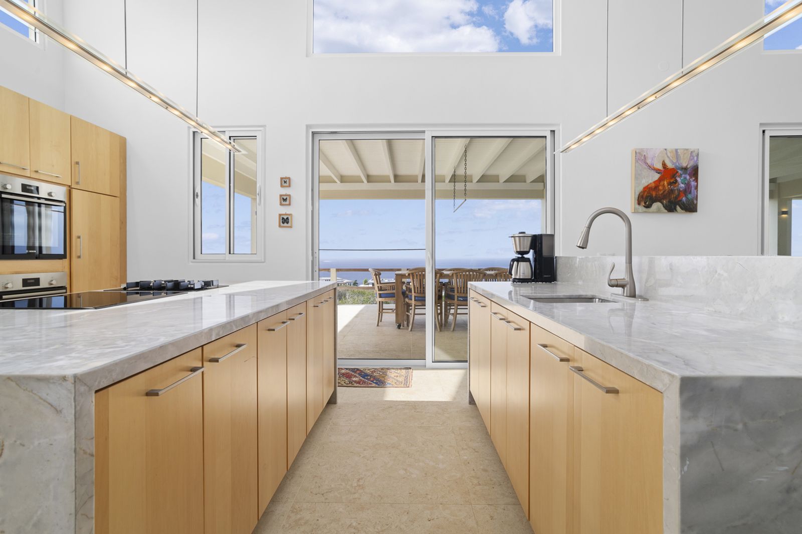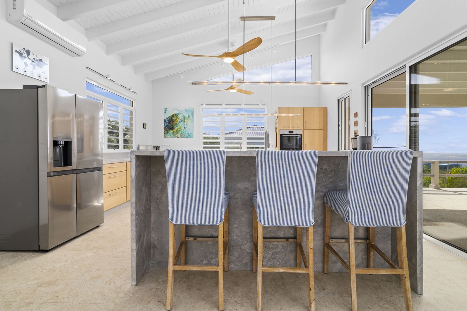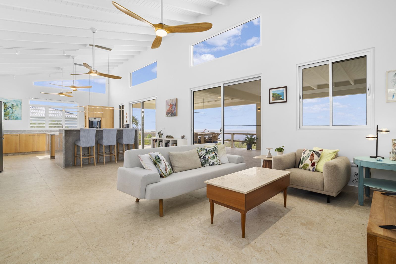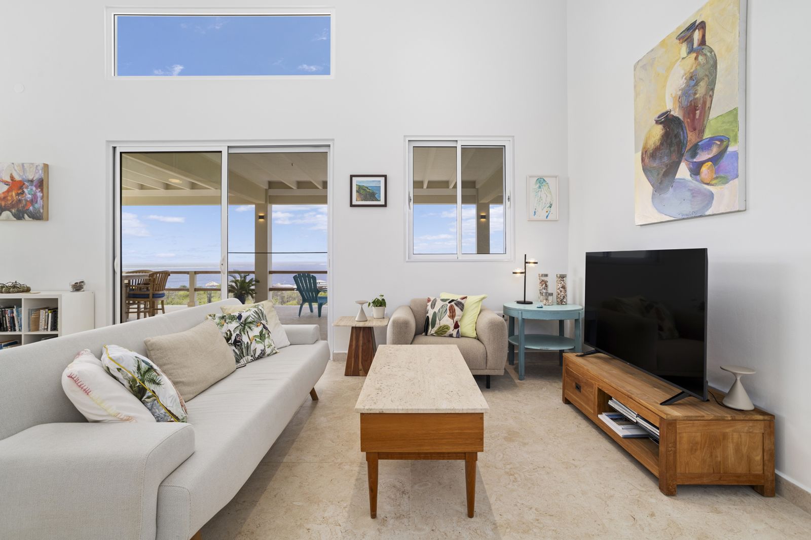 De strakke architectuur en grote schuifdeuren zorgen voor een natuurlijke verbinding tussen binnen en buiten. Het ruime terras aan zeezijde vormt een verlengstuk van de leefruimte en vangt de verkoelende passaatwinden, met vrij uitzicht van zonsopgang tot zonsondergang.