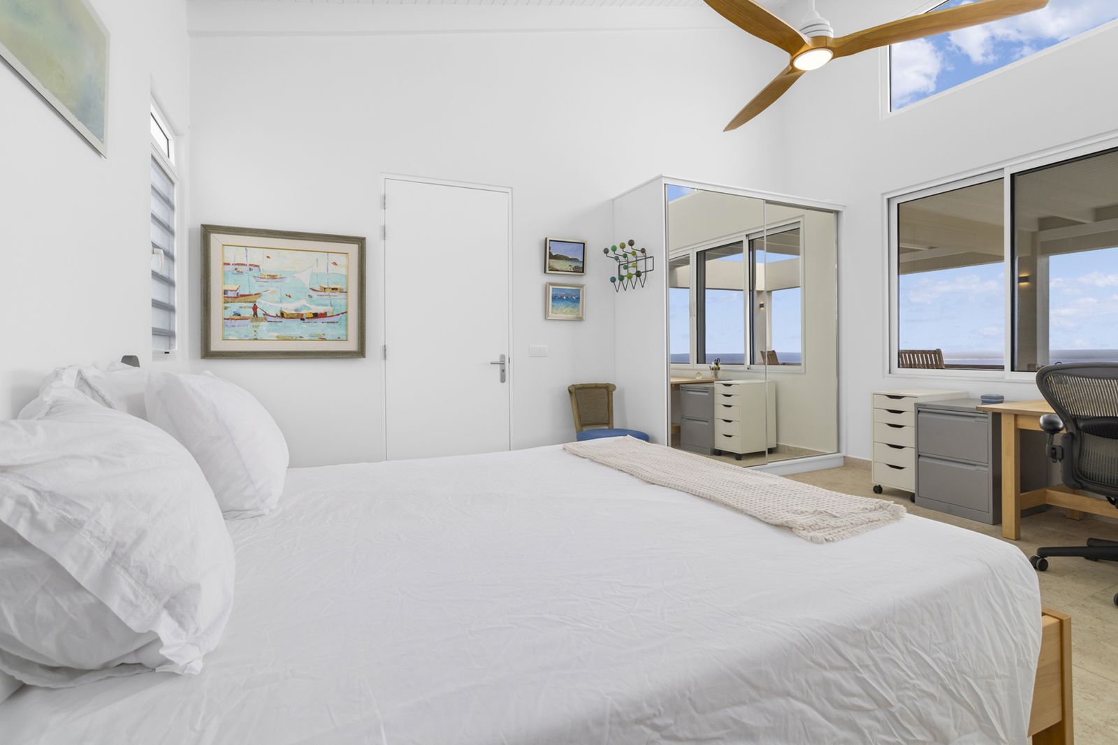 De ruime master bedroom kijkt uit over de Caribische Zee en beschikt over een verfijnde ensuite badkamer met dubbele wastafel en inloopdouche. De keuken met dubbel kookeiland is perfect voor wie graag gasten ontvangt, met veel werkruimte en een open verbinding naar de bar en het buitenterras. Daarnaast beschikt de woning over een grote, afsluitbare bergruimte voor watersportmateriaal, een zeldzame luxe op Bonaire.