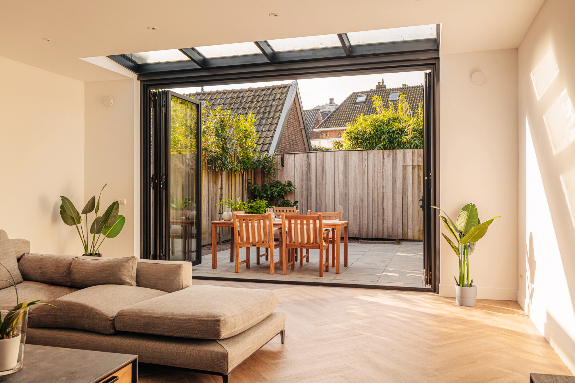 En dan is er nog de buitenruimte: een zonnige tuin van ca. 40 m², ideaal voor ontbijt in de ochtendzon of een ontspannen diner in de avond. Bovendien is er een intieme patio – de perfecte plek voor een bijzonder kunstwerk, prachtig uitgelicht dankzij de aanwezige elektra.