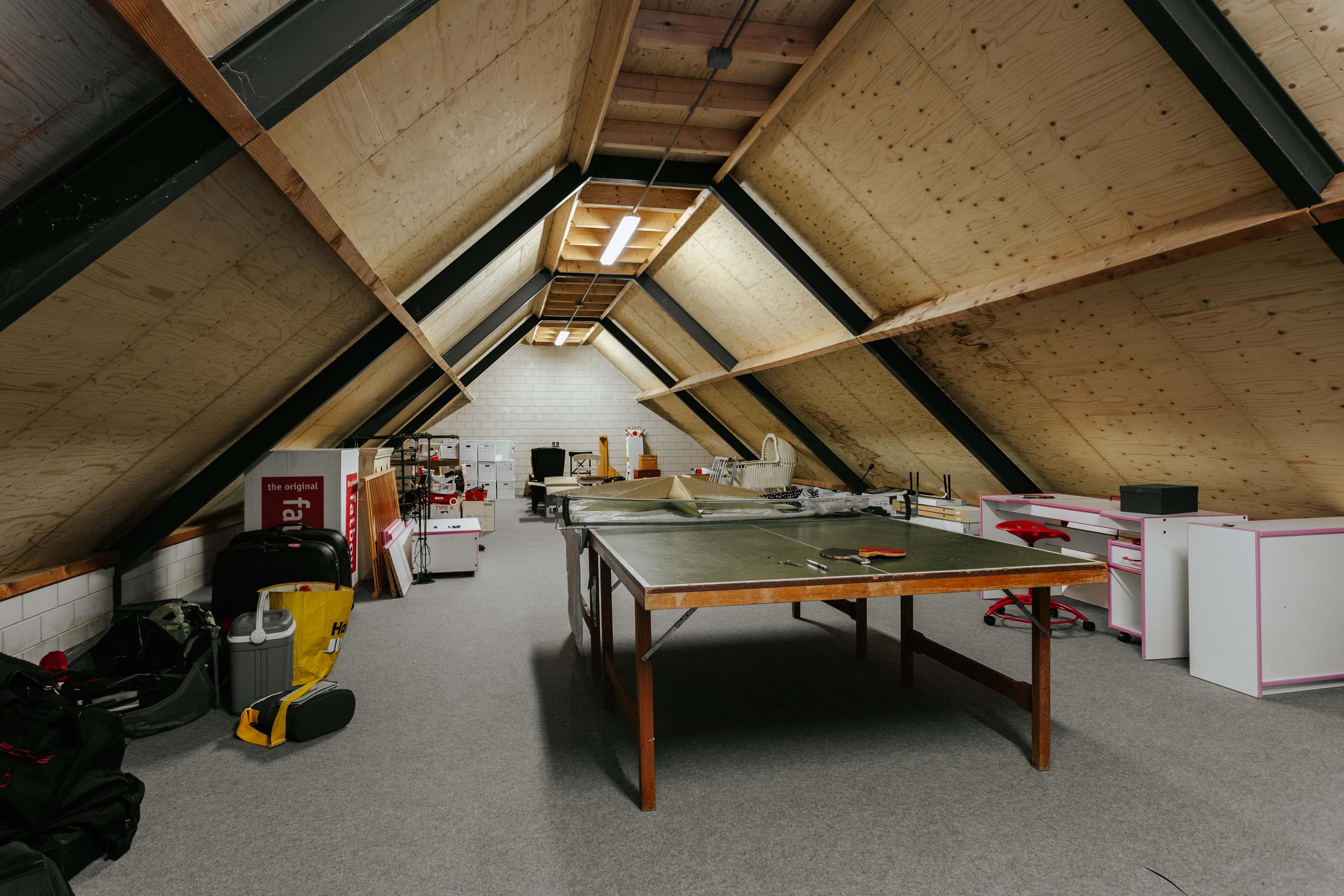 De bergzolder is te bereiken via een Vlizotrap, hier staan de cv-ketels, de warmwaterboiler en de motor van de professionele afzuigkap.