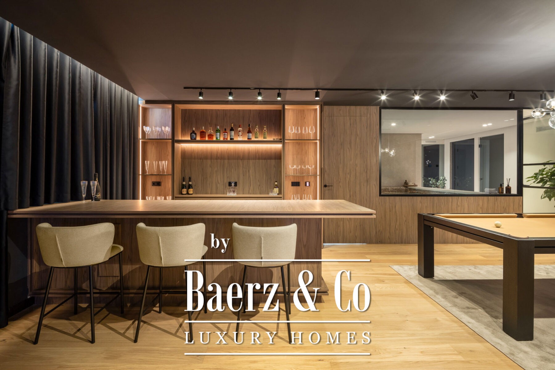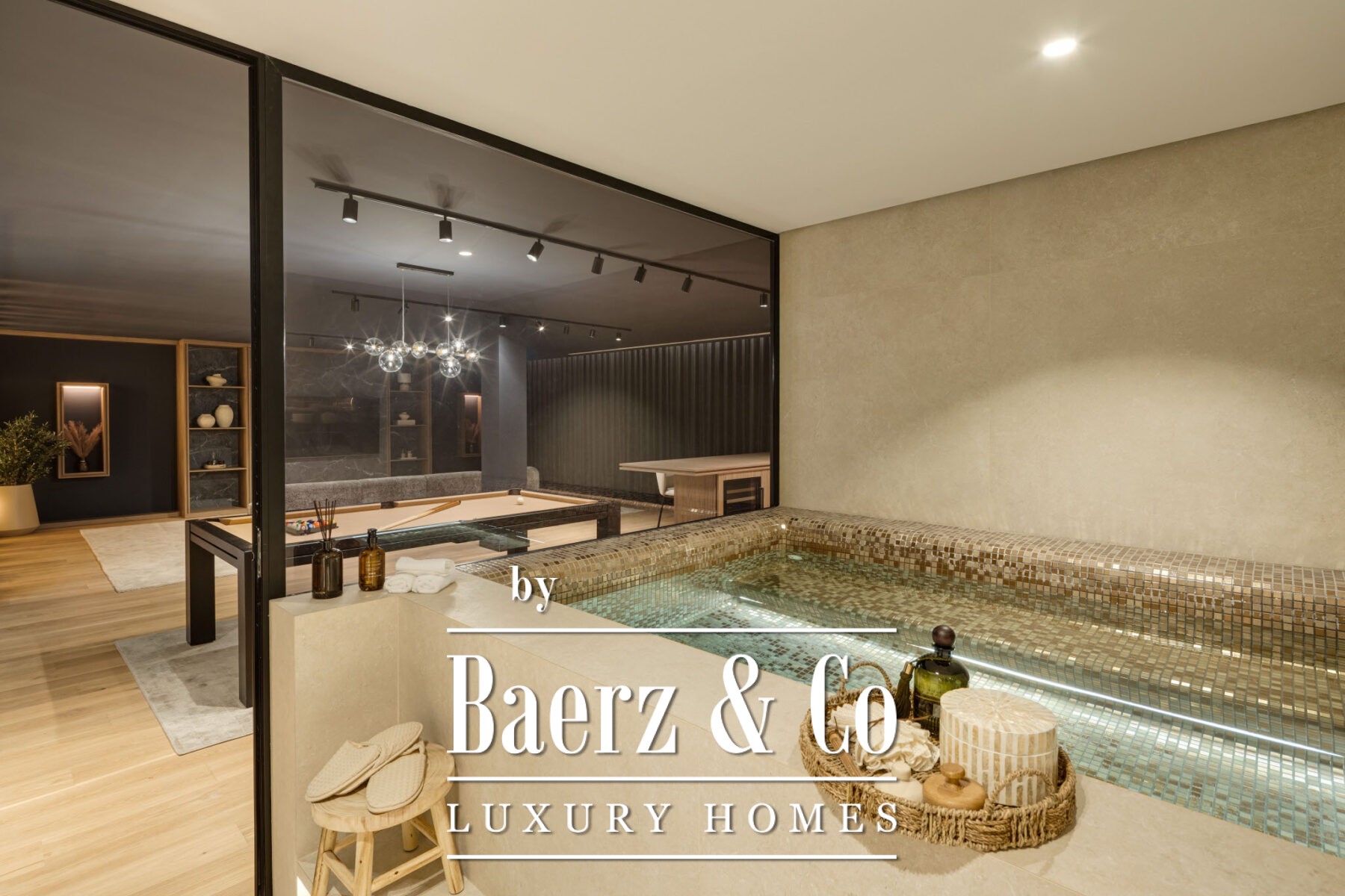 Het interieur onderscheidt zich door hoogwaardige eiken vloeren, grootformaat porseleinen tegels en de nieuwste apparatuur van Gaggenau en Siemens. Voor ontspanning is er een privé verwarmd zwembad, een eigen bioscoop en een gym. De garage voldoet aan de moderne eisen. De villa wordt volledig gemeubileerd in een hedendaagse stijl aangeboden, met de mogelijkheid het meubilair apart aan te schaffen voor €250.000.