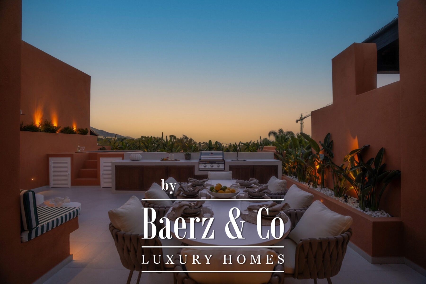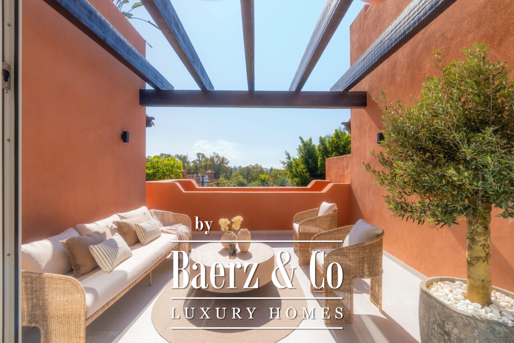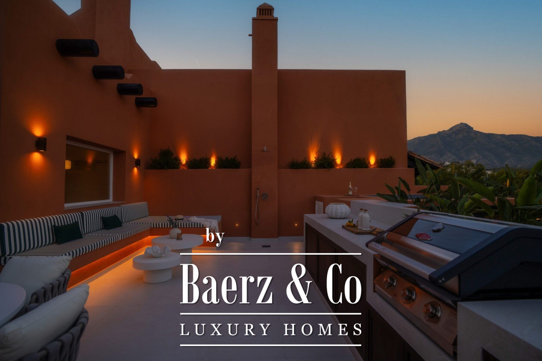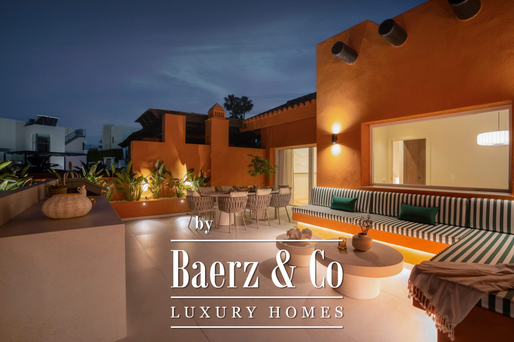 Het duplex penthouse in Marbella bevindt zich in een beveiligde residentie in Nueva Andalucía en biedt een discreet toevluchtsoord op enkele momenten van de Middellandse Zee. Deze recent gerenoveerde woning van 210 m² beschikt over vier slaapkamers en drie badkamers, waarbij hedendaagse architectuur wordt gecombineerd met hoogwaardige afwerkingen. Op de hoofdverdieping grenst een keuken uitgerust met Miele-apparatuur aan open woon- en eetruimtes, die leiden naar een terras met een fraai uitzicht op La Concha en de zee.