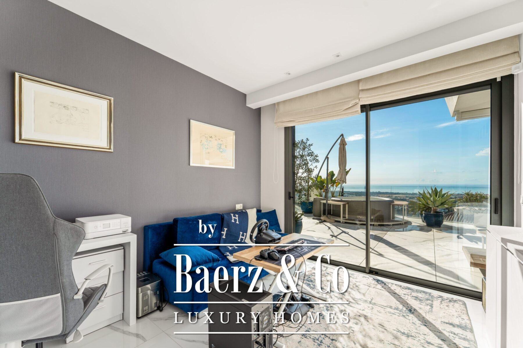 Het woongenot draait om een royaal terras van 102 vierkante meter, fraai verlicht en privé toegankelijk vanuit elk van de drie slaapkamers. De hoofdsuite beschikt over een eigen badkamer, terwijl de overige twee slaapkamers gebruikmaken van naastgelegen badkamers, waardoor comfort voor gezinnen of gasten wordt gecombineerd met ononderbroken zicht vanuit elke kamer. Het terras biedt ruimte voor rust of samenkomen en is uitgerust met een jacuzzi en royale zones voor dineren en ontspannen — alles onder het mediterrane licht.