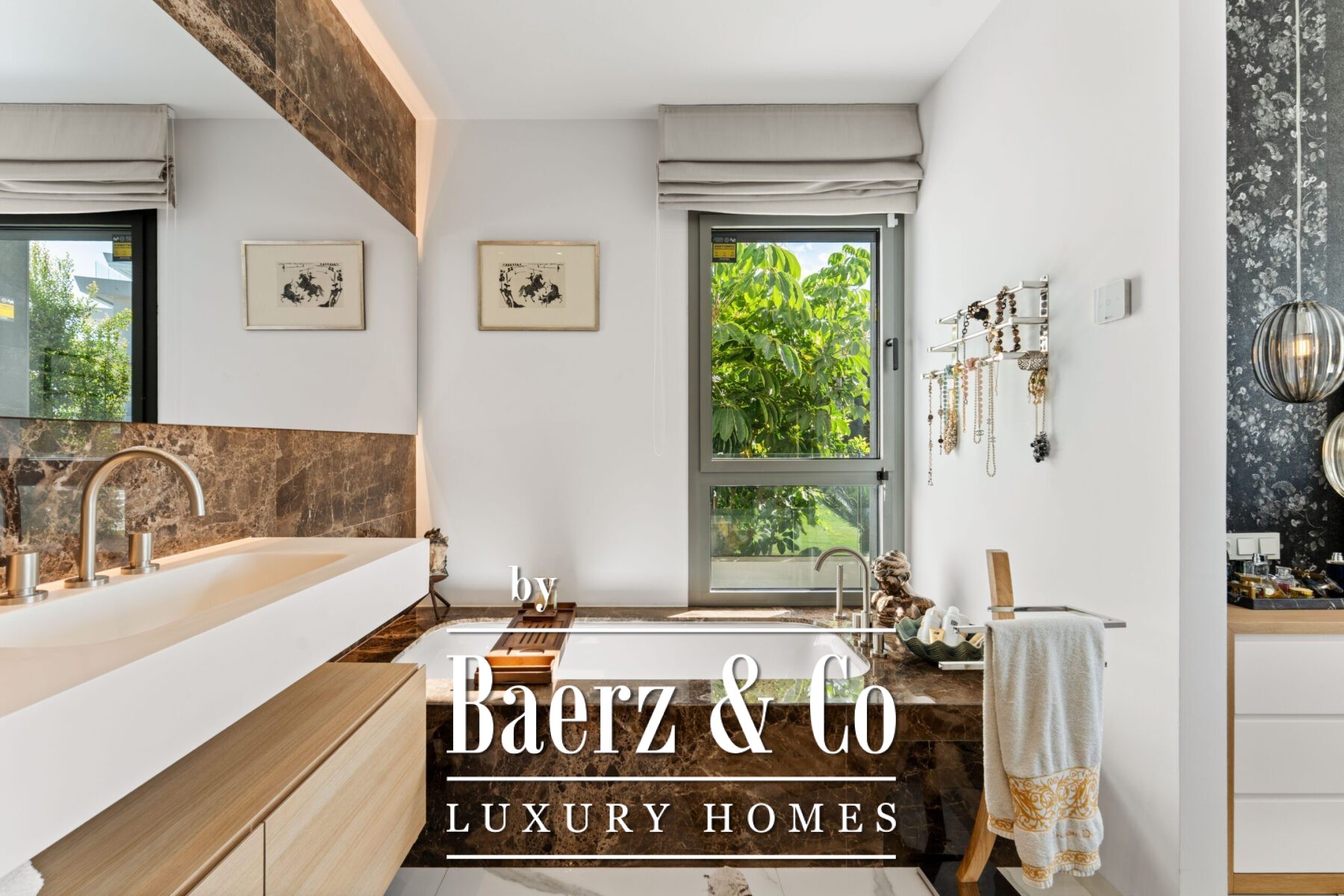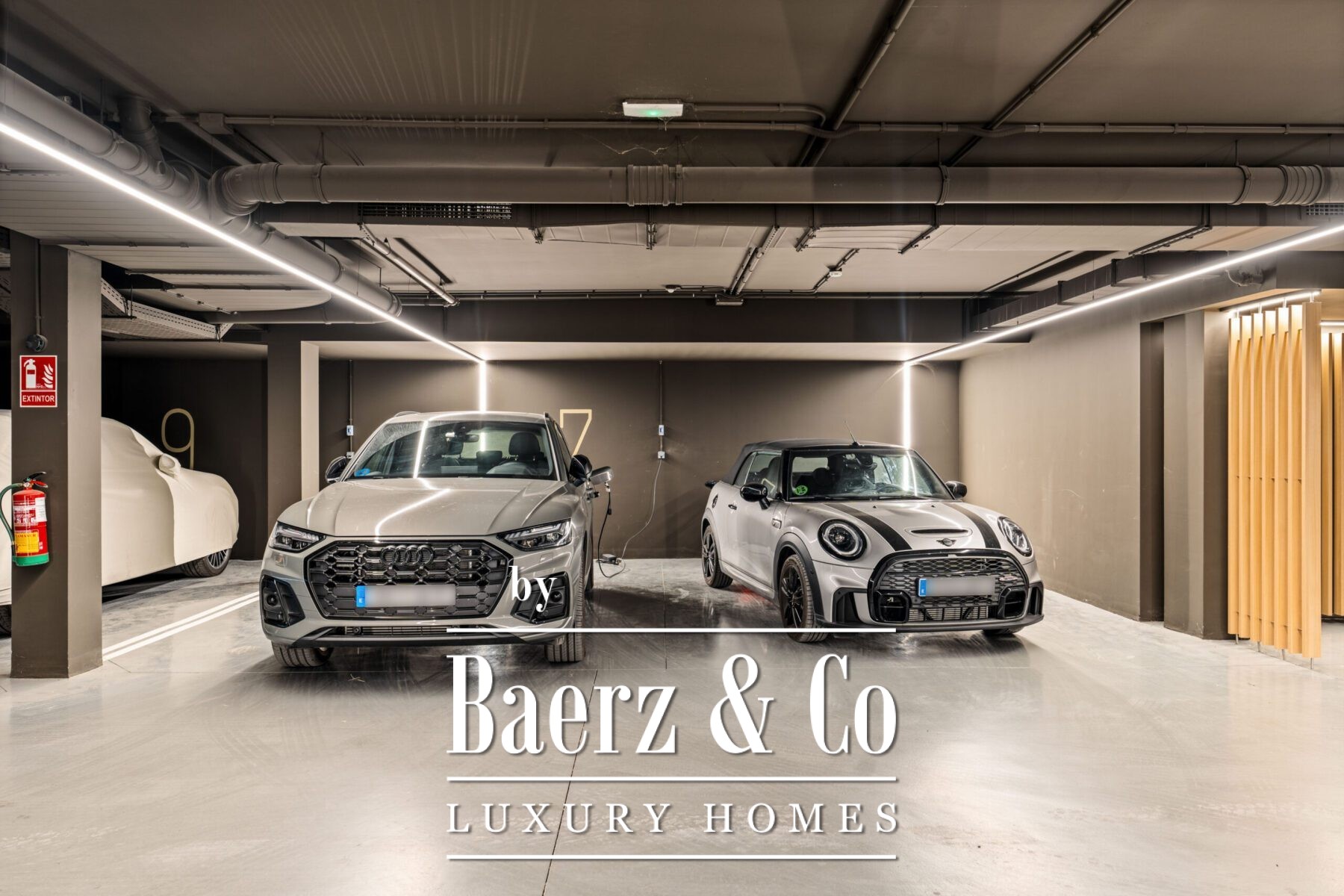 Binnen harmoniseren de open leefruimtes, eetkamer en keuken een moderne Scandinavische stijl met functionele verfijning. Kenmerken als plafondhoge deuren, Miele-apparatuur, stenen werkbladen, elektrische zonwering, vloerverwarming en een gastentoilet dragen bij aan een samenhangende en comfortabele sfeer. Twee ondergrondse parkeerplaatsen en een berging bieden praktische luxe.