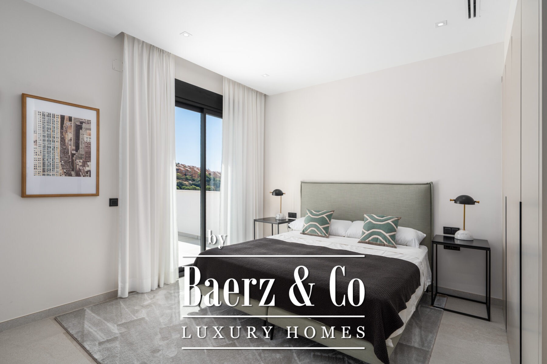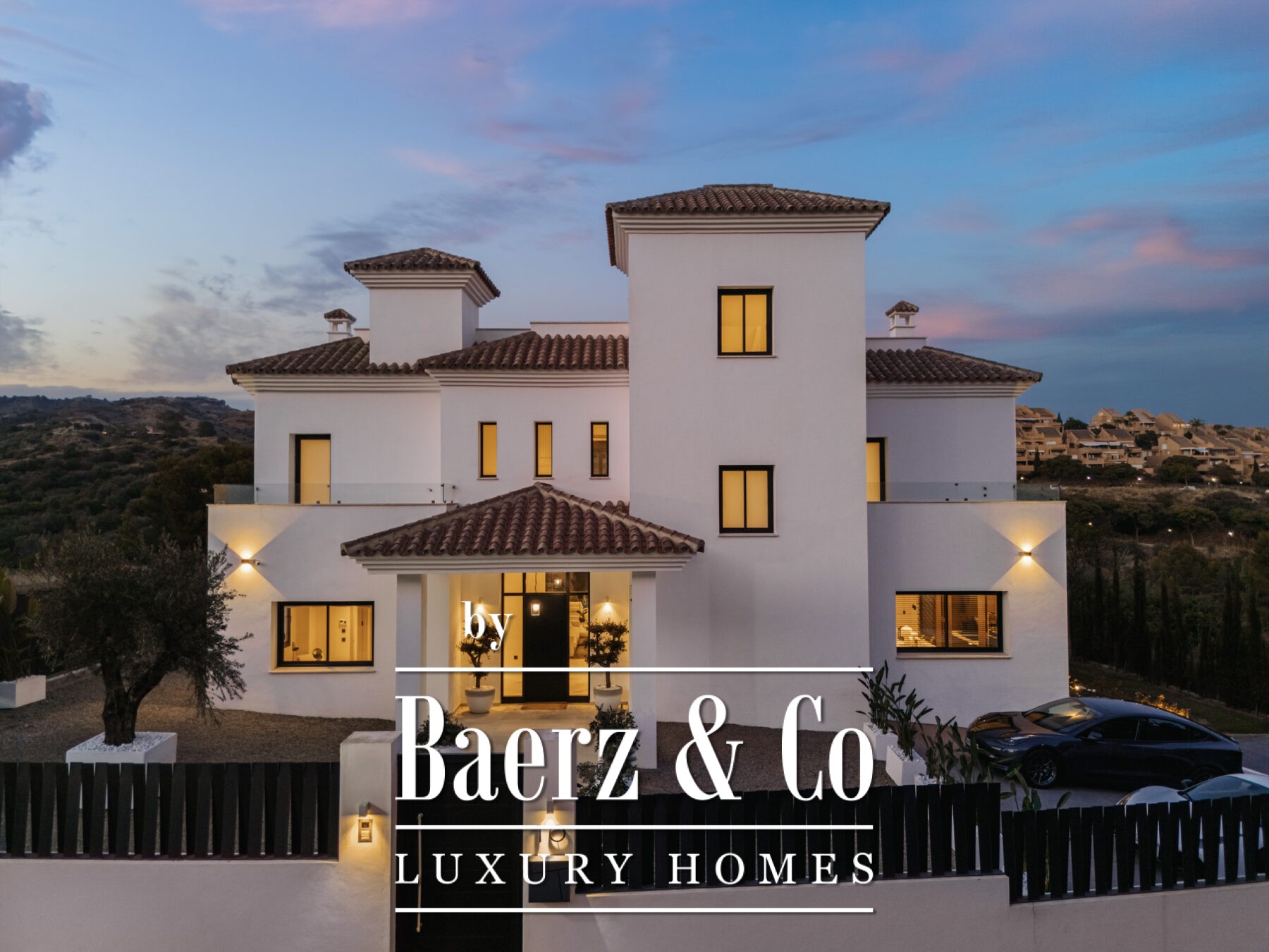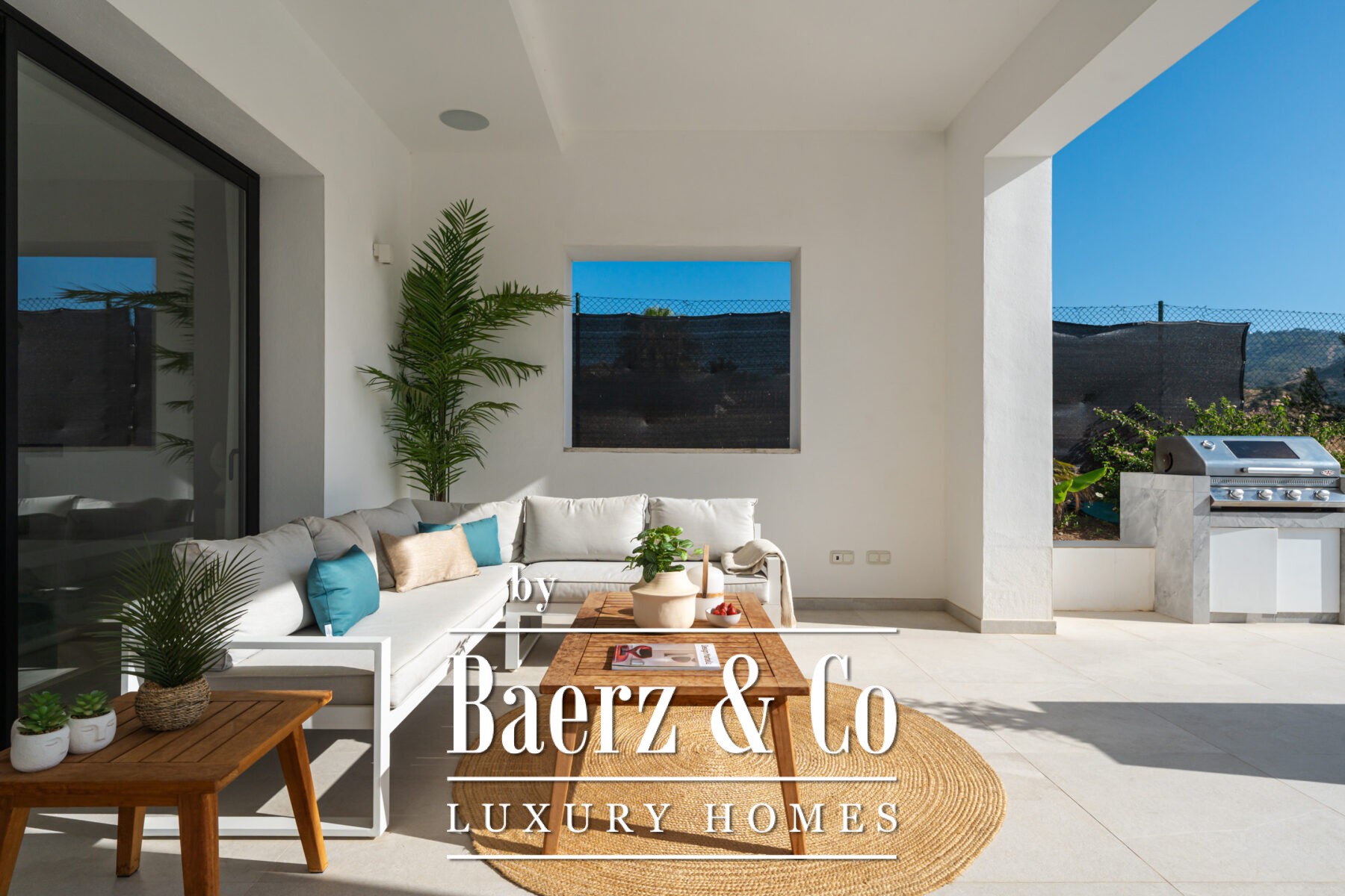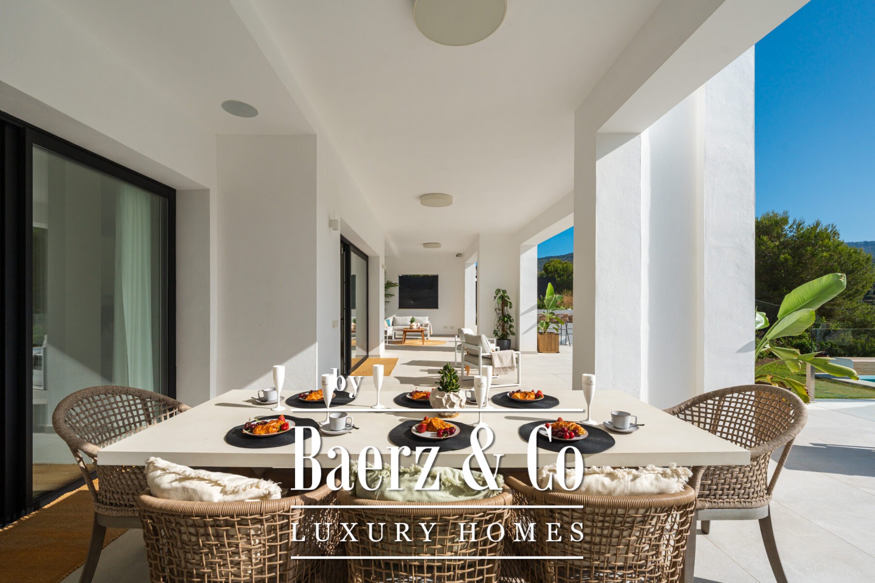 De architectuur van de residentie verenigt hedendaagse helderheid met warmte: keramische steen en houtafwerking zorgen voor een verfijnde sfeer. Miele-apparatuur, zonnepanelen, elektrische rolluiken en een geavanceerd irrigatiesysteem onderstrepen de duurzame details. Vanuit alle slaapkamers en leefruimtes openen terrassen naar het overdekte zwembad, de buitenbarbecue en de sauna, terwijl het panoramisch uitzicht op de golfbaan en de Middellandse Zee steeds het decor vormt.