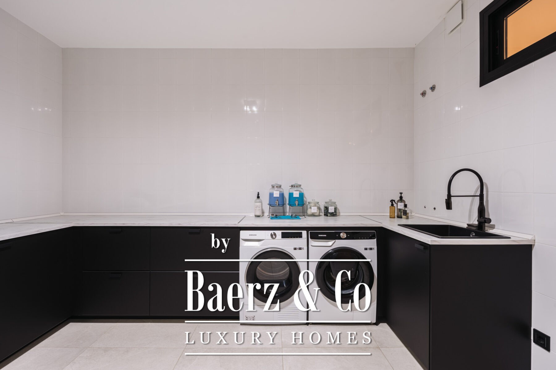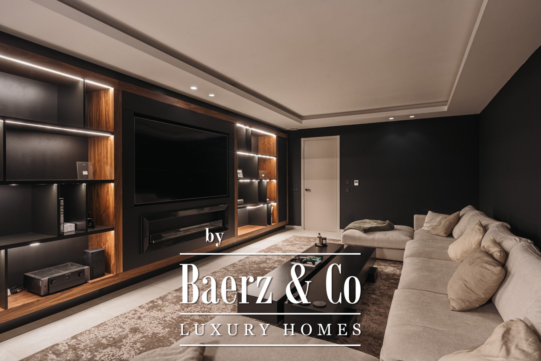 De begane grond beschikt over een uitgestrekt souterrain, ingericht met een garage voor drie auto’s, een berging en extra parkeergelegenheid, wat de veiligheid en het comfort vergroot. Een uitgebreid alarmsysteem, veiligheidsluiken en privétoegangen benadrukken de betrouwbare privacy.