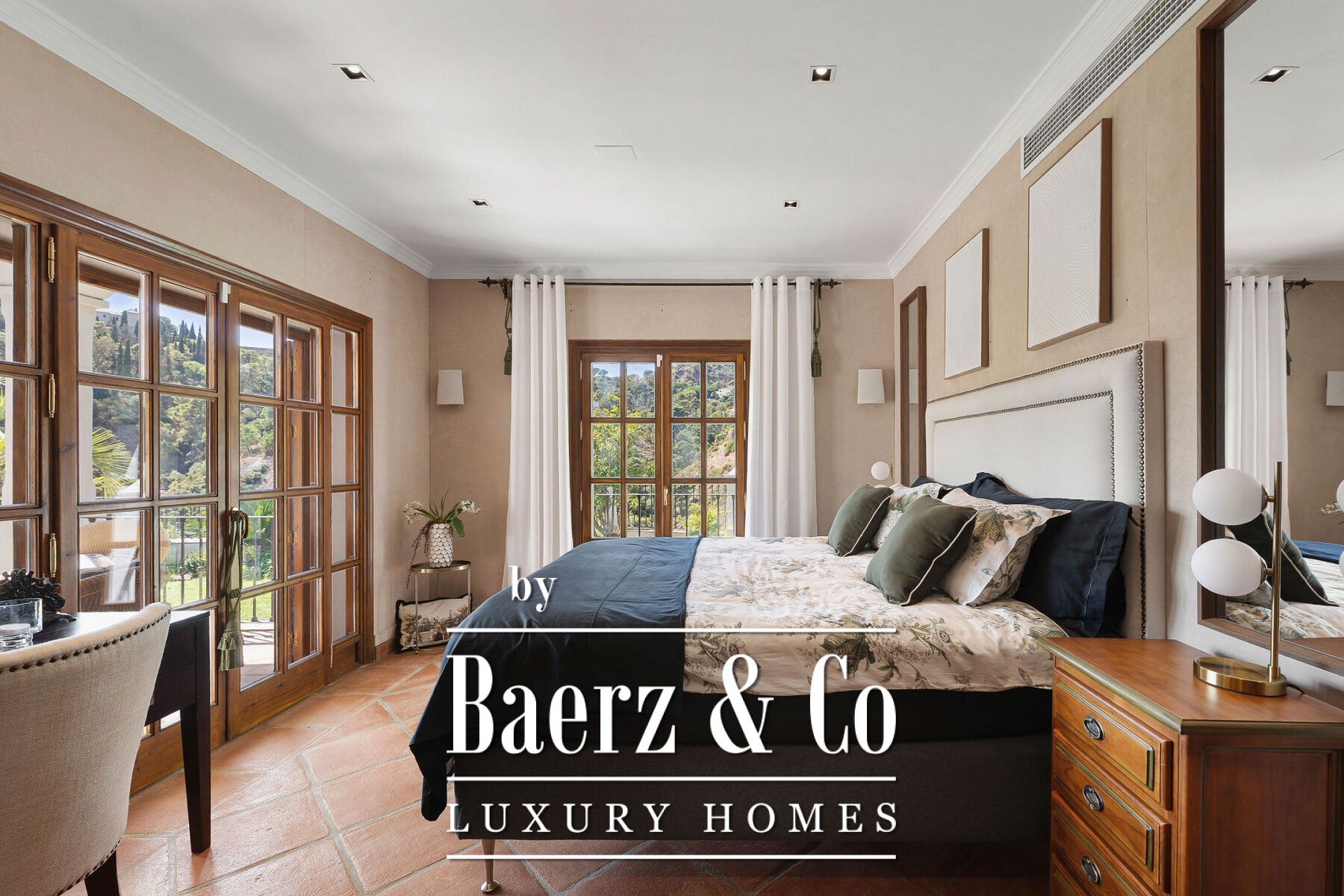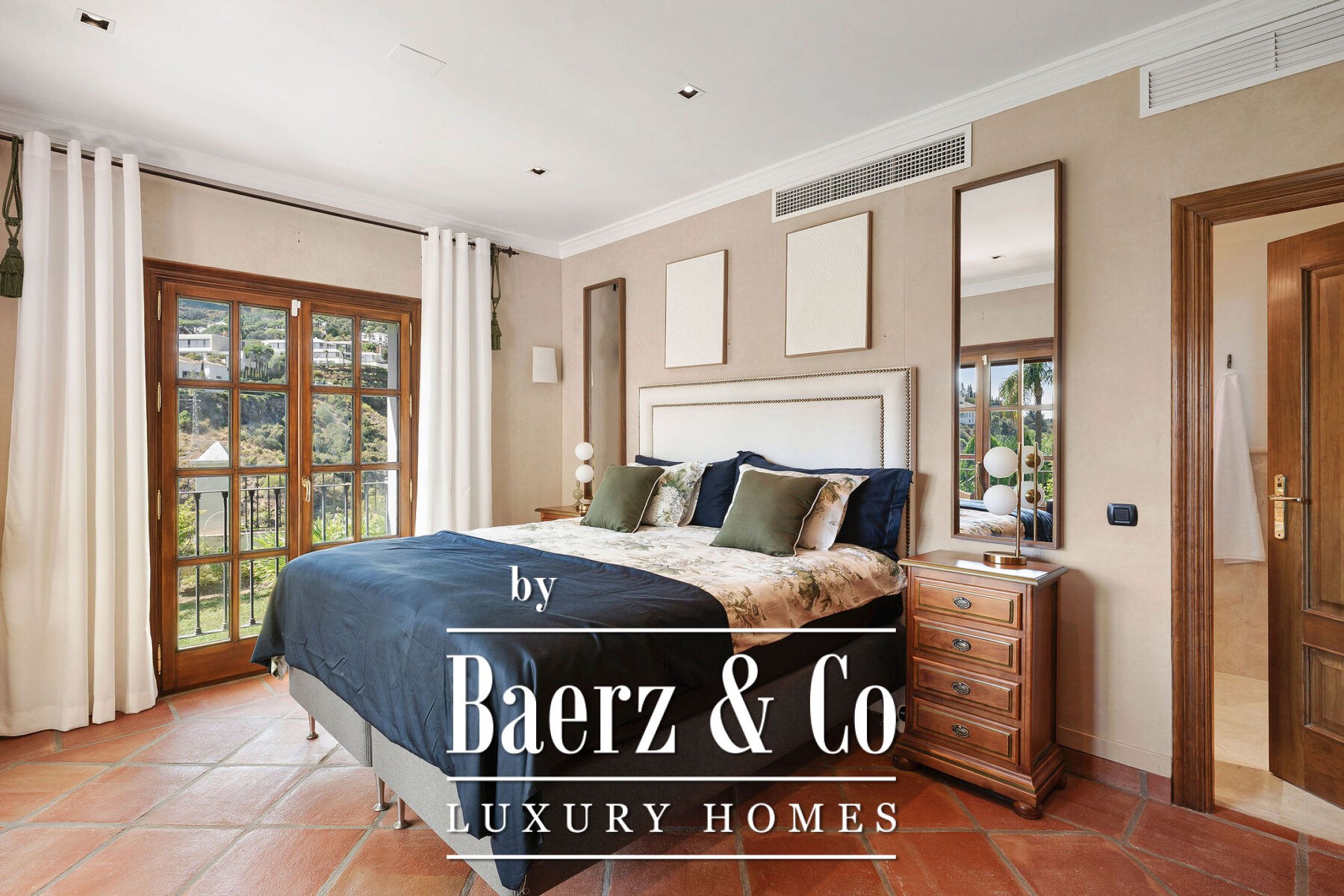 Buiten wordt de entree gemarkeerd door vijfentwintig volwassen palmbomen, omringd door volgroeide mediterrane tuinen met jacaranda’s, sinaasappel- en citroenbomen. Het privézwembad is naadloos geïntegreerd en nodigt uit tot zowel ontspanning als spektakel. Residenten genieten van volledige beveiliging, alarmsystemen en permanente bewaking binnen het afgesloten domein. De nabijheid van golfbanen, de voorzieningen van Marbella en de stranden van de Costa del Sol zorgen voor een moeiteloze verbinding tussen privacy en levensstijl. Deze villa is een toevluchtsoord én een blijvende investering, waarbij El Madroñal absolute discretie en een subliem uitzicht biedt.