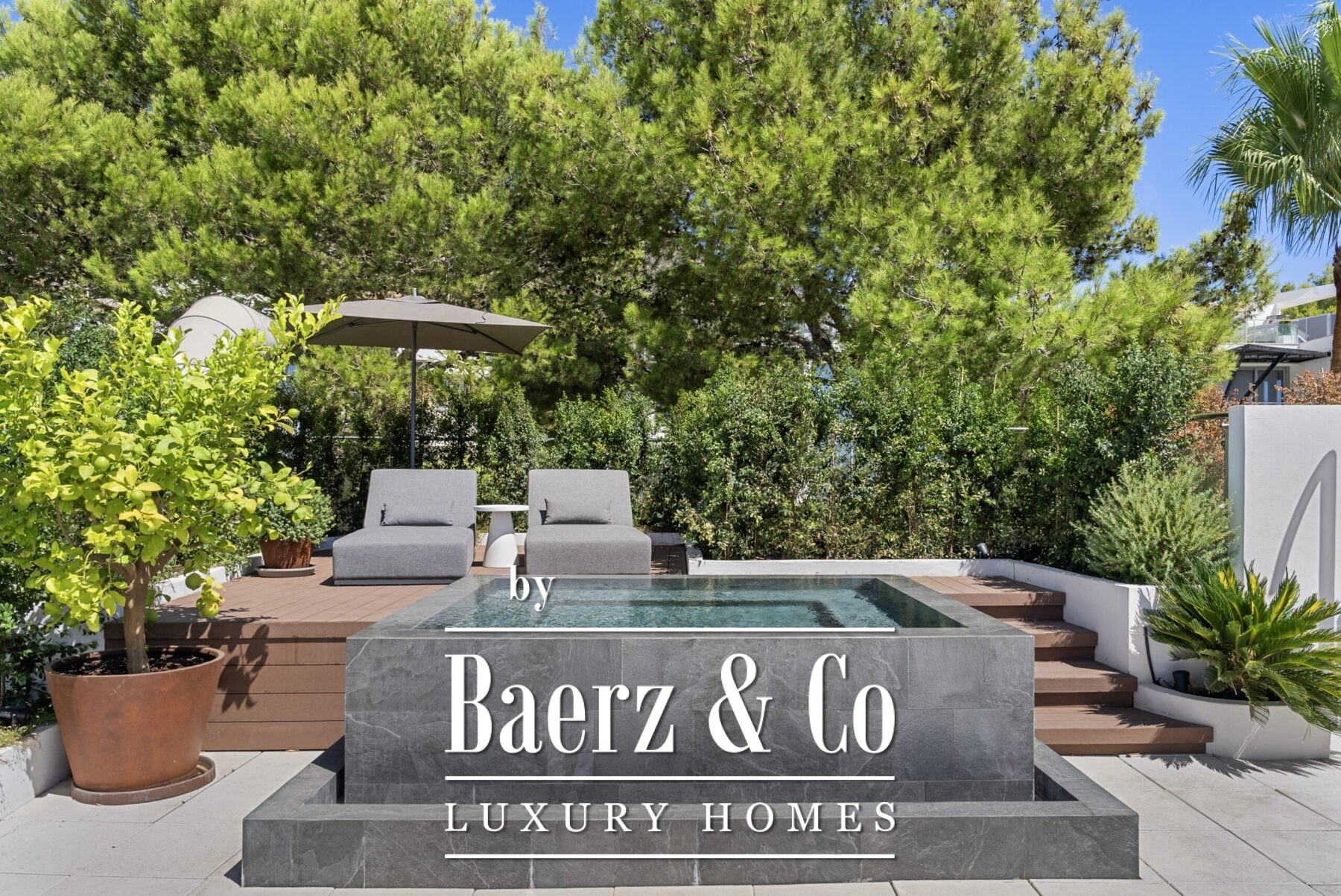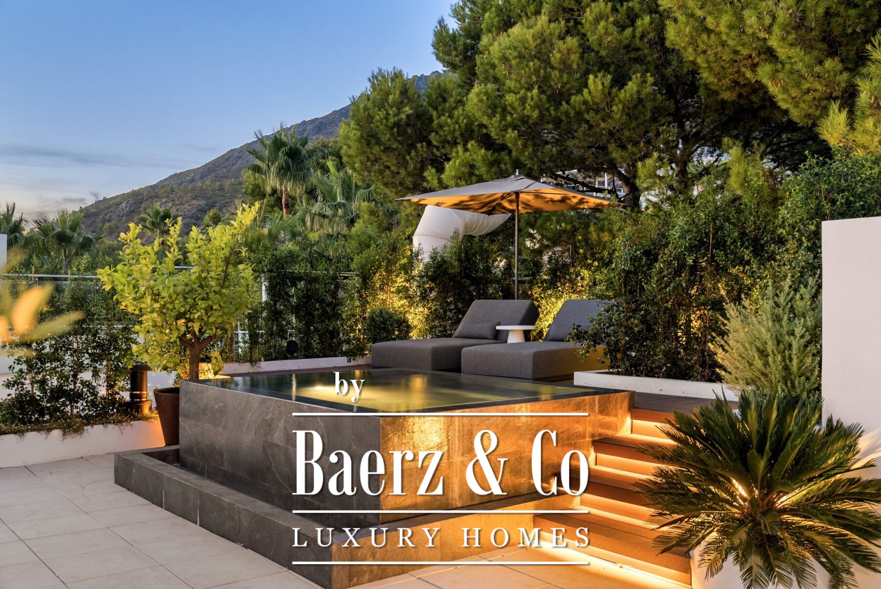 Een privé lift verbindt vier niveaus, wat dagelijks comfort harmonieus samen laat gaan met stijlvol vermaak. Het zuidelijk gelegen terras beschikt over een privézwembad, perfect om het hele jaar door te ontspannen onder de zon van Marbella. Op het dakterras biedt het solarium met jacuzzi en buitenkeuken een onbelemmerd uitzicht op de kustlijn en zonsondergang, als exclusief toevluchtsoord boven de stad.