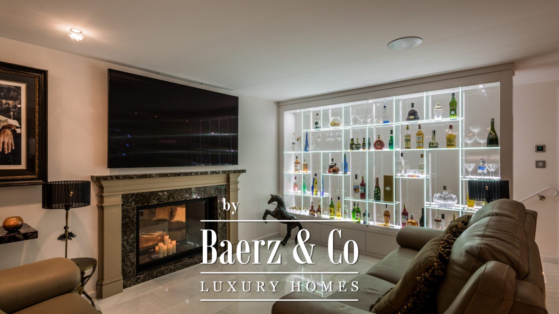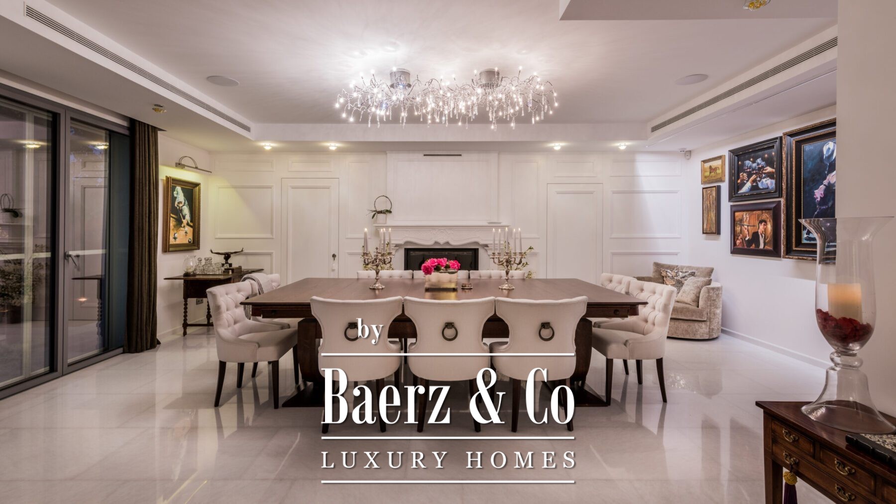 Het hoofdleefgedeelte ademt een verwelkomende sfeer, met een stijlvolle gebogen sofa, een moderne haard en zorgvuldig geselecteerde kunstwerken. De formele eetkamer, voorzien van een lange houten tafel, dubbele kroonluchters en een tweede haard, vormt het ideale decor voor stijlvol dineren. De keuken is uitgerust met taupe-kleurig maatwerk, donkerstenen werkbladen en een kookeiland. Aangrenzende eet- en loungehoeken met houten balken, een bar en directe verbinding met tuin, terrassen en het zwembad maken het plaatje compleet.