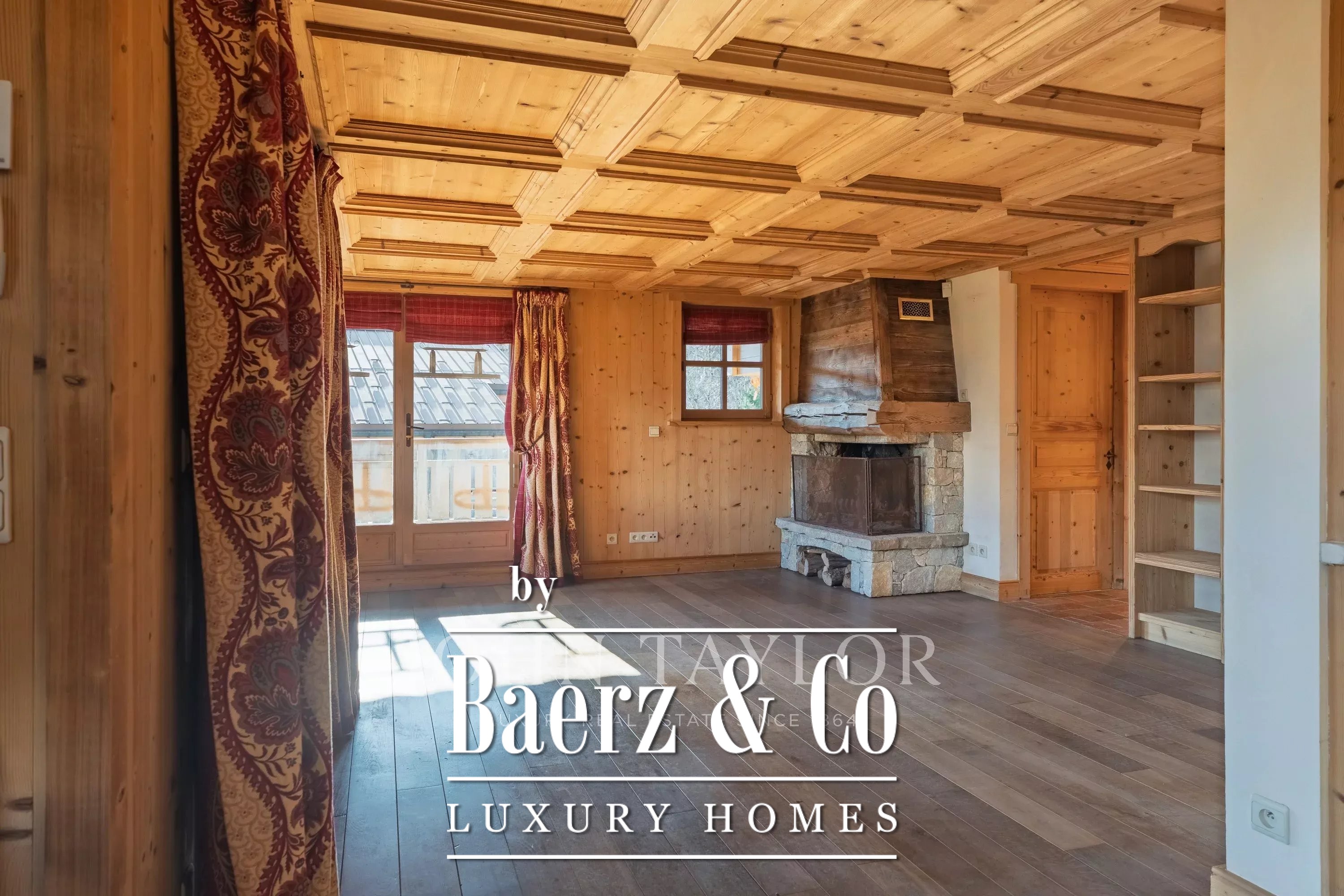 Appartement Megève biedt een verfijnde schuilplaats op slechts enkele stappen van het dorpshart. Met een woonoppervlakte van 85,30 m² bevindt dit eigendom zich op de eerste verdieping, gemakkelijk bereikbaar met de lift. De entree leidt naar een lichte keuken en een woonkamer met open haard. Grote ramen openen naar een ruim terras, dat een vrij uitzicht omlijst waarin licht en ruimte in stille harmonie samenkomen.