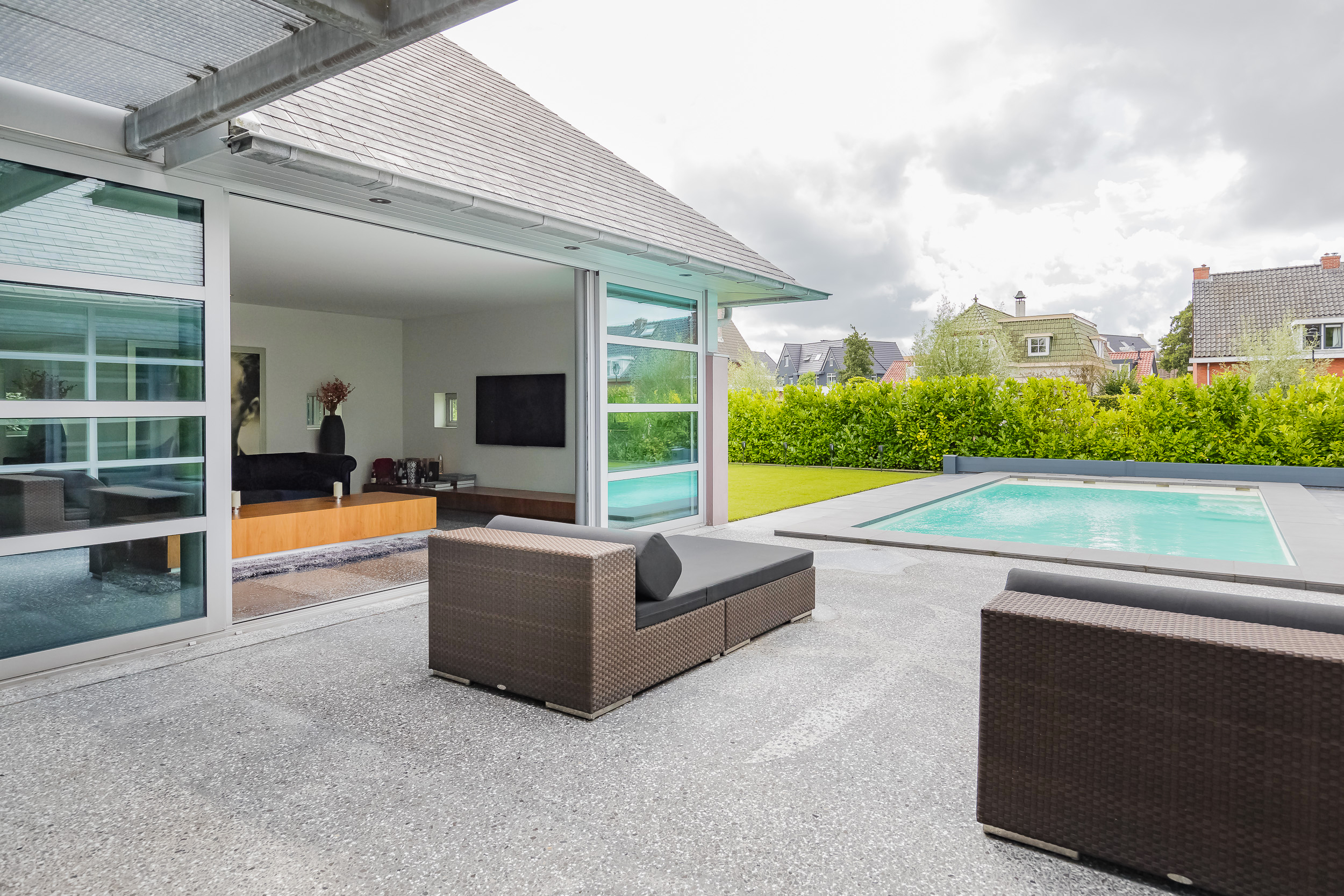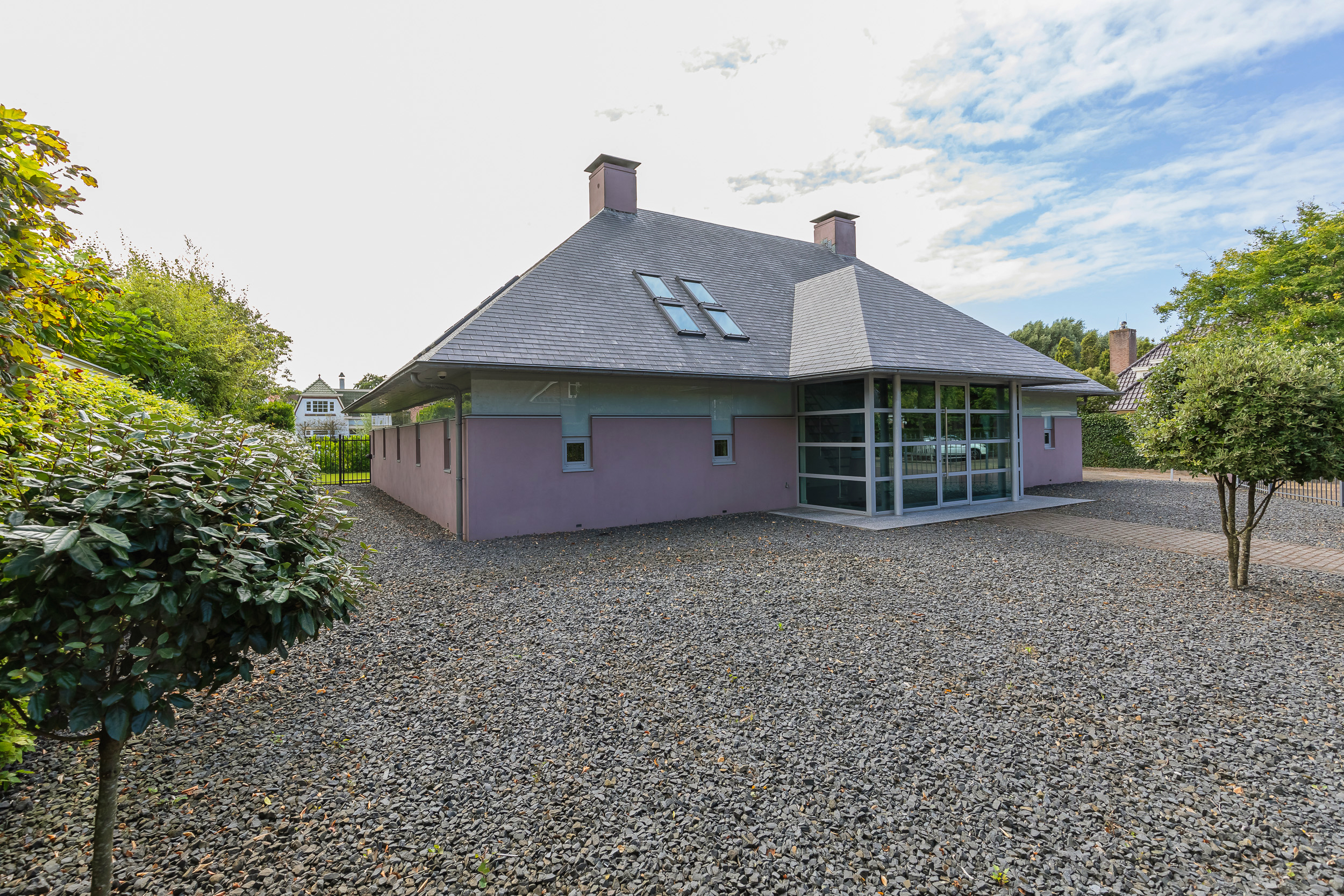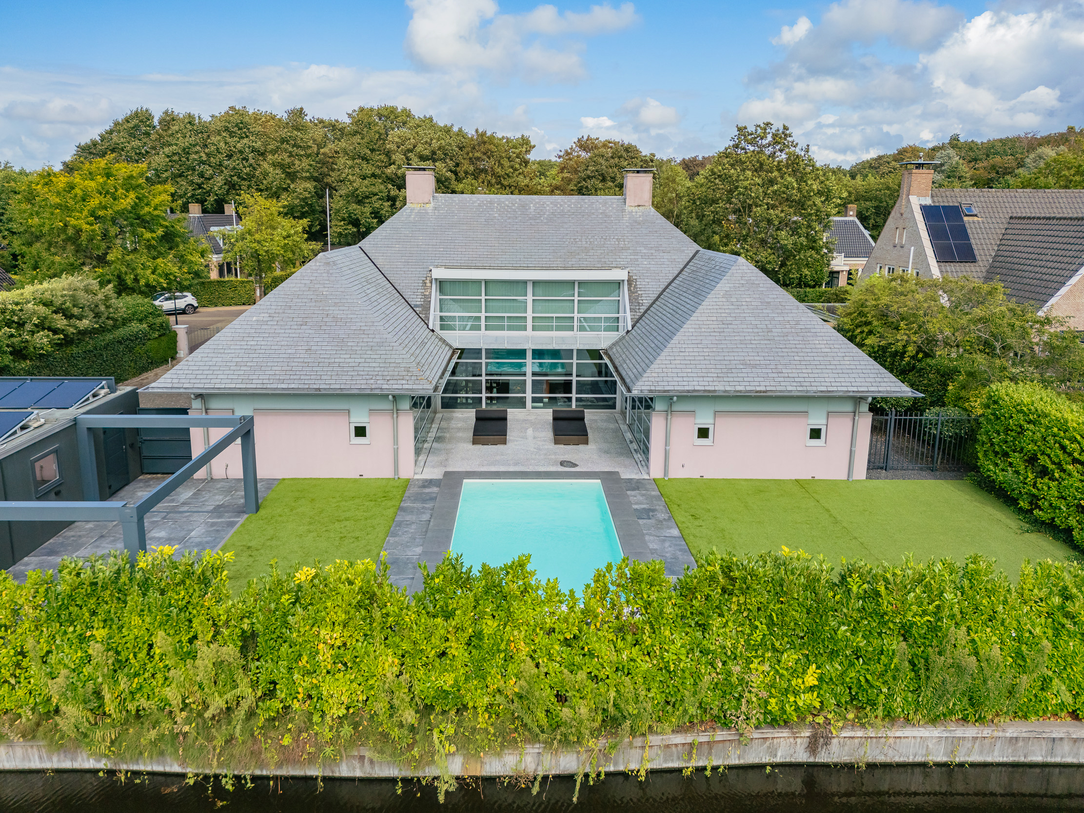 Er is een groot terras aan het huis en een zwembad. De grote groene haag zorgt voor rust en volledige privacy. Op het terrein is ruim parkeergelegenheid en het sierhek zorgt voor extra veiligheid.