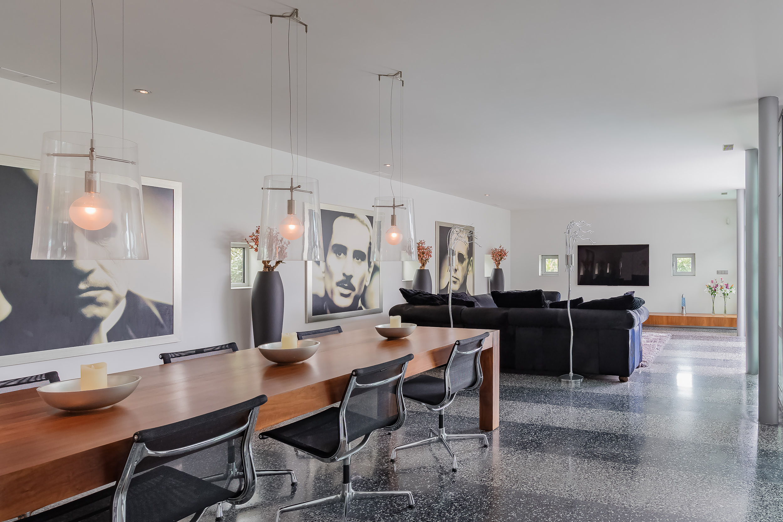 De grote woonkamer heeft een overspanning van wel 18 meter. Genoeg ruimte voor een royale zithoek en een grote eettafel voor gezellige diners.