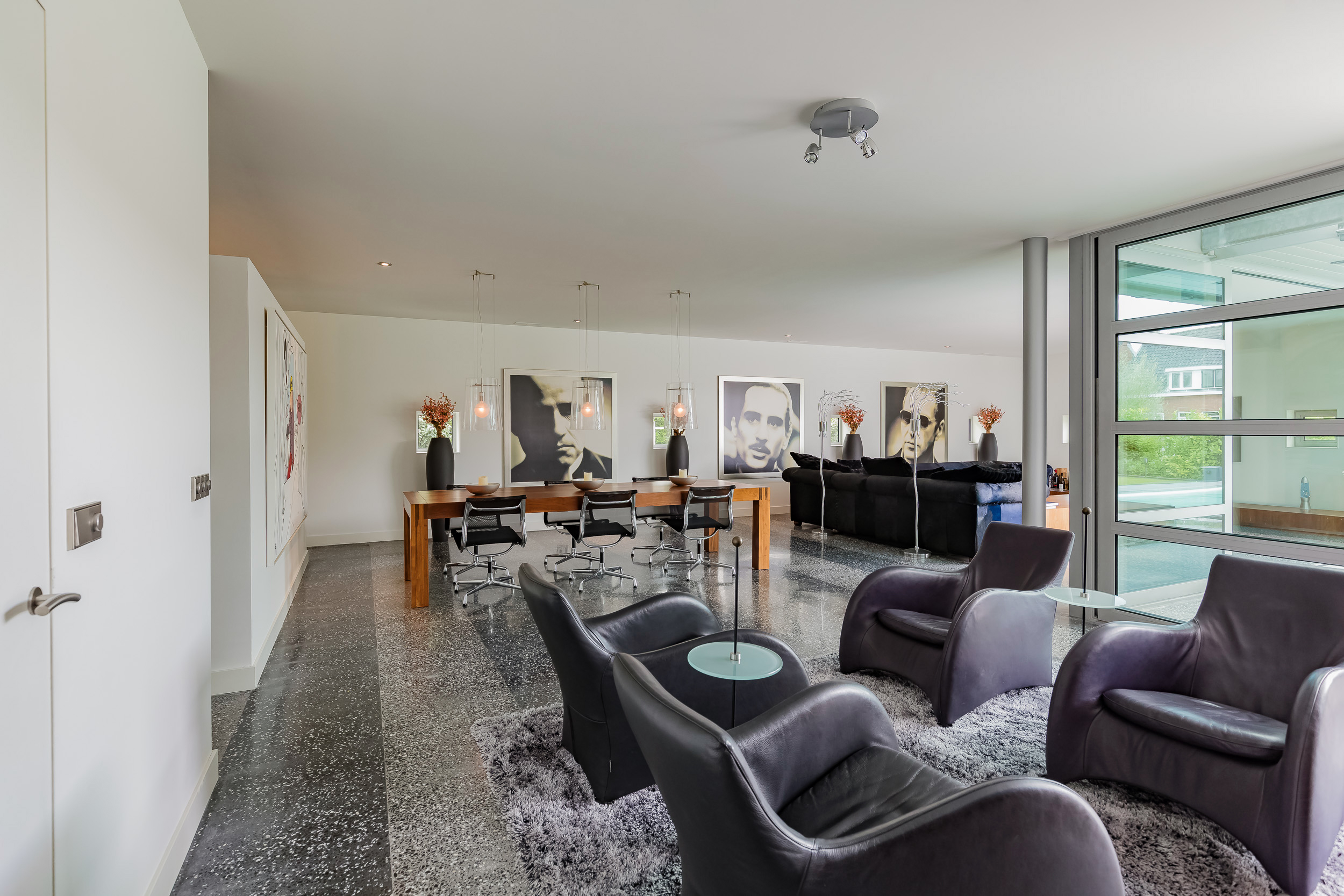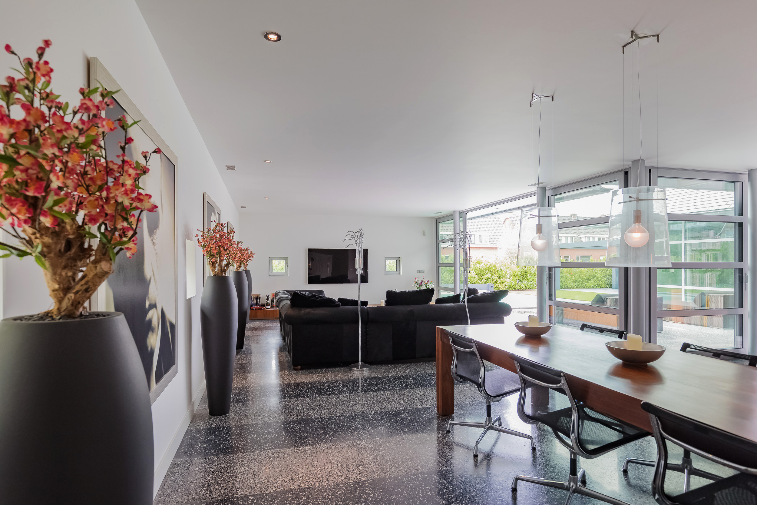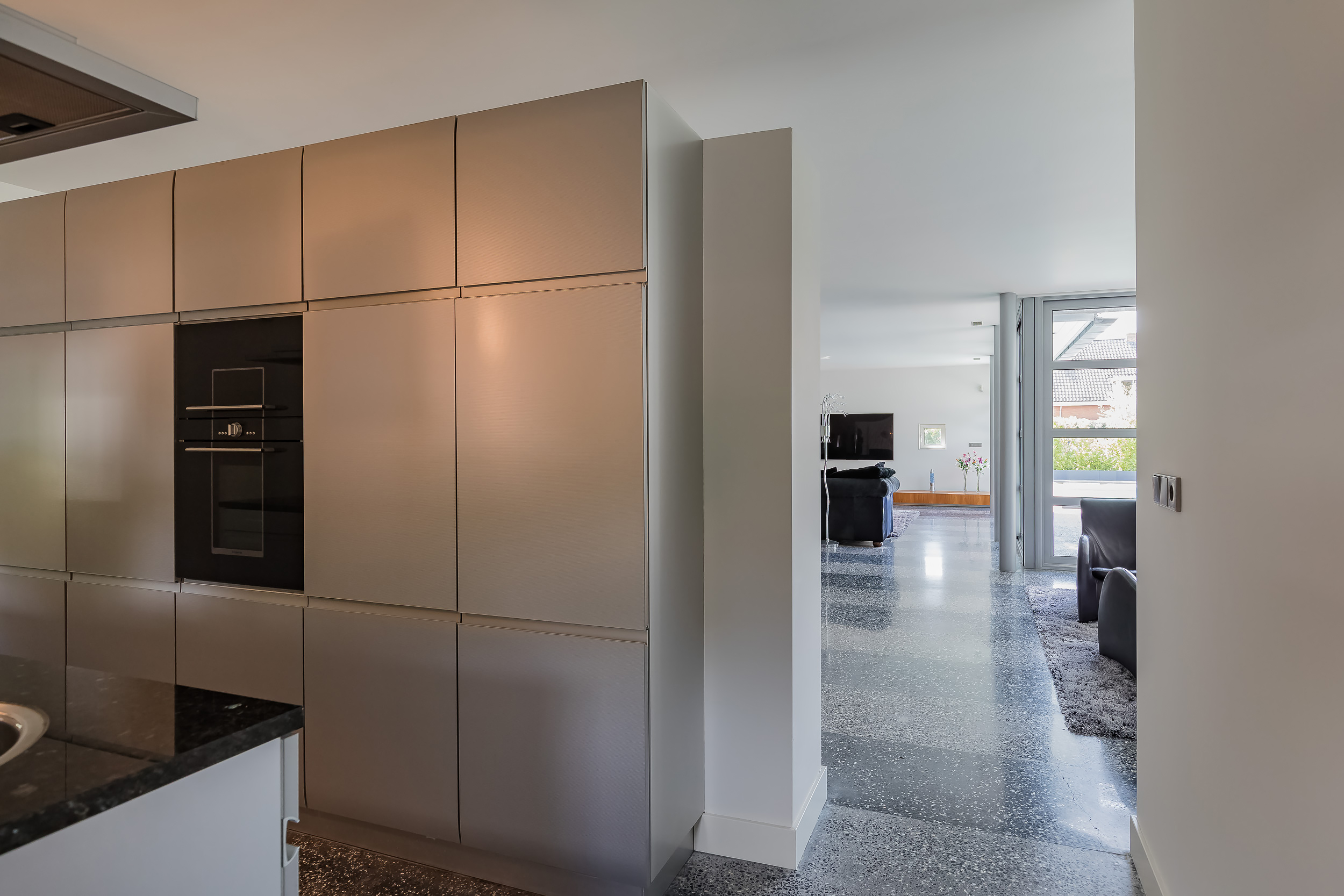 De gehele begane grond is voorzien van een terrazzovloer met vloerverwarming. Om de binnen/buiten beleving te versterken geven grote schuifpuien toegang tot de tuin en is de Terrazzovloer naar buiten doorgetrokken.
