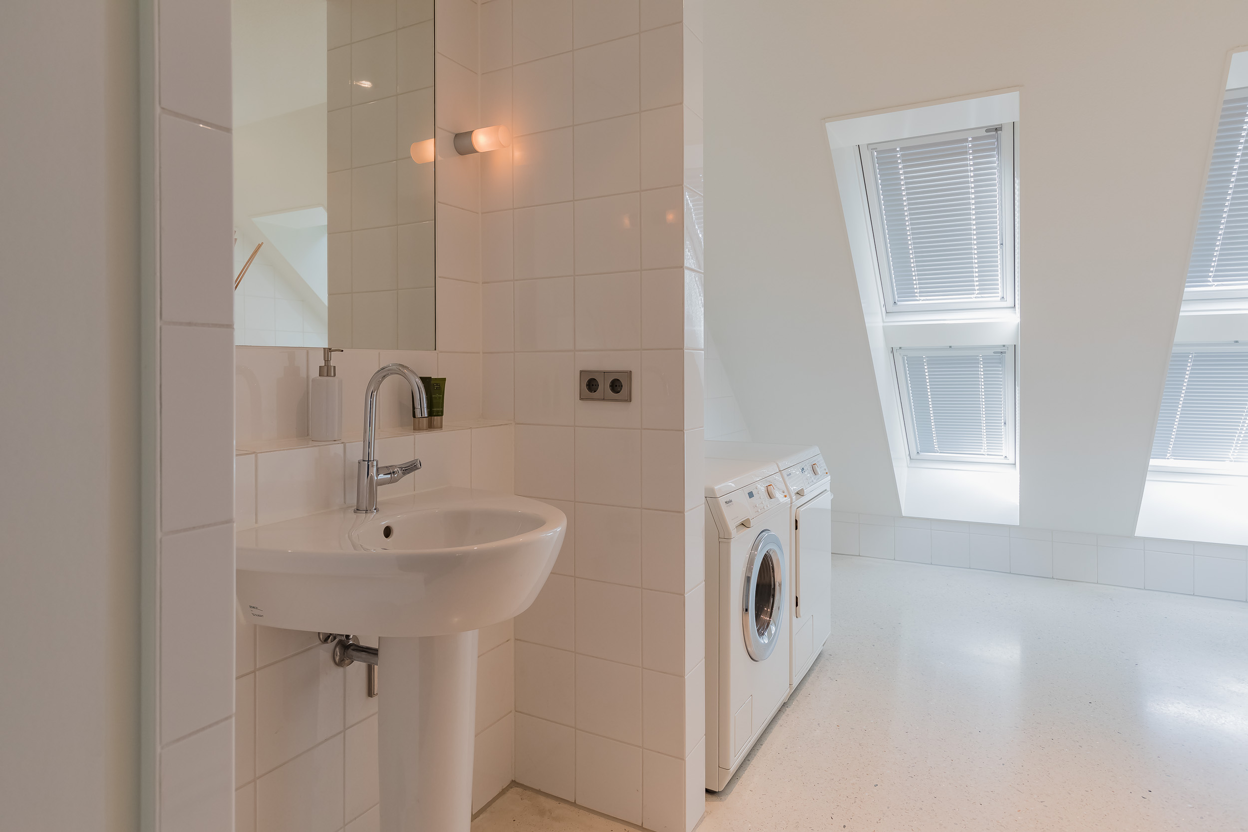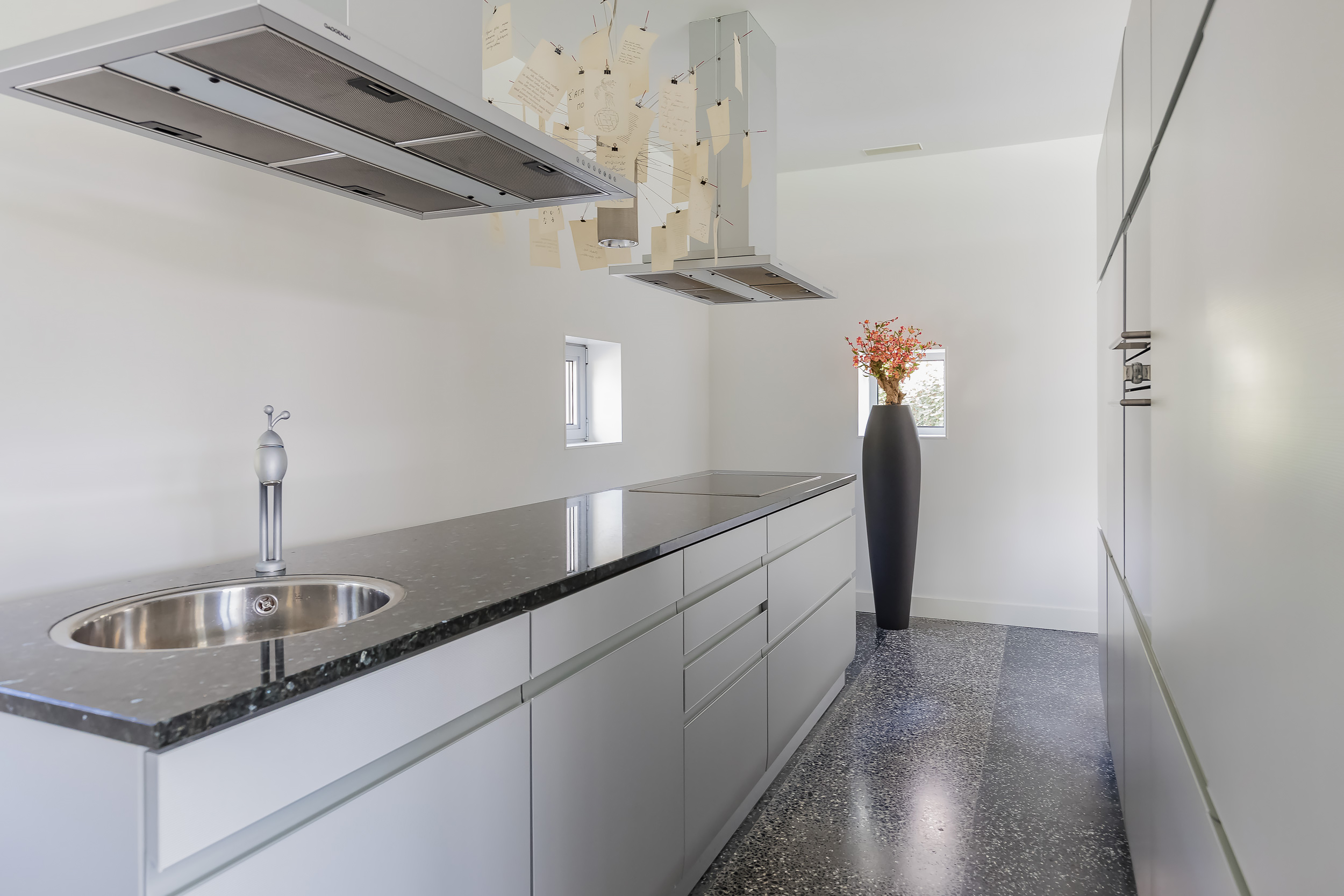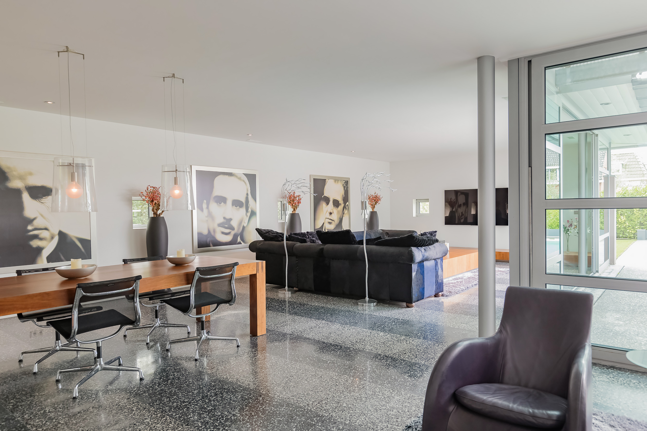 De gehele begane grond is voorzien van een terrazzovloer met vloerverwarming. Om de binnen/buiten beleving te versterken geven grote schuifpuien toegang tot de tuin en is de Terrazzovloer naar buiten doorgetrokken.