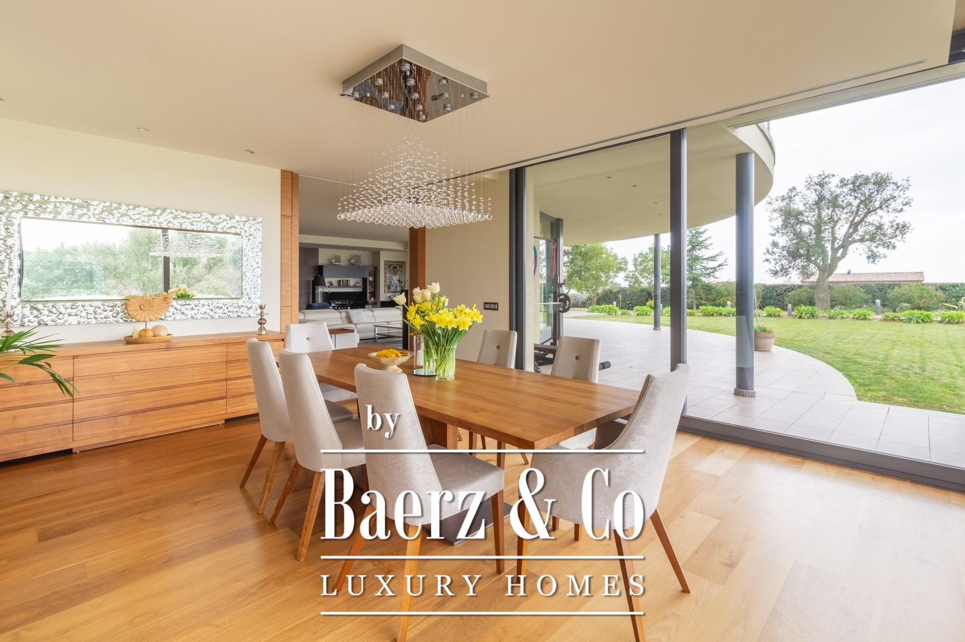 Deze luxe villa in Peralada bevindt zich in het historische hart van de Empordà, discreet gelegen op een perceel van 2.505 m² en biedt 821 m² verfijnde leefruimte. De architectuur ontvouwt zich over drie zorgvuldig afgewerkte verdiepingen, elk afgestemd op comfort en duurzame kwaliteit.