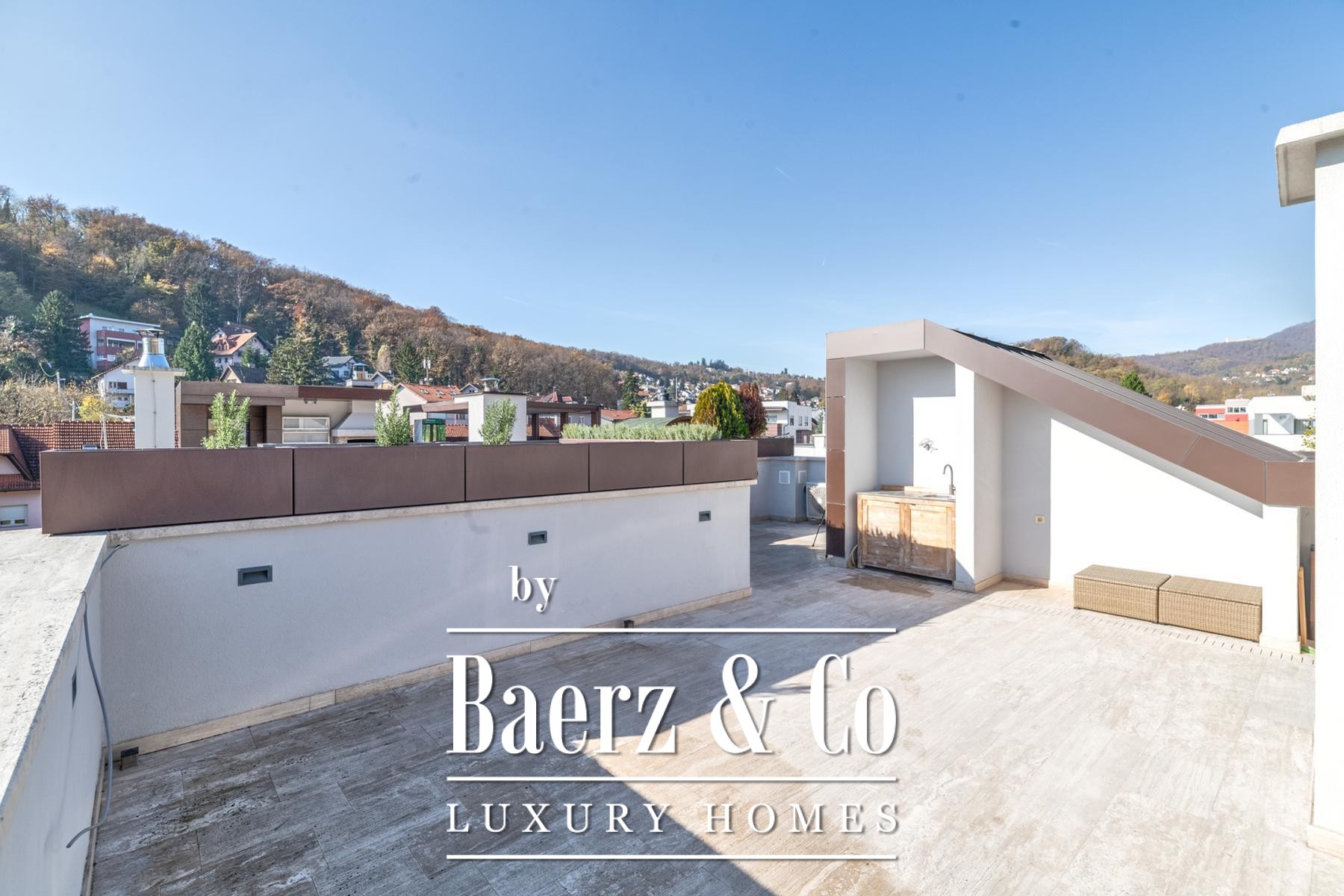 Een overdekt dakterras van 47 m², airconditioning in alle hoofdvertrekken, centrale verwarming op gas en vloerverwarming in de keuken en badkamers verhogen het wooncomfort. Vrije uitzichten op Sljeme en Medvednica versterken het gevoel van serene afzondering. Er zijn drie eigen buitenparkeerplaatsen aanwezig. In de directe omgeving biedt het knooppunt Mihaljevec toegang tot tram- en busverbindingen en is er een uitstekende bereikbaarheid naar scholen, winkels en het centrale Bana Jelačićplein van Zagreb.