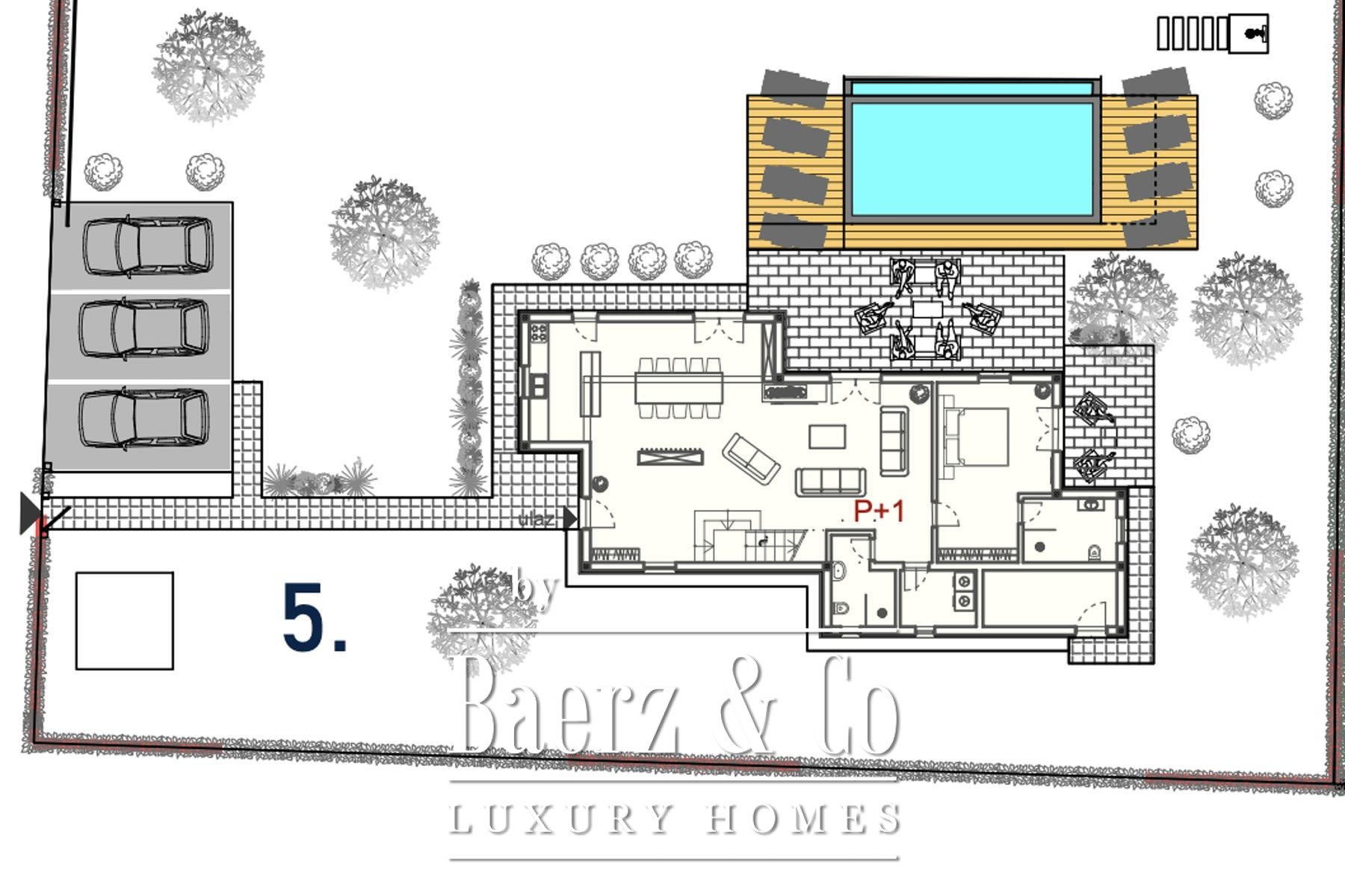 Op de verdieping bieden drie royale slaapkamers elk een eigen, discreet en suite badkamer voor optimale rust en privacy. Functionaliteit en ingetogen innovatie komen samen dankzij zwembadverwarming, voorbereiding op zonne-energie en twee overdekte parkeerplaatsen.
