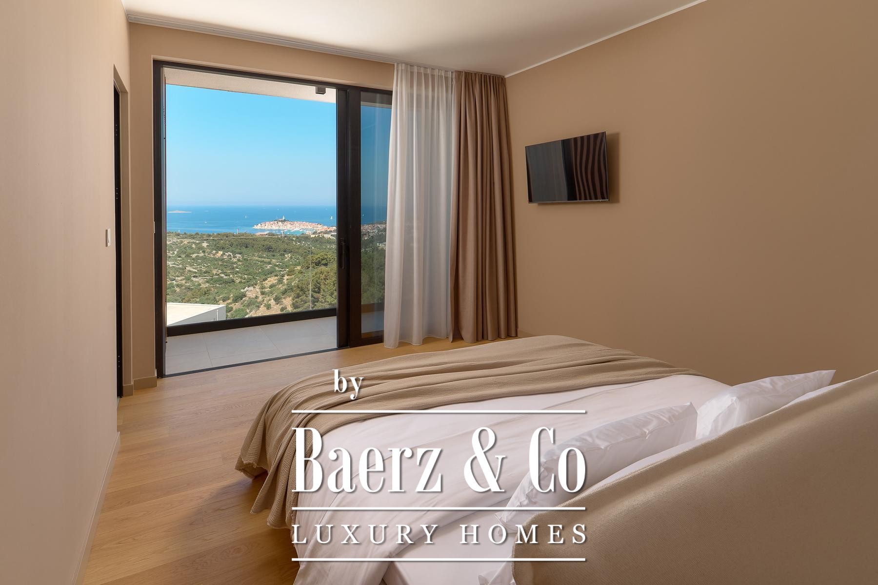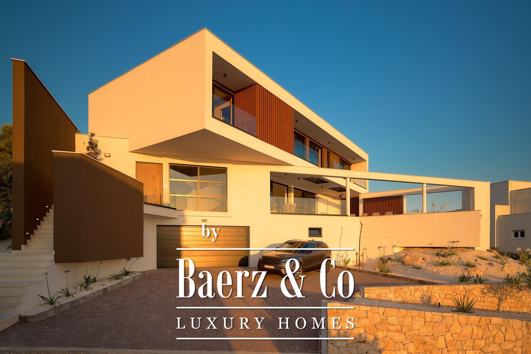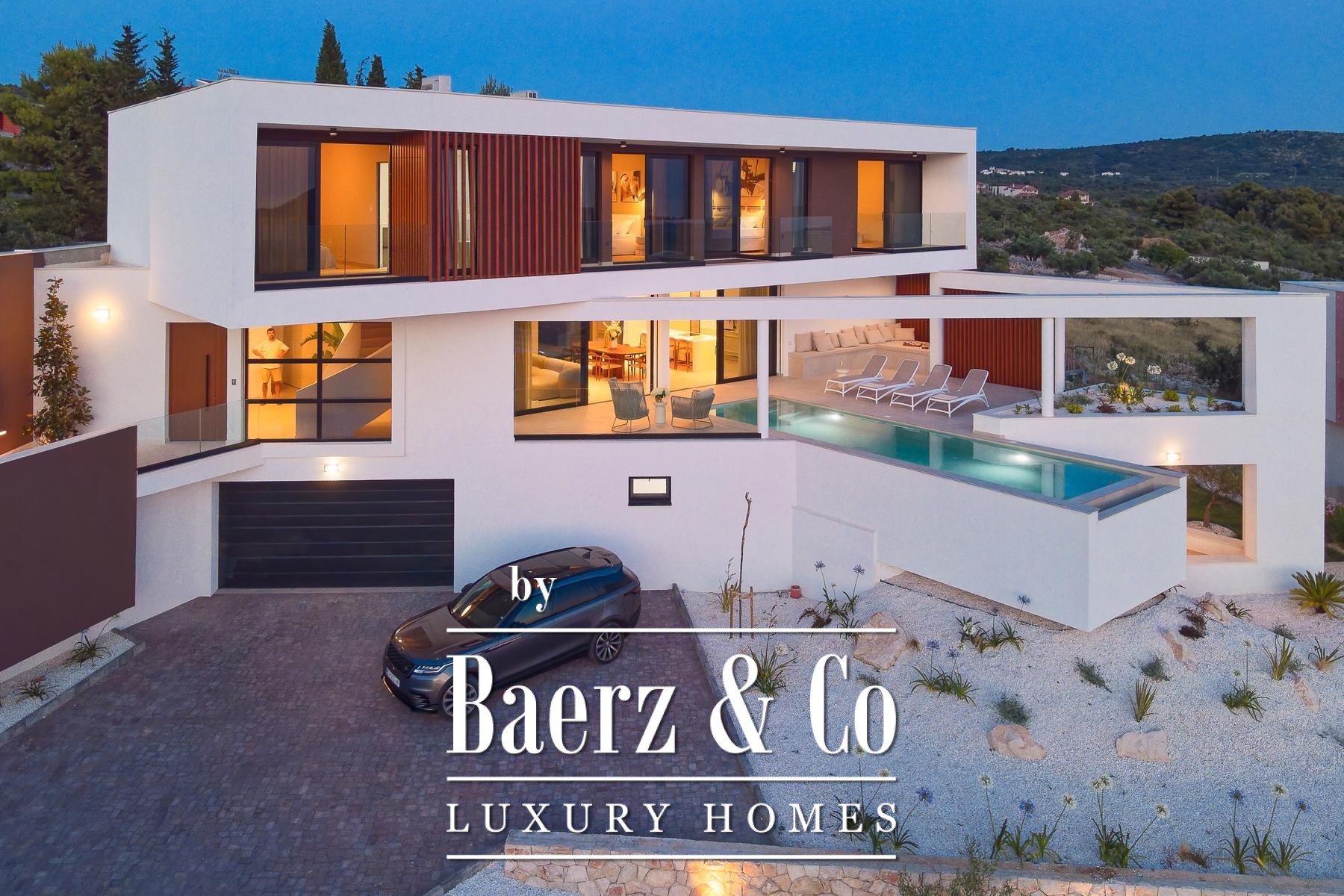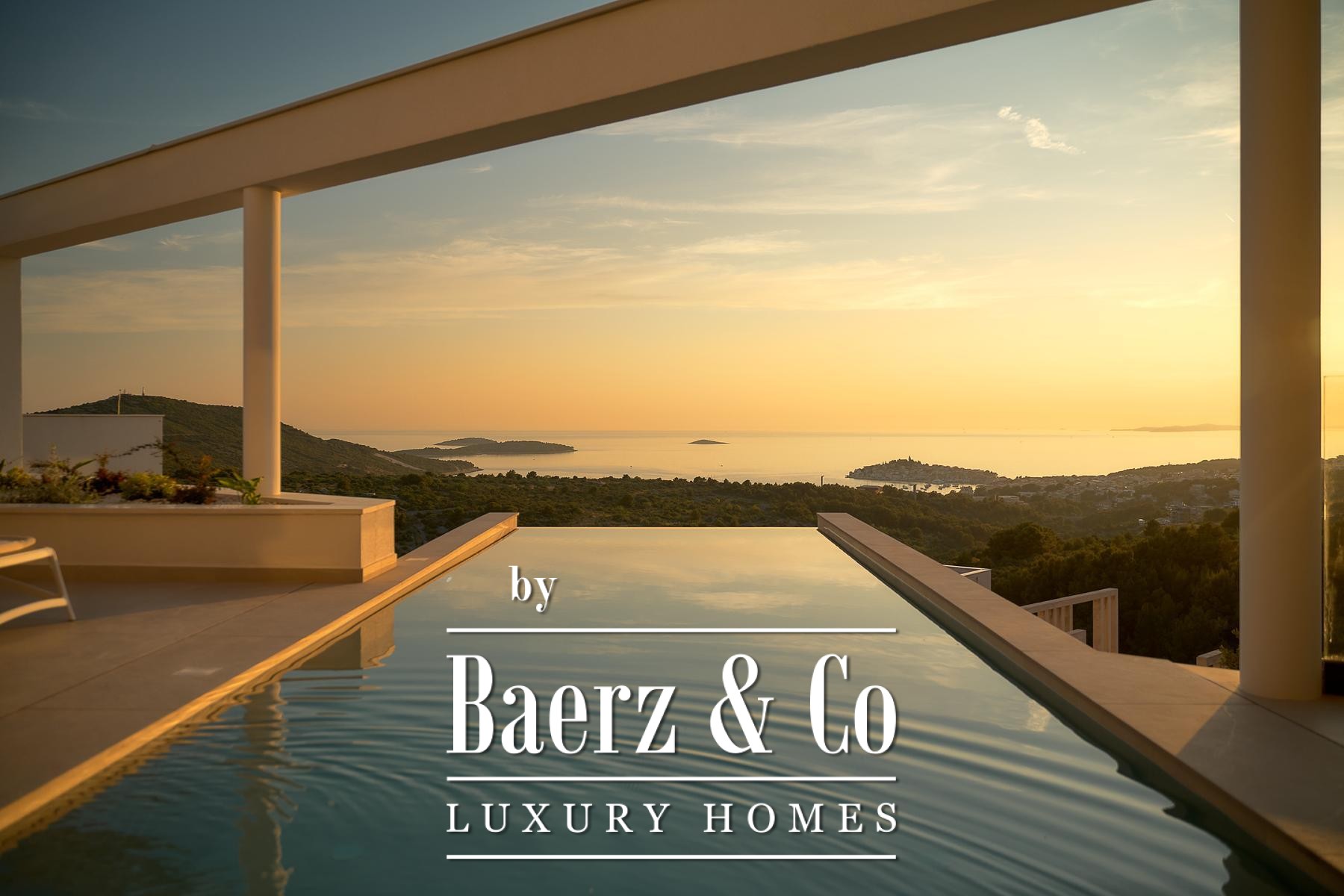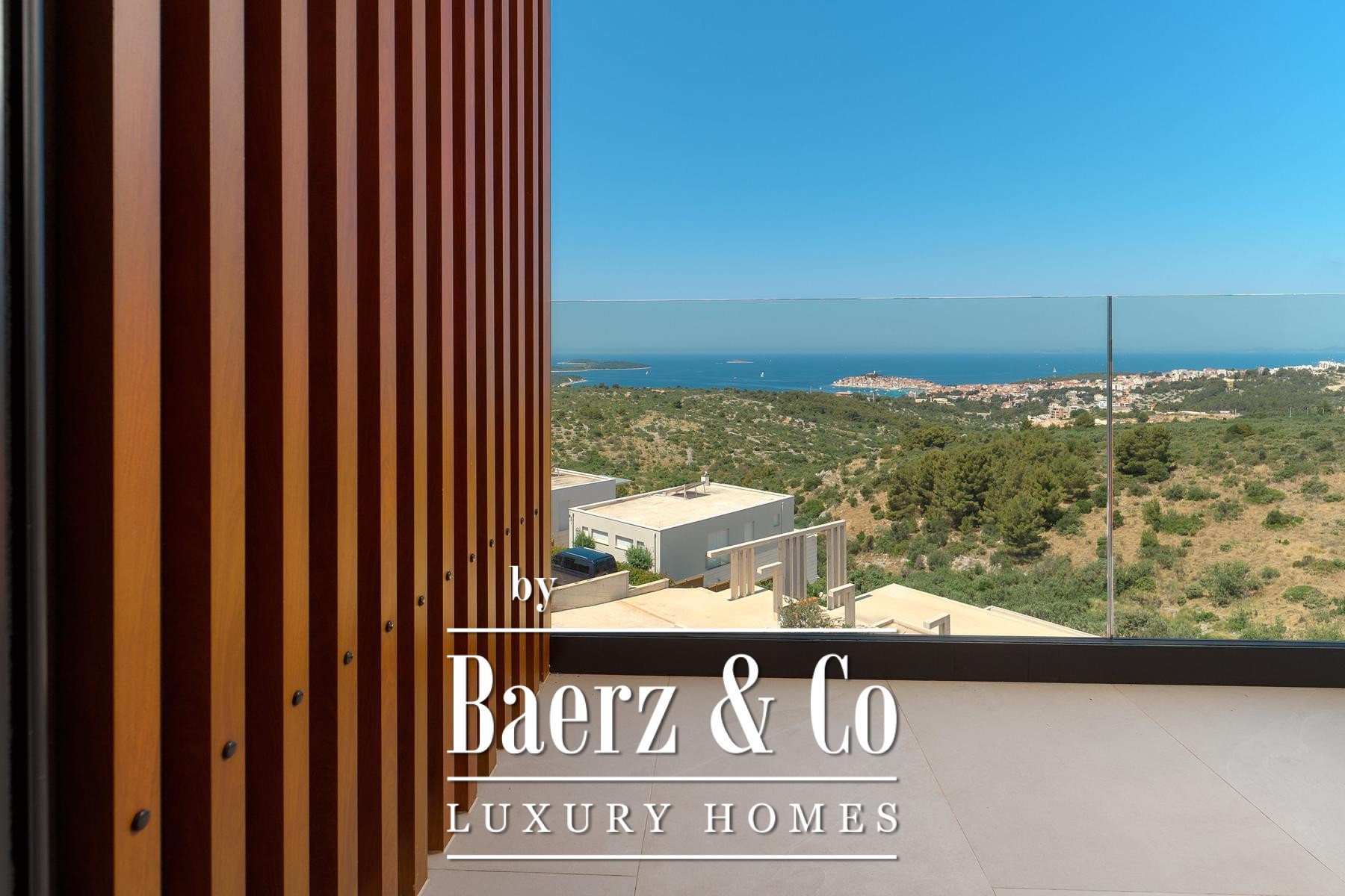 We present an exclusive, architecturally impressive villa with an infinity pool and panoramic sea views, with a total area of 559.97 m².The closed area of the villa is 379.58 m², spread over three floors, designed for maximum comfort and privacy.In the basement there is a spacious garage with two parking spaces, as well as additional functional spaces - a machine room, a storage room and a boiler room. On the same floor there is also a separate studio apartment with its own terrace, ideal for guests or staff.An internal staircase leads to the ground floor, which opens into a luxurious living area - a spacious living room connected to the dining room and a modern kitchen, with an additional storage room and a guest toilet. Large glass walls allow plenty of natural light and direct access to large terraces: one has a spectacular infinity pool with a sunbathing area, while the other is equipped with a summer kitchen and barbecue - perfect for socializing and relaxing.Upstairs there are four elegant bedrooms, each with a private bathroom and access to a balcony overlooking the sea, which provides a feeling of exclusivity and complete peace.The villa was built with an emphasis on top-quality materials, contemporary architecture and advanced smart management systems, in order to provide the highest level of functionality, security and aesthetics.This home provides an exceptional level of privacy, comfort and prestige, and is designed to meet the most demanding criteria of modern living. Located in an environment of untouched nature, surrounded by olive groves and vineyards, the villa offers complete peace, while at the same time being only a few minutes walk from the center of Primošten.For additional information or to arrange a viewing, we are happy to assist you.
