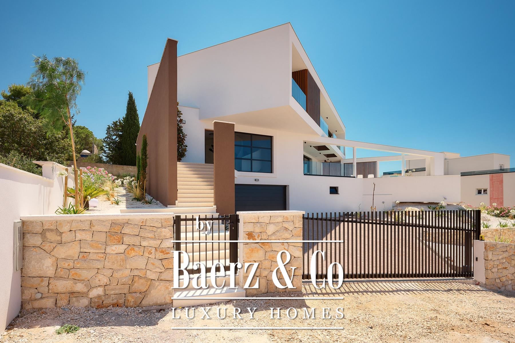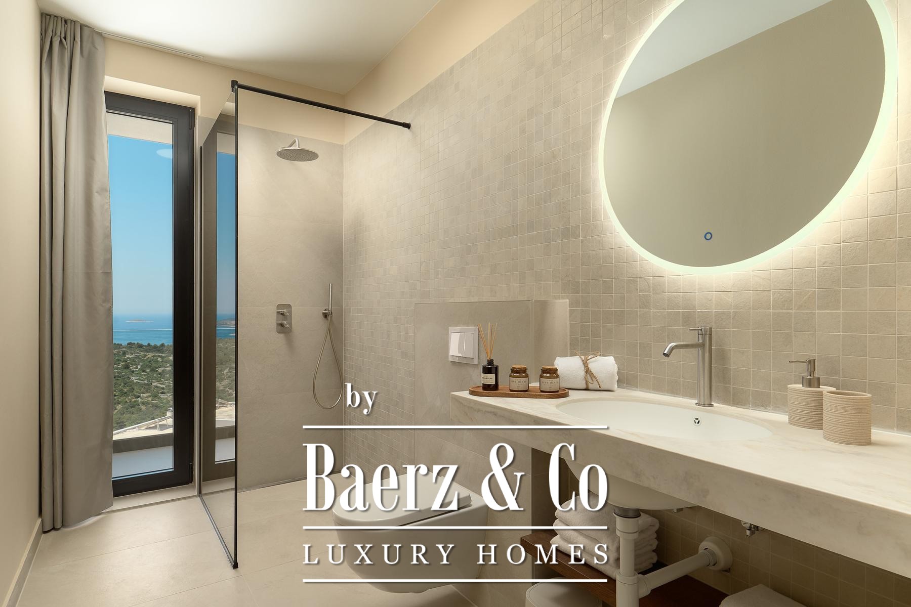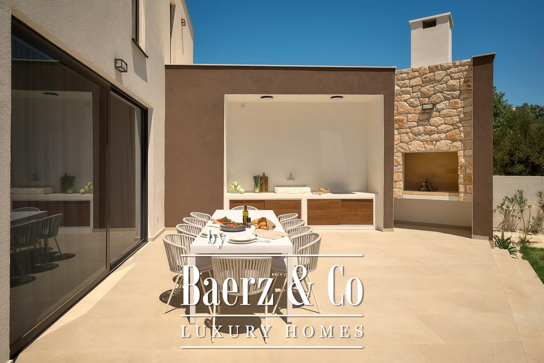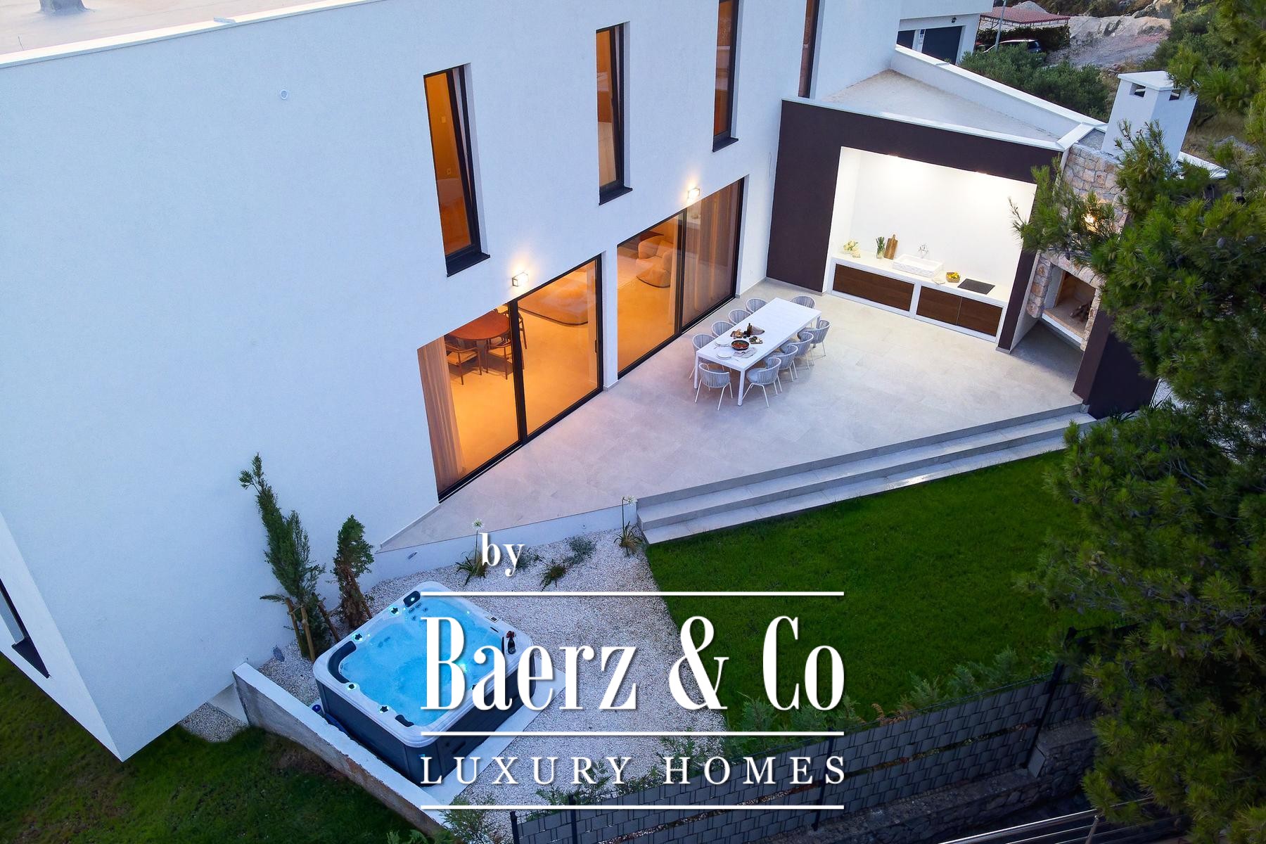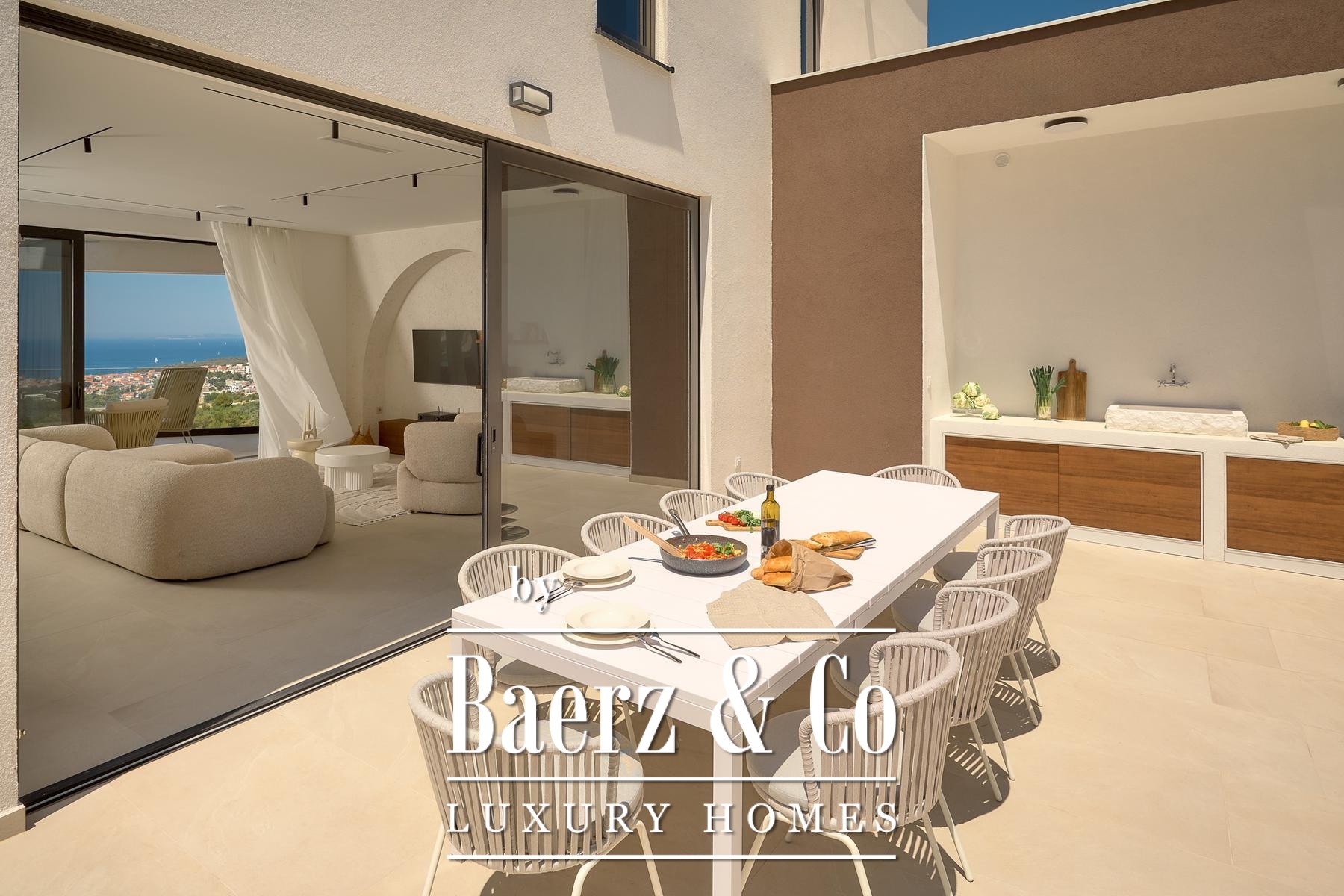 We present an exclusive, architecturally impressive villa with an infinity pool and panoramic sea views, with a total area of 559.97 m².The closed area of the villa is 379.58 m², spread over three floors, designed for maximum comfort and privacy.In the basement there is a spacious garage with two parking spaces, as well as additional functional spaces - a machine room, a storage room and a boiler room. On the same floor there is also a separate studio apartment with its own terrace, ideal for guests or staff.An internal staircase leads to the ground floor, which opens into a luxurious living area - a spacious living room connected to the dining room and a modern kitchen, with an additional storage room and a guest toilet. Large glass walls allow plenty of natural light and direct access to large terraces: one has a spectacular infinity pool with a sunbathing area, while the other is equipped with a summer kitchen and barbecue - perfect for socializing and relaxing.Upstairs there are four elegant bedrooms, each with a private bathroom and access to a balcony overlooking the sea, which provides a feeling of exclusivity and complete peace.The villa was built with an emphasis on top-quality materials, contemporary architecture and advanced smart management systems, in order to provide the highest level of functionality, security and aesthetics.This home provides an exceptional level of privacy, comfort and prestige, and is designed to meet the most demanding criteria of modern living. Located in an environment of untouched nature, surrounded by olive groves and vineyards, the villa offers complete peace, while at the same time being only a few minutes walk from the center of Primošten.For additional information or to arrange a viewing, we are happy to assist you.