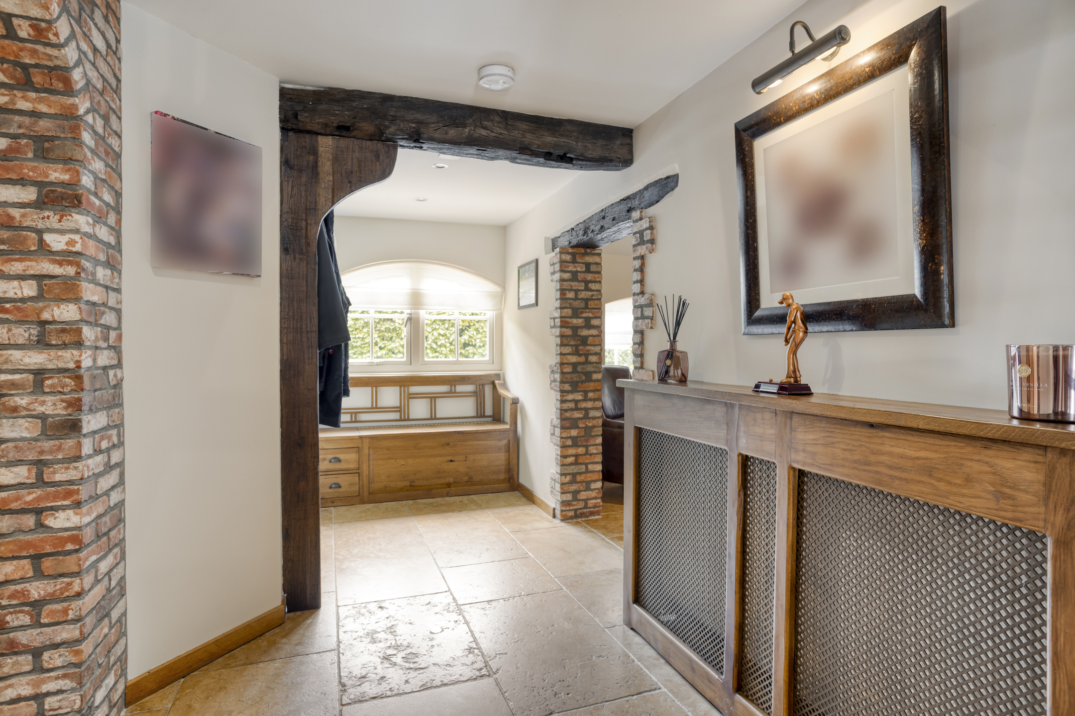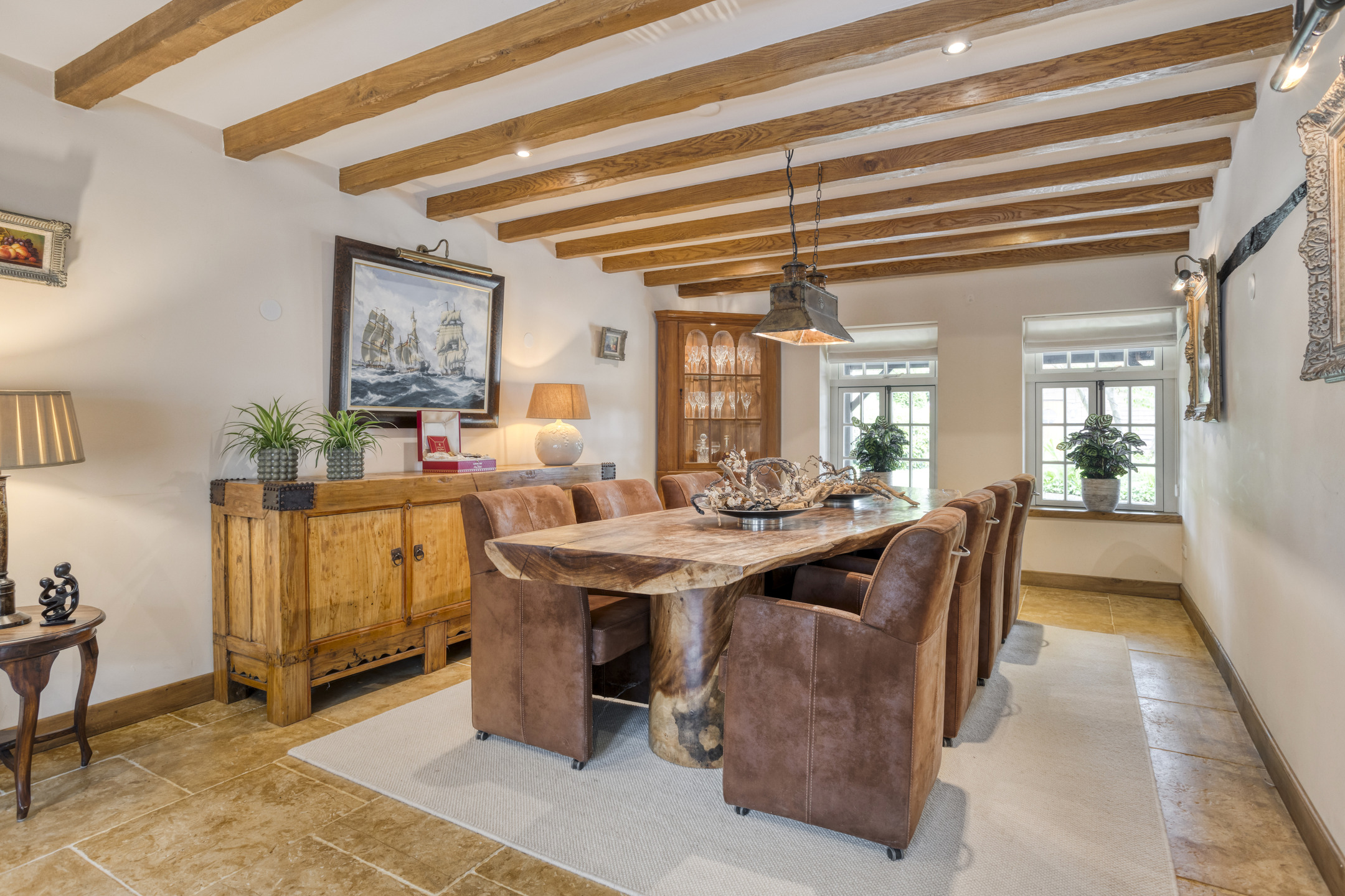 Royale entree met marmeren vloer, toiletruimte, meterkast en fraaie hardhouten trapopgang naar de eerste verdieping. De hal biedt toegang tot de eetkamer en tot een gang die leidt naar de woonkeuken, slaapkamers en badkamer. Toiletruimte met marmeren vloer- en wandbetegeling, vrij hangend closet en fonteintje. Royale, sfeervolle eetkamer met marmeren vloer, balkenplafond en volop ruimte voor een grote eettafel. Vanuit de eetkamer is er toegang tot de woonkamer. Ruime, stijlvolle woonkamer met houten vloer, grote openhaardpartij (hout), een zeer hoog plafond met een unieke balkenconstructie en een prachtige vide die toegang biedt tot een van de slaapkamers. De grote en sfeervolle woonkeuken is voorzien van een marmeren vloer, balkenplafond met inbouwspots en twee dubbele openslaande deuren naar het overdekte terras. De woonkeuken beschikt aan de tuinzijde over een ruime en gezellige zithoek met open haardpartij (gas). De keuken bestaat uit een wandopstelling met een aanrechtblad met kookgedeelte, een grote kastenwand en een spoeleiland met bargedeelte. De keukeninrichting bestaat uit een marmeren aanrechtblad met diverse kasten en lades, een groot AGA fornuis met diverse soorten ovens, een gasfornuis, twee kookplaten en een afzuigkap. De ‘kastenwand’ bestaat uit een grote koelkast, vriezer met ijsblokjesfunctie, koffiemachine, combi-oven/magnetron, stoomoven en diverse kasten. Het spoeleiland, voorzien van een marmeren blad met dubbele spoelbak en een bar met maar liefst negen zitplaatsen, vormt de centrale plek in de woonkeuken. Het eiland beschikt verder over een vaatwasmachine en diverse kasten.