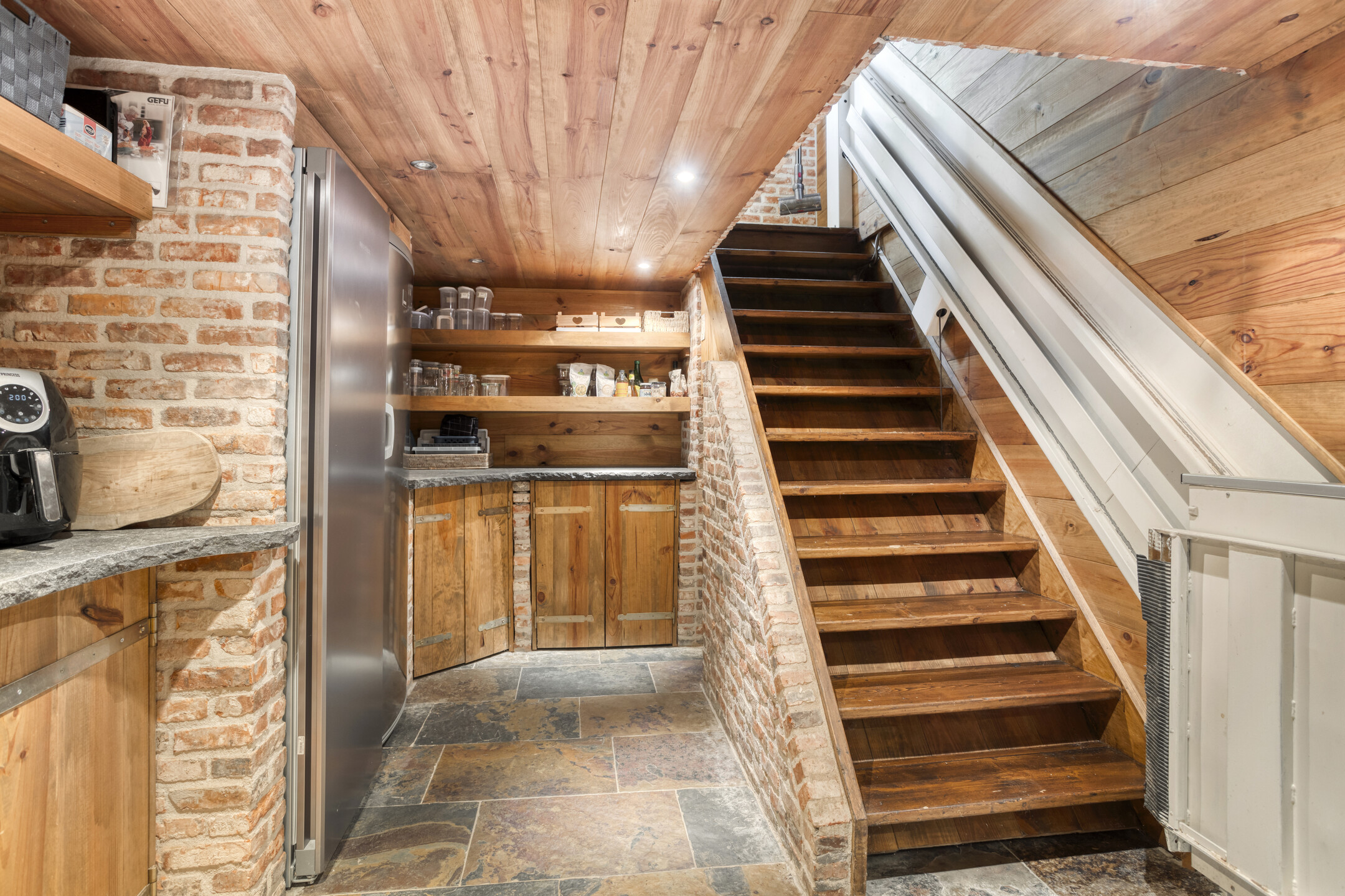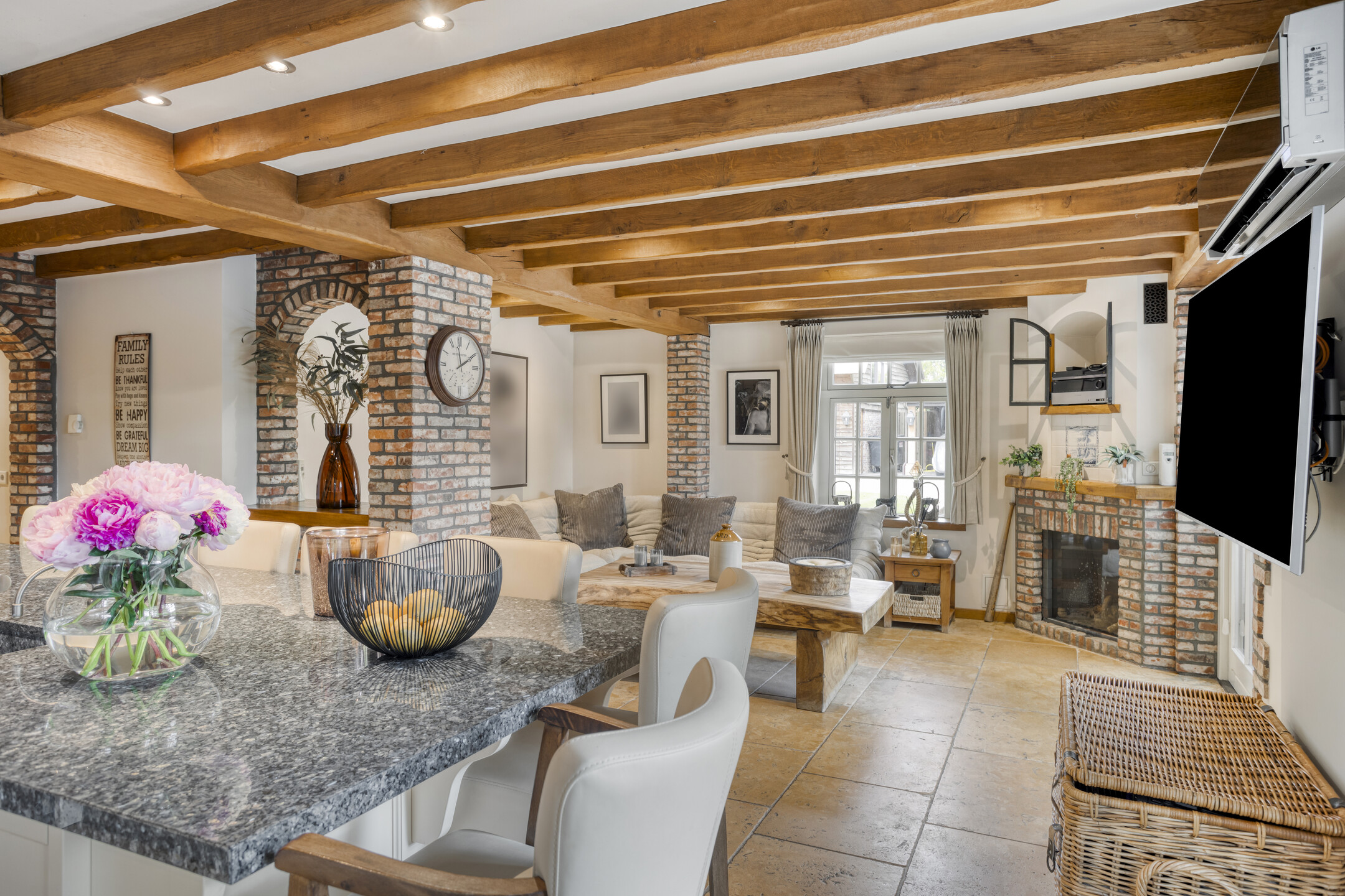 - De woonboerderij en bijgebouw beschikken over hoge plafonds met prachtige balkenconstructie en karakteristieke
