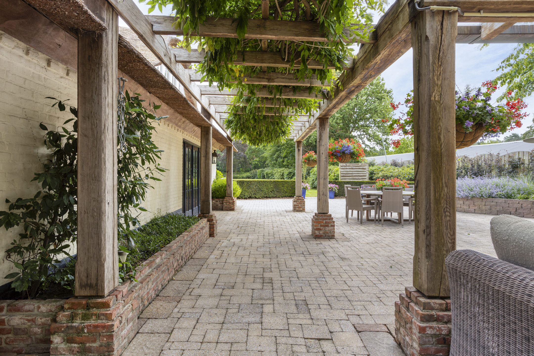 De fraai aangelegde zeer royale tuin ligt op het oosten en beschikt over meerdere grote zonneterrassen. De terrassen zijn dusdanig gesitueerd dat zowel de woonboerderij als het gastenverblijf kunnen rekenen op voldoende privacy en een prachtig uitzicht bieden op de parkachtige achtertuin. Het terras grenzend aan de woonboerderij is voorzien van een grote glazen overkapping en een fraaie pergola.