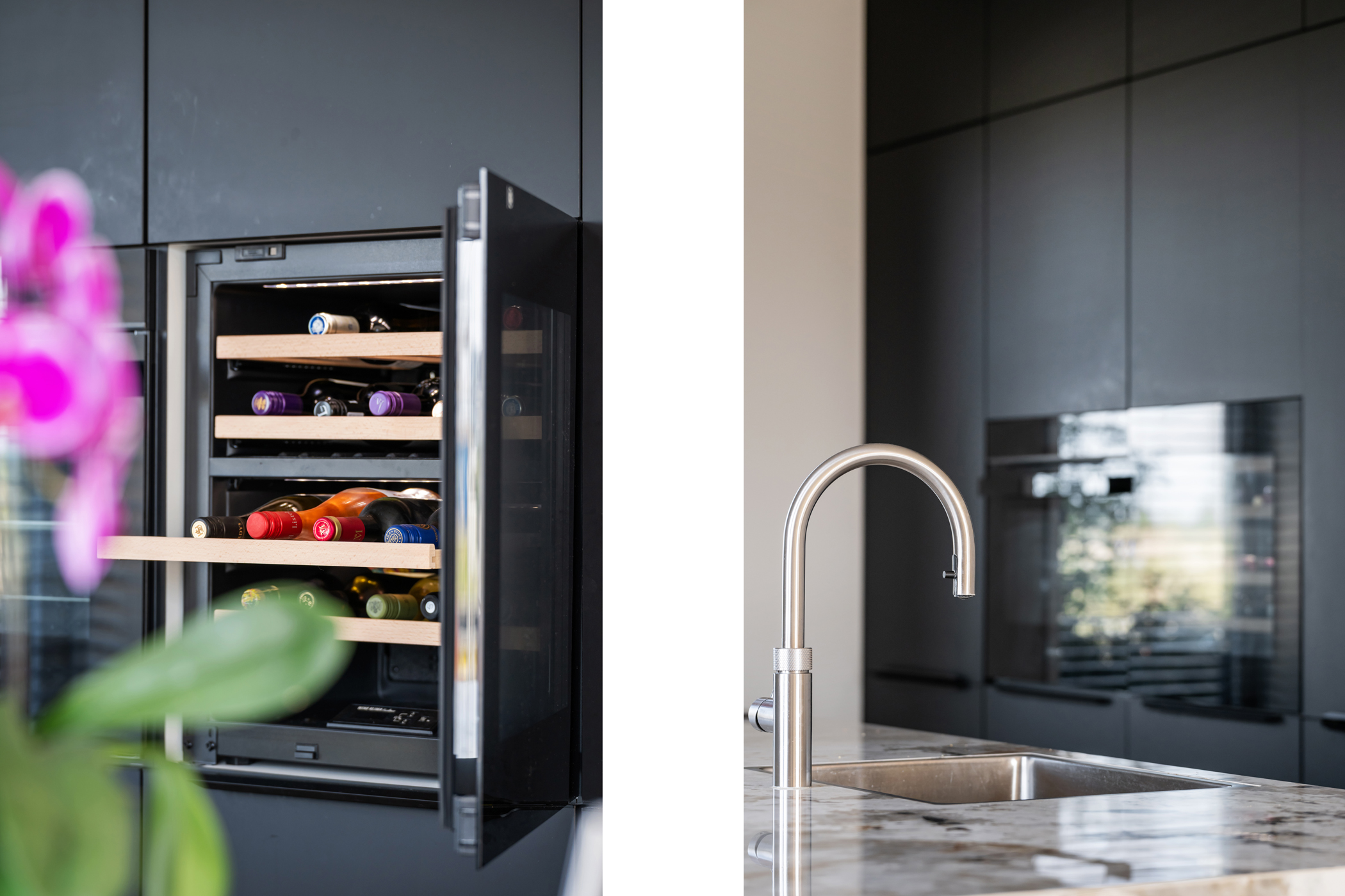 De keuken is compleet uitgerust met hoogwaardige inbouwapparatuur, waaronder een inductiekookplaat met geïntegreerde afzuiging, combi stoomoven, koelkast, vriezer, vaatwasser, wijnkoelkast en Quooker.