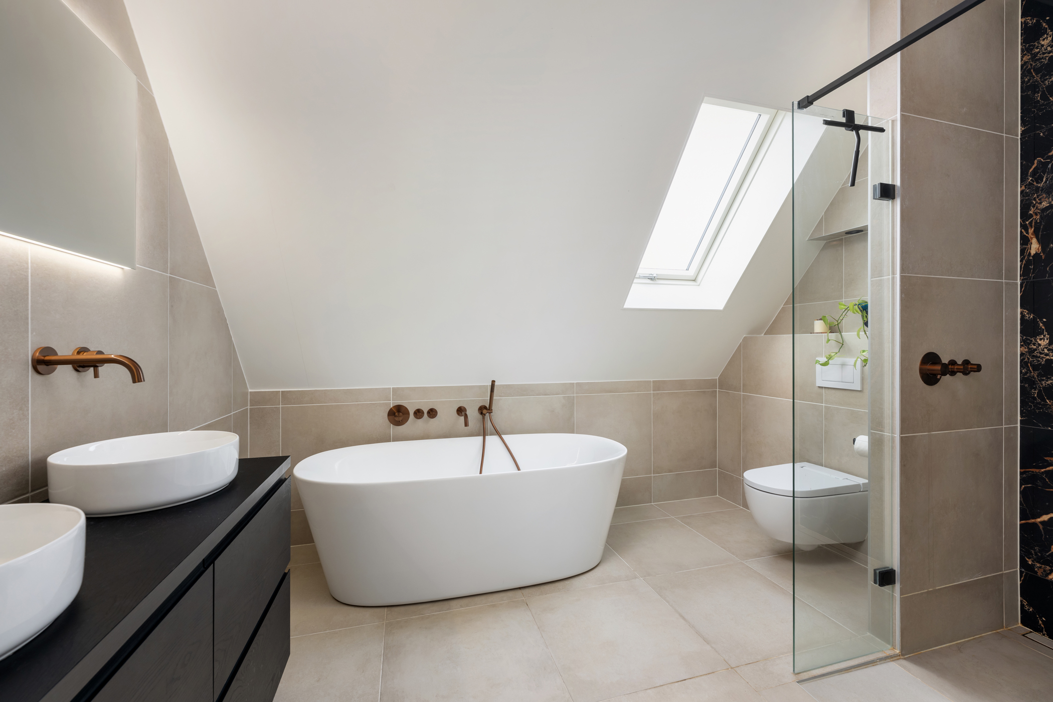 De moderne badkamer is voorzien van een ligbad, inloopdouche, toilet, dubbele wastafel en verlichte, verwarmde spiegel.