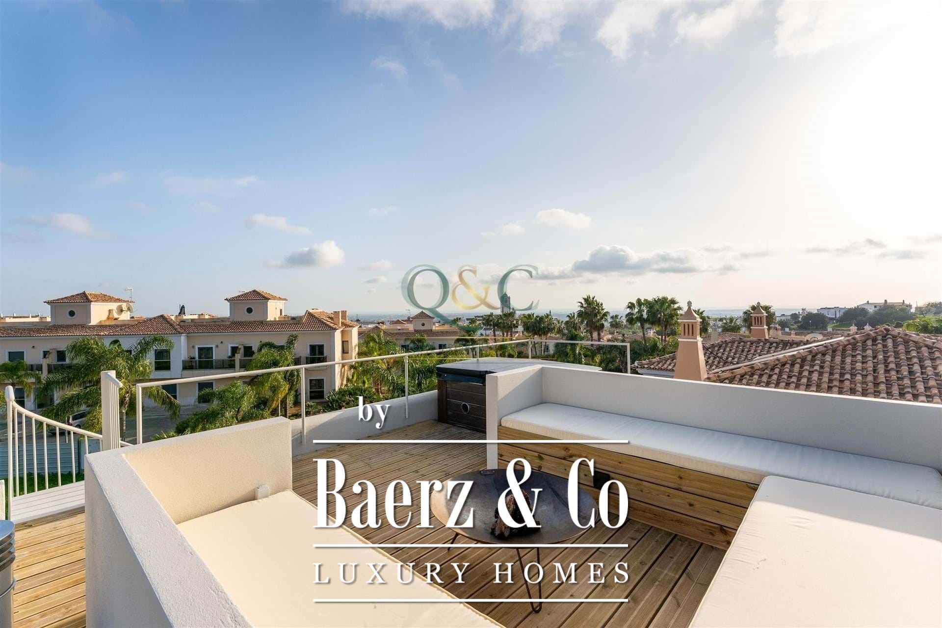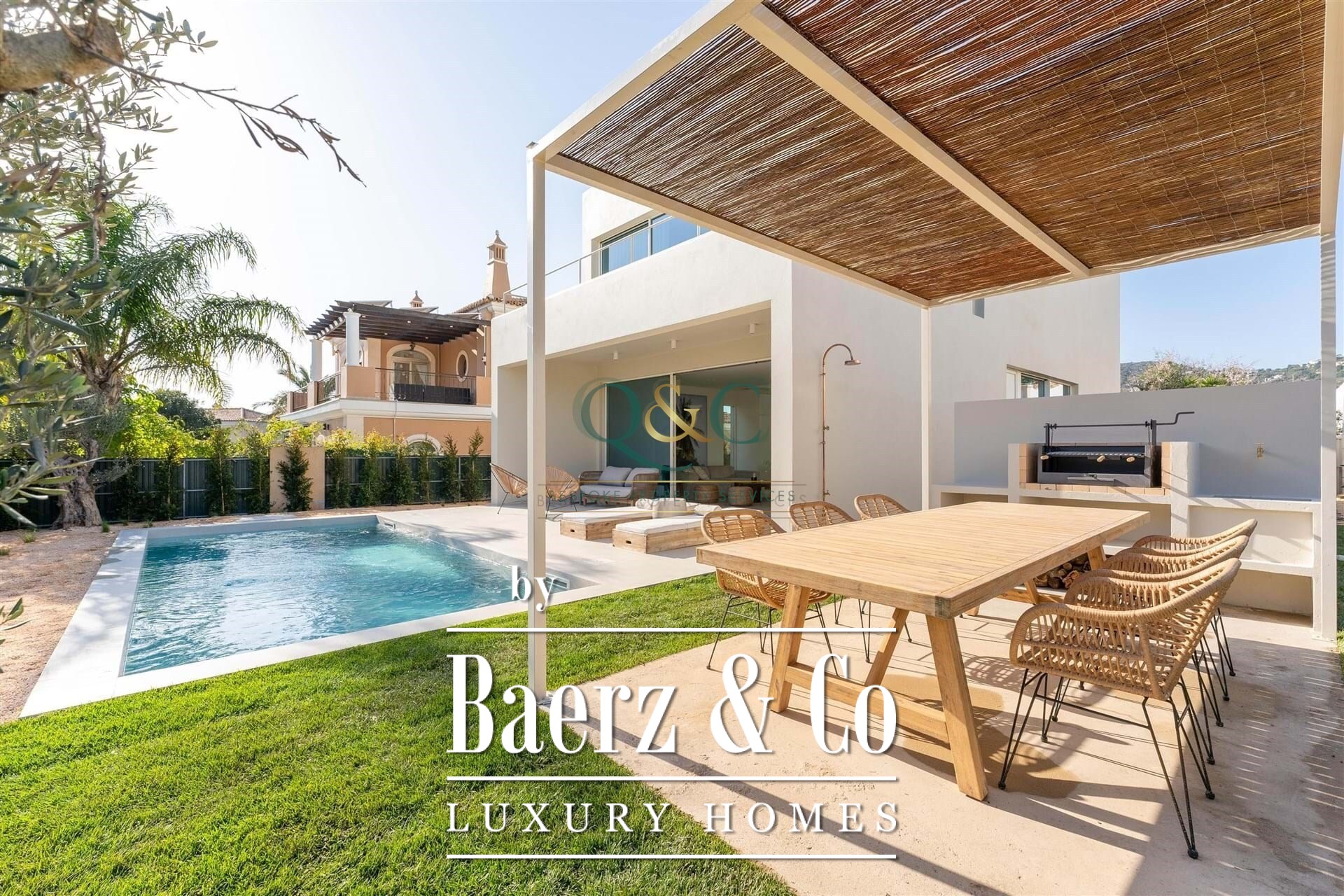 De belangrijkste leefruimtes geven direct toegang tot zonneterrassen, een privé tuin en een zwembad dat omringd is door speciale buiten-eet- en barbecueplekken. Op het dakterras geniet u van weidse zeezichten en een comfortabele zitruimte rondom een vuurplaats, ideaal om in alle rust van de Algarve-zonsondergang te genieten. Het souterrain biedt een royale kelder en een afgesloten garage, met flexibele mogelijkheden voor gebruik als ontspanningsruimte, fitnessruimte, thuisbioscoop of extra accommodatie.