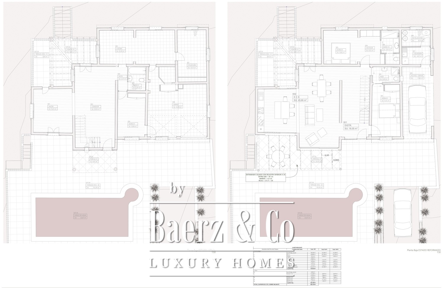 De indeling bestaat uit vier slaapkamers en drie badkamers, waarmee een harmonieus evenwicht ontstaat tussen comfort en esthetiek. Volledig geïntegreerde airconditioning zorgt het hele jaar voor een aangenaam klimaat. Buiten vormen de verzorgde tuin en het uitnodigende zwembad het hart van het wonen, waardoor een naadloze overgang tussen binnen en buiten ontstaat, badend in het mediterrane licht. Een garage met twee parkeerplaatsen combineert gemak en veiligheid.