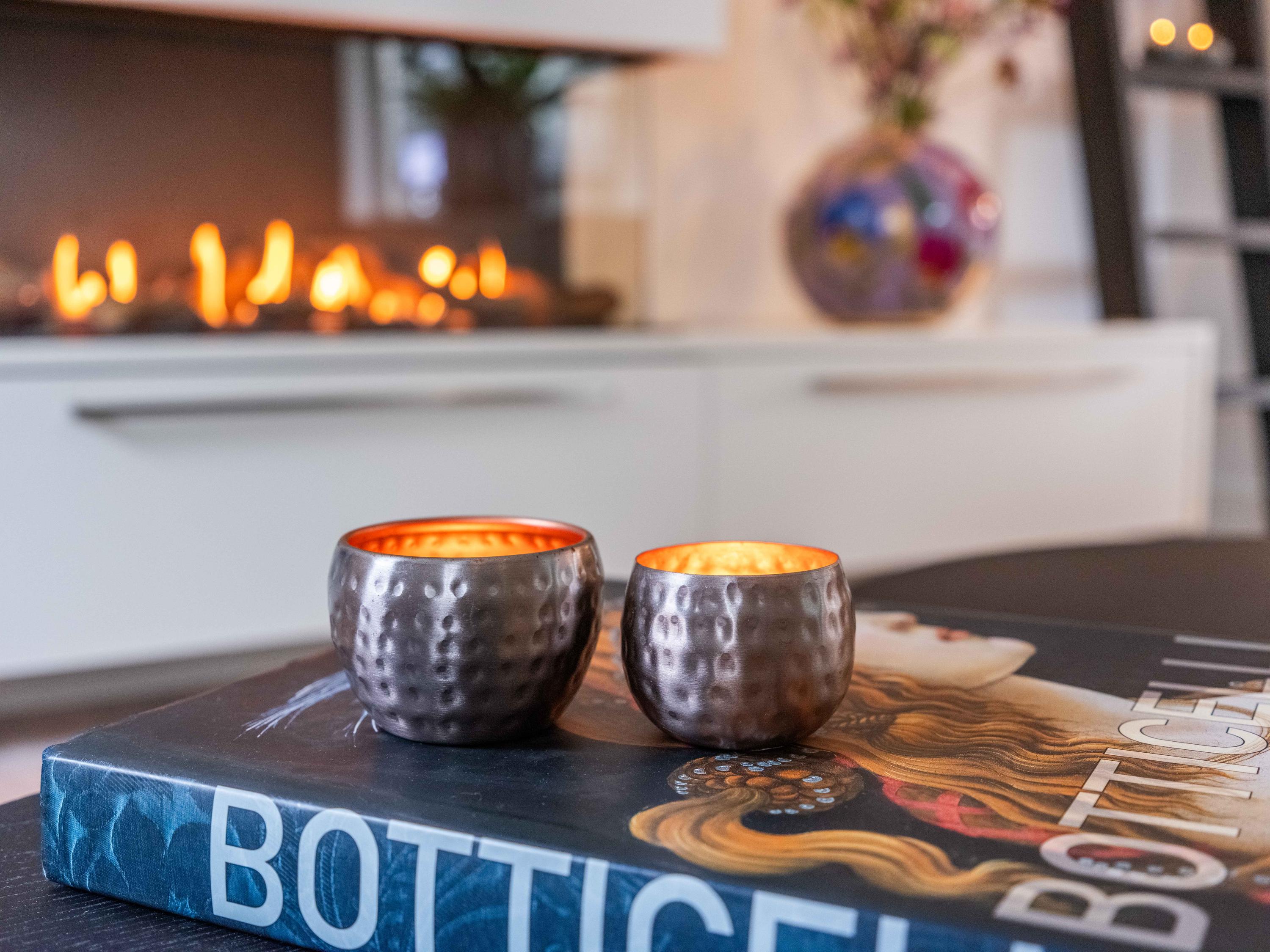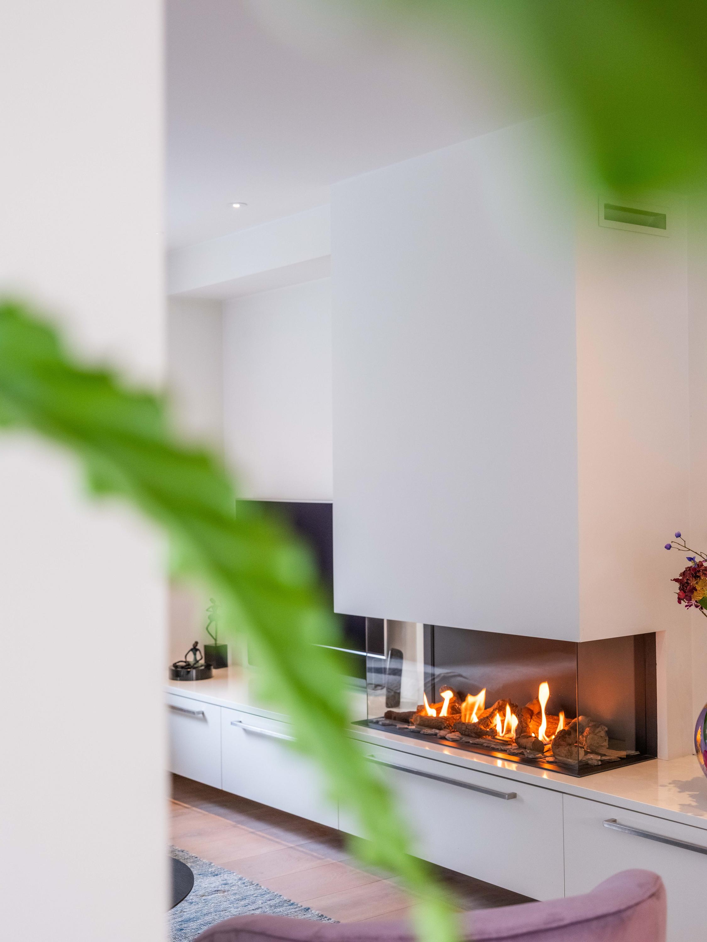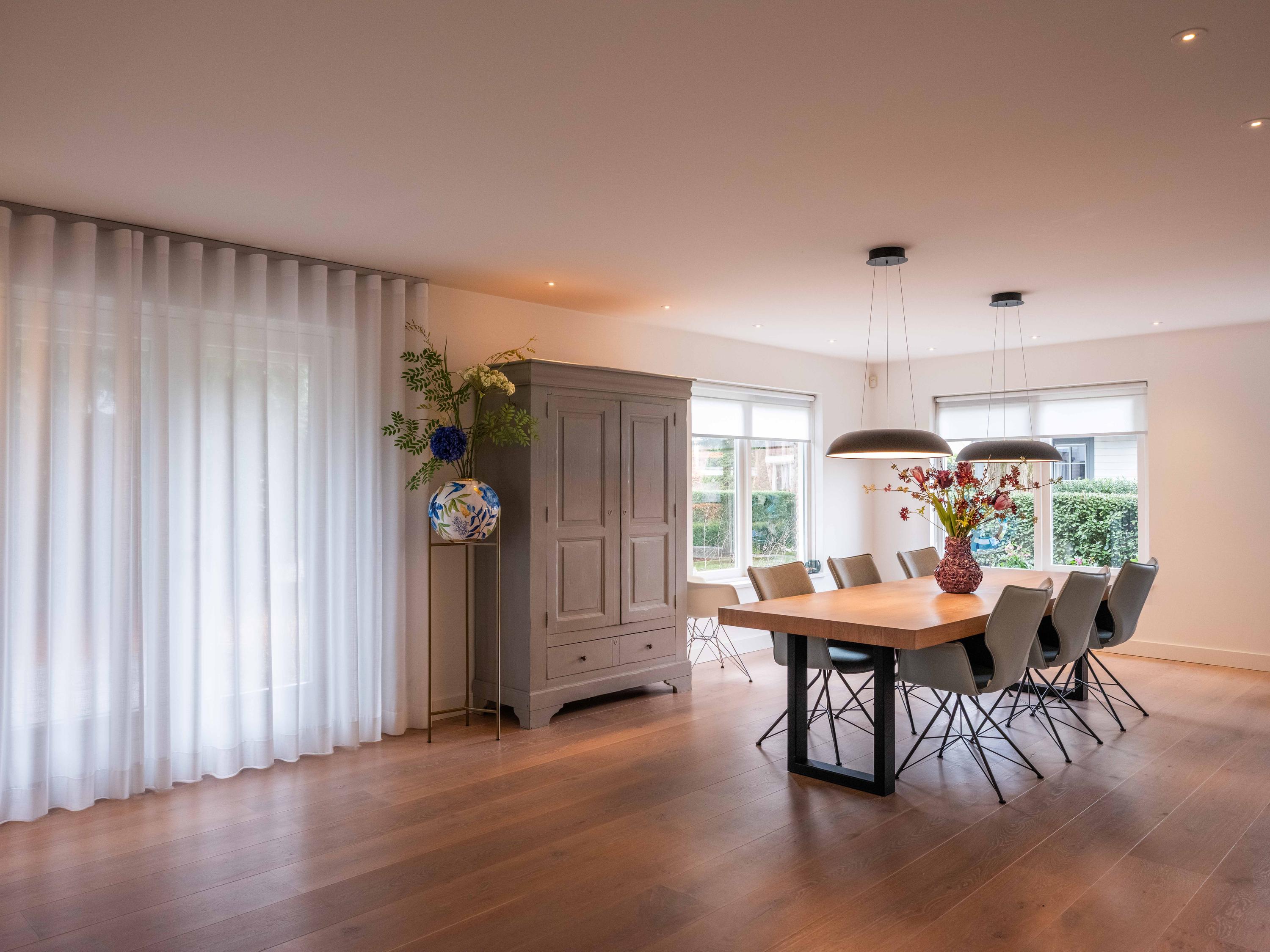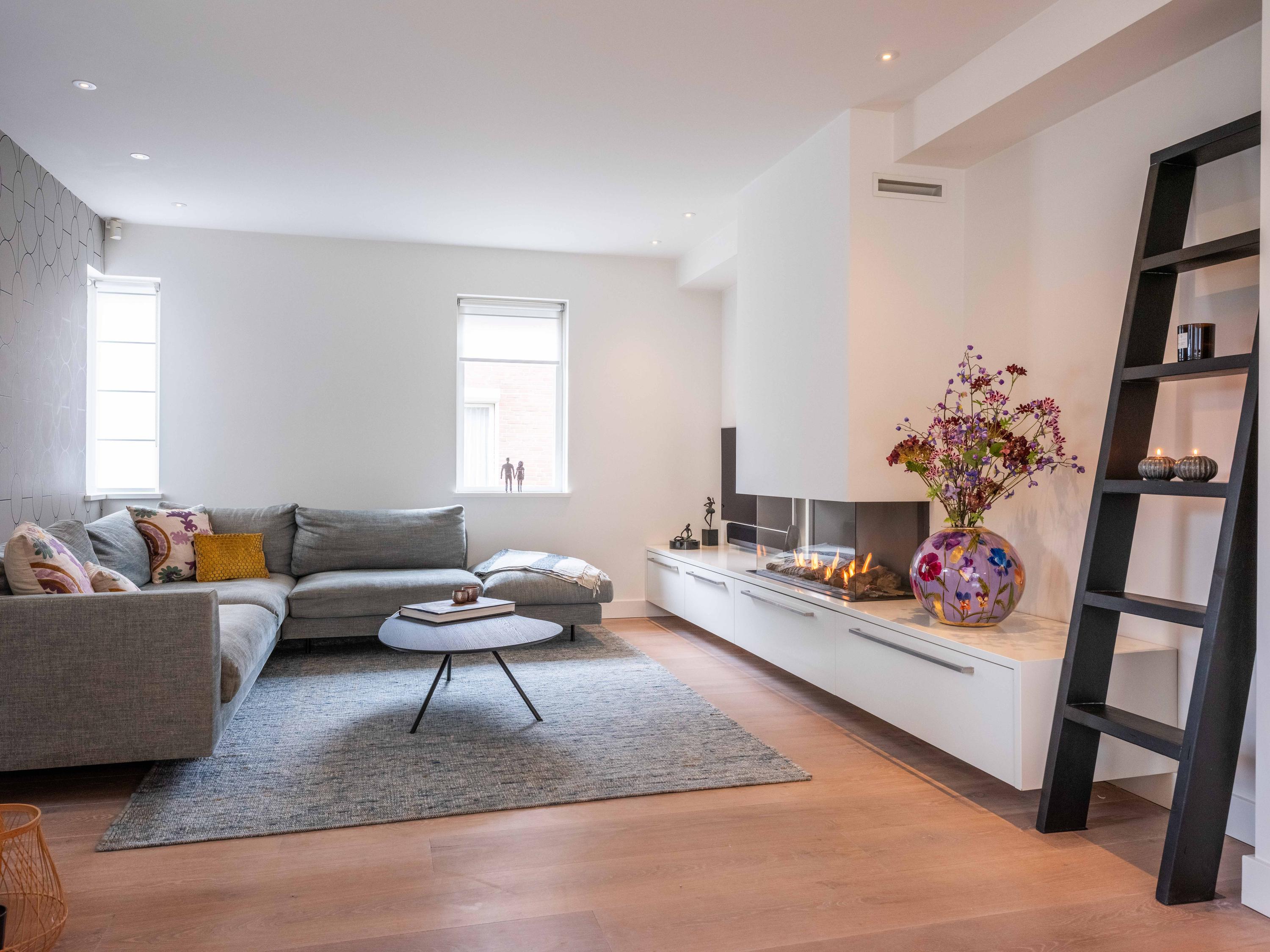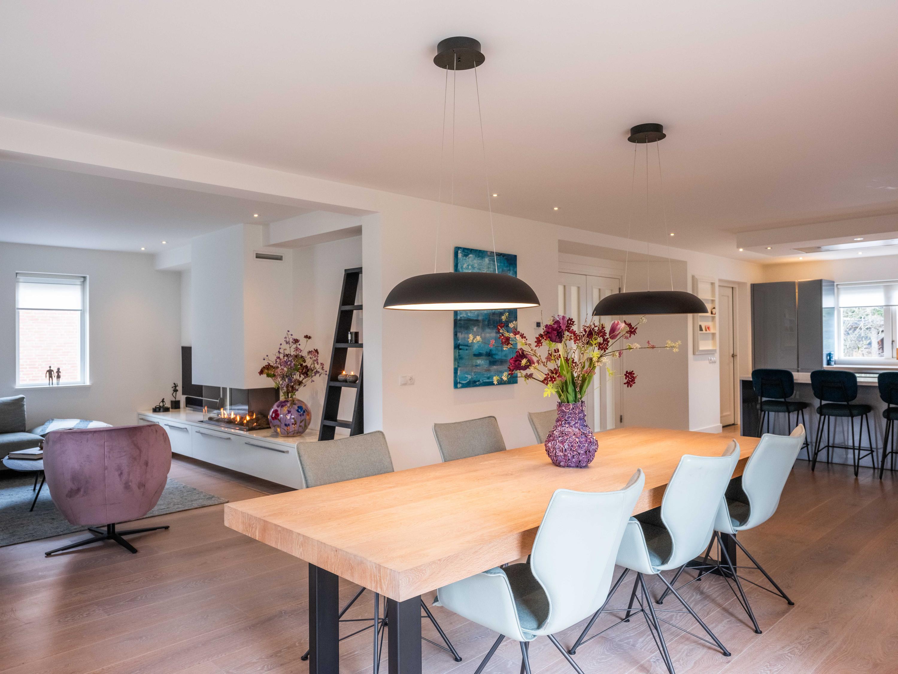 Via dubbele deuren is er toegang tot de royale L-vormige living, hier wordt je meteen wordt verwelkomd door veel licht dankzij de grote raampartijen. In de hoek is een gezellige zithoek met een sfeervolle gashaard. De eiken verlijmde vloer in combinatie met vloerverwarming over de volledige begane grond zorgt voor een warme en comfortabele sfeer.