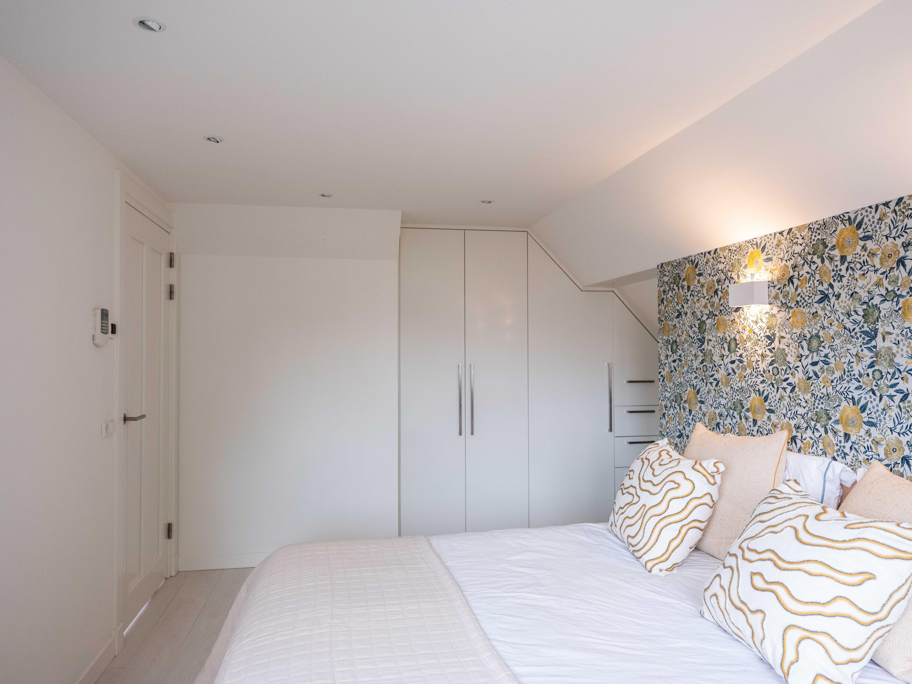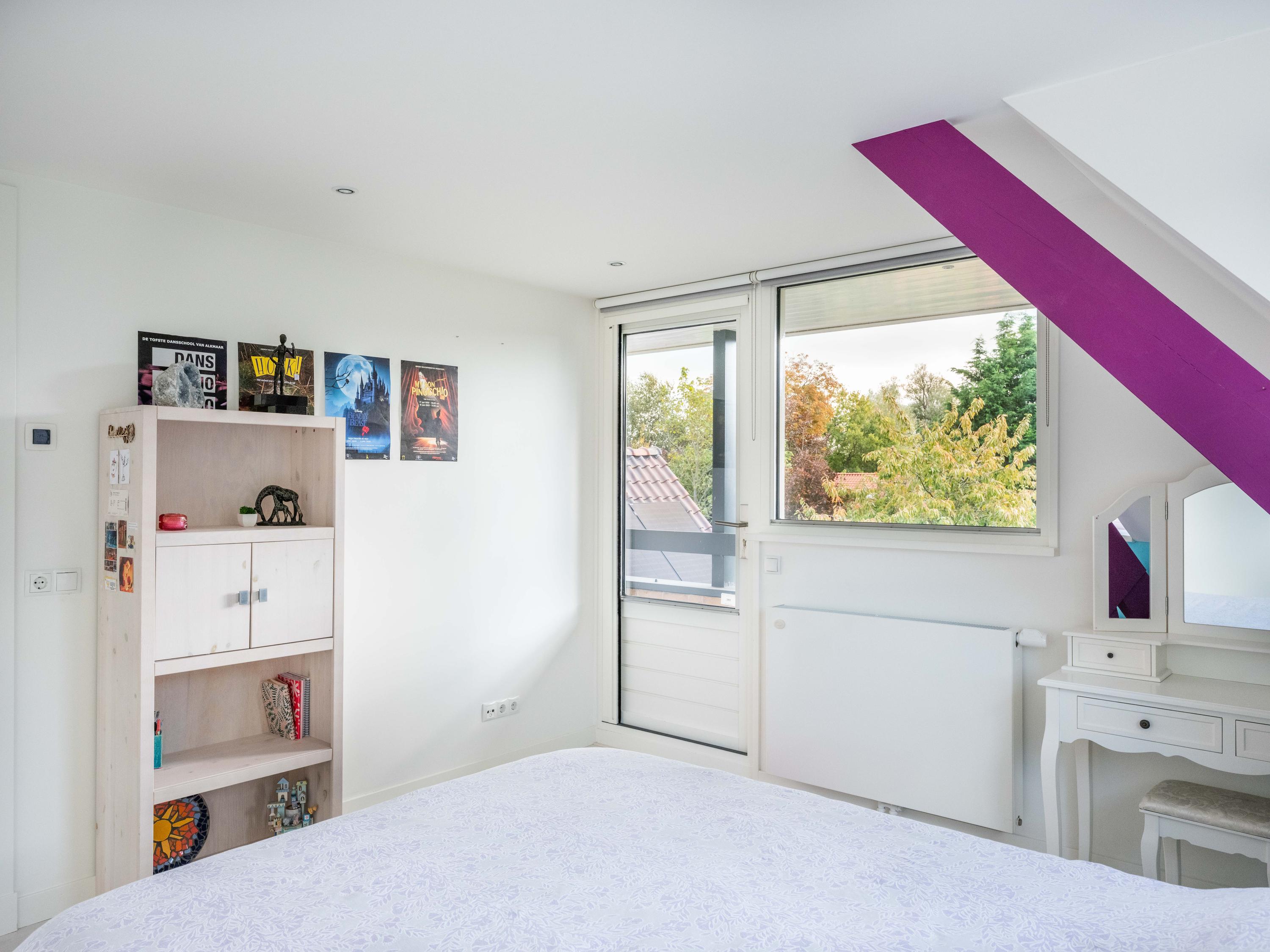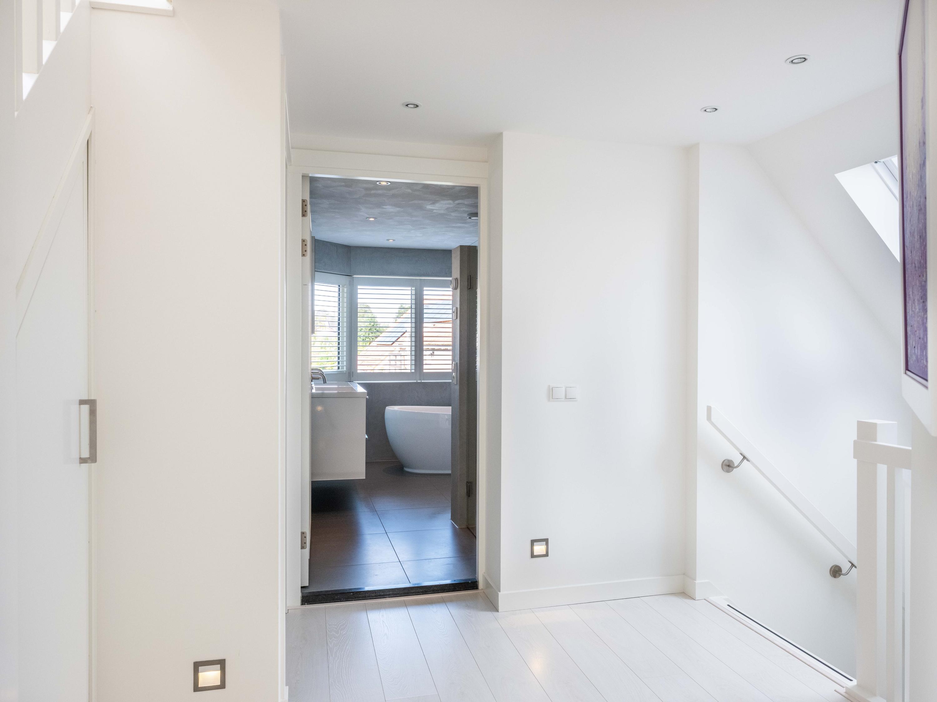 Op de eerste verdieping bevinden zich 3 slaapkamers en nog een ruime badkamer met dubbele wastafel, toilet, ligbad en een royale dubbele inloopdouche. Ook hier is vloerverwarming aanwezig, evenals een radiator. De grootste slaapkamer is ruim opgezet en beschikt over veel vaste kastruimte. Daarnaast zijn er nog twee lichte slaapkamers, beiden met vaste kasten en toegang tot een eigen balkon. Onder de trap naar zolder is nog een handige bergkast gesitueerd.