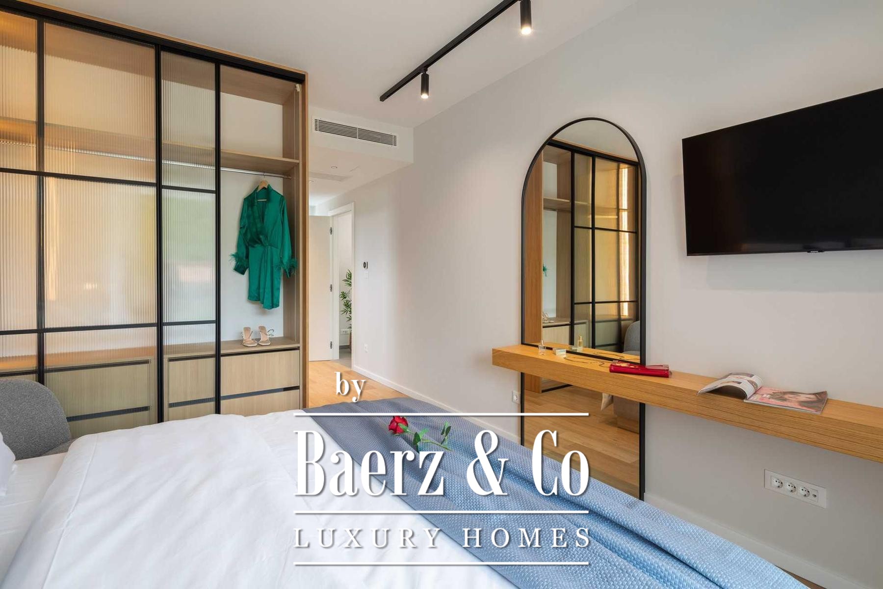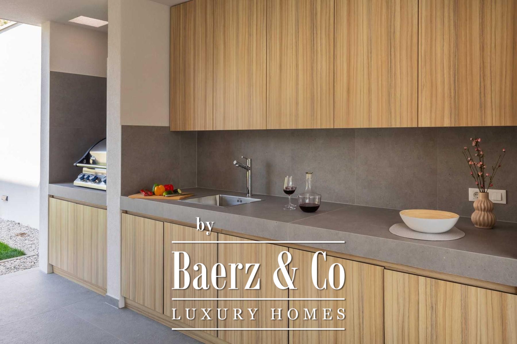 De entree leidt naar een zorgvuldig ontworpen begane grond, waar een fitnessruimte met sauna en een badkamer het welzijn centraal stellen. De open keuken, eetkamer en woonkamer worden gekenmerkt door grote glazen wanden die het daglicht rijkelijk laten binnenstromen en het binnenleven naadloos verbinden met buiten. Overdekte terrassen grenzen aan zowel de keuken als de woonkamer en voeren naar een verwarmd zwembad en een aangelegd zonneterras.
