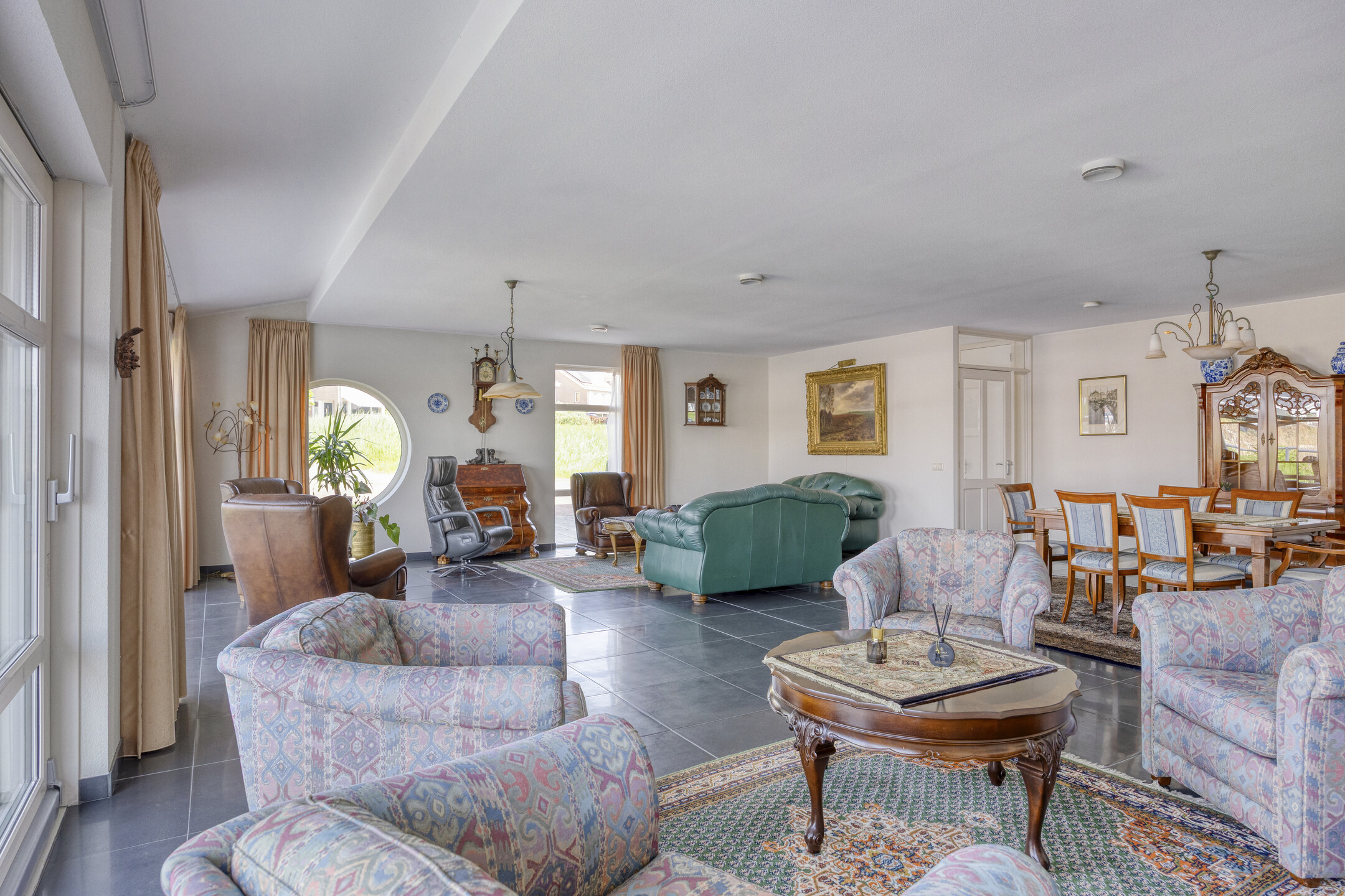 woonkamer met zicht op de haven voorzien van een schuifpui naar het royale terras van 70 m², wandafwerking sierpleister, tegelvloer, plafond afgewerkt met spuitwerk;