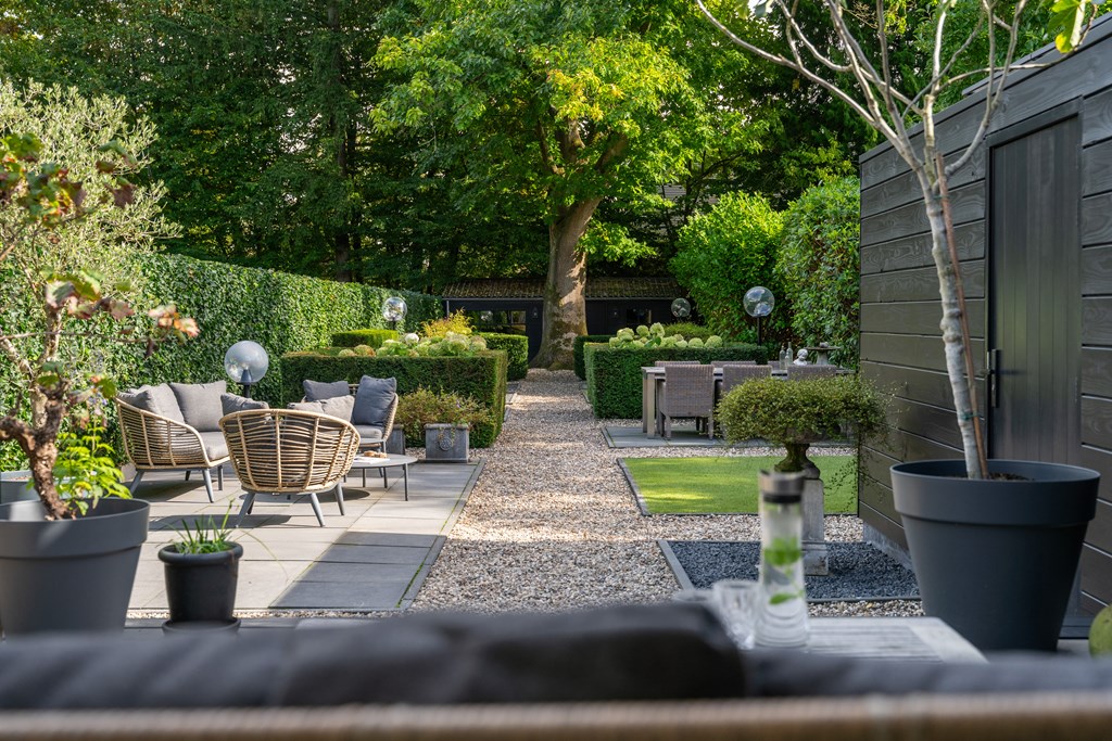 De achtertuin is verzorgd en royaal opgezet; een ideale plek voor gezinnen en liefhebbers van het buitenleven. Met een diepte van circa 45 meter biedt de tuin volop ruimte om te genieten van meerdere zithoeken, zowel in de zon als in de schaduw. De indeling is fraai en functioneel ingericht met kunstgras en kleurrijke bloemenperken, die zorgen voor een onderhoudsvriendelijke en sfeervolle uitstraling.