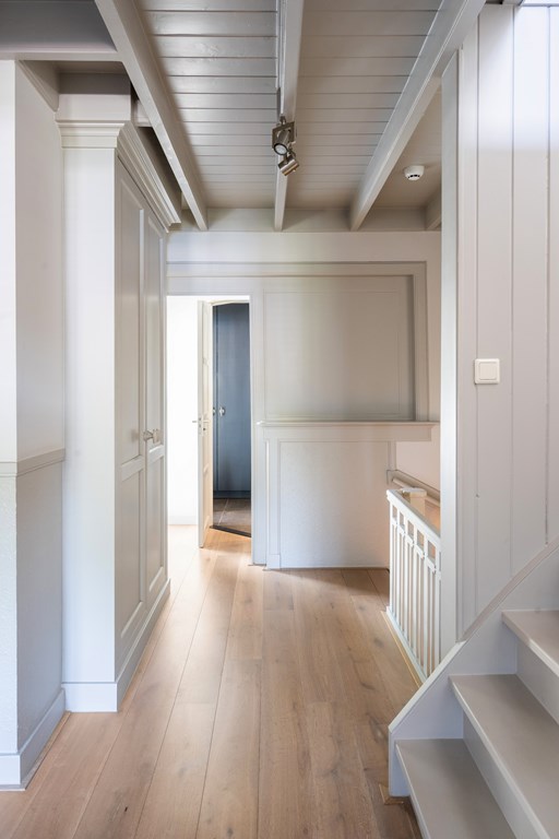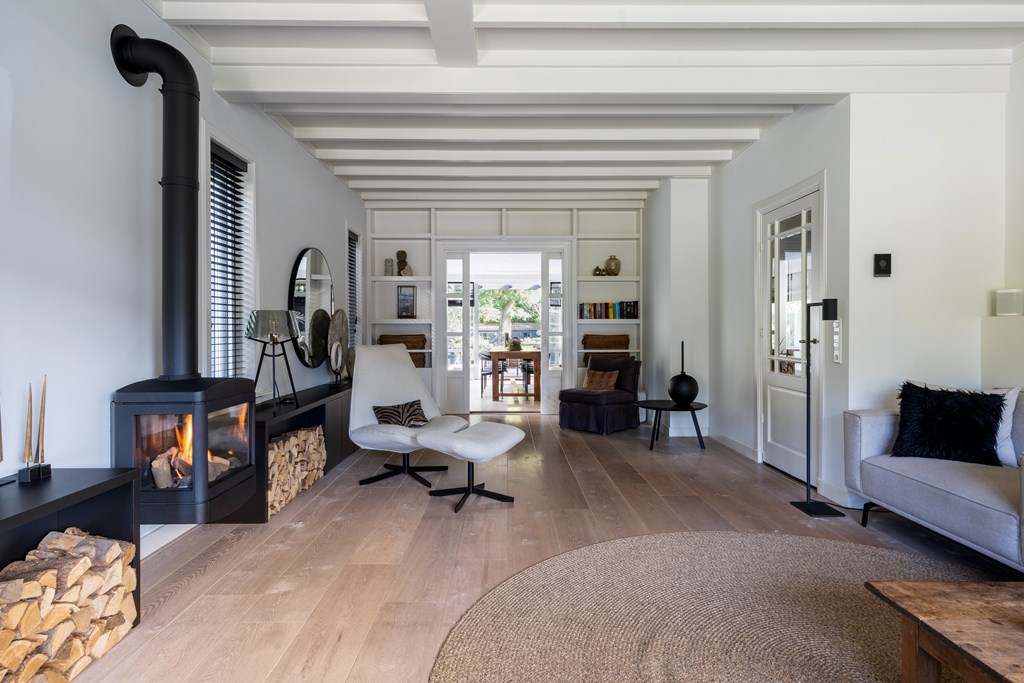 U komt binnen in de entree en hal, welke beiden voorzien zijn van een authentieke granito vloer. Via de entree en hal, toilet en trapopgang betreedt u de ruime woonkamer. De grote raampartijen zorgen voor veel lichtinval. De stijlvolle gashaard vormt een echte blikvanger en creëert een luxe, behaaglijke sfeer.