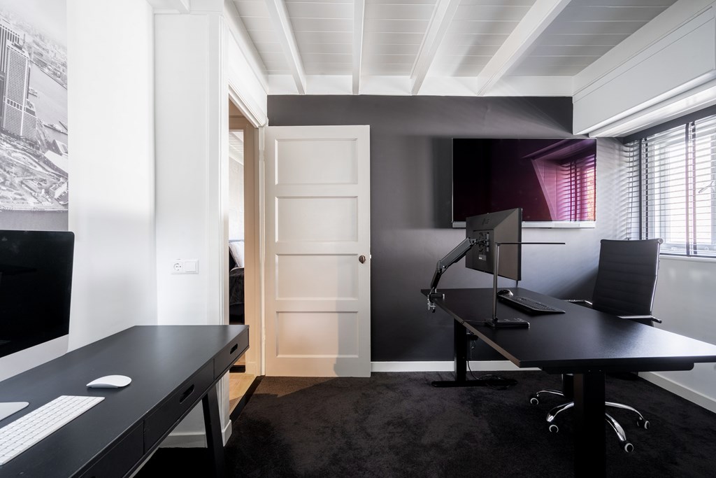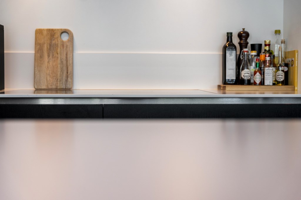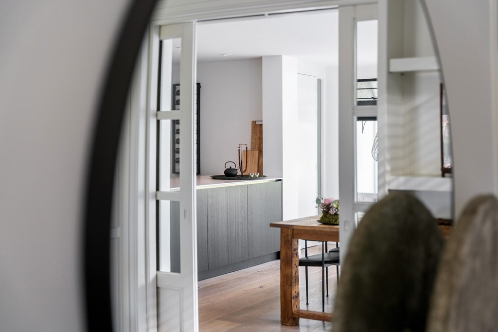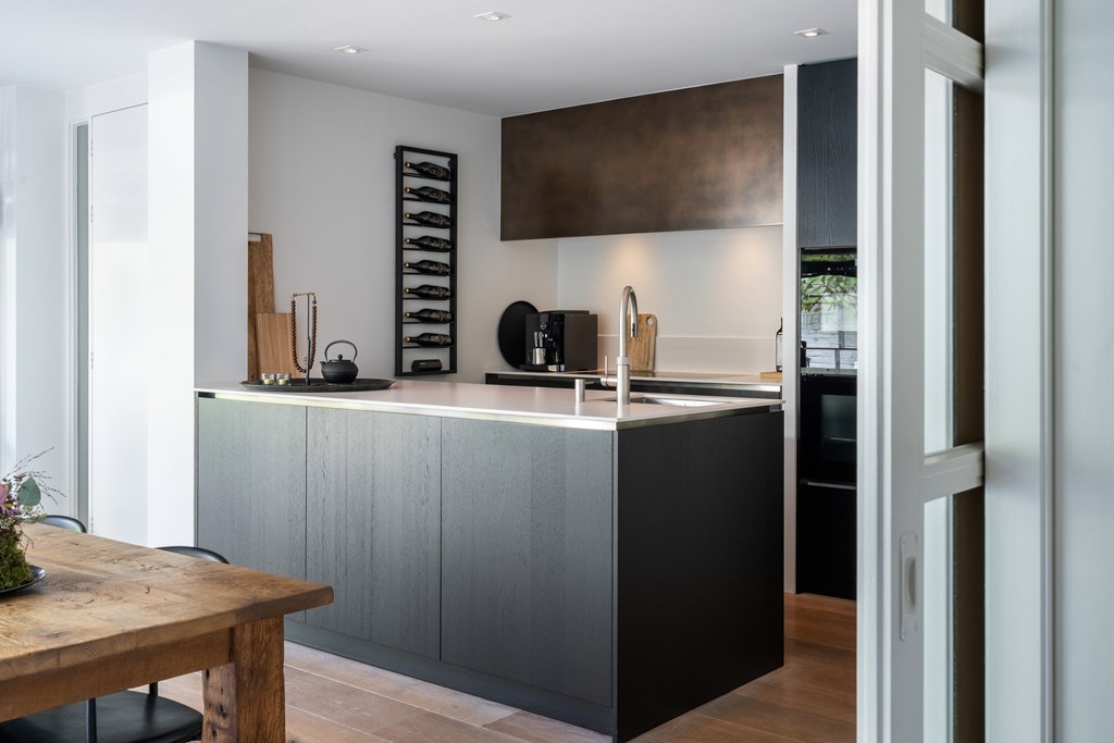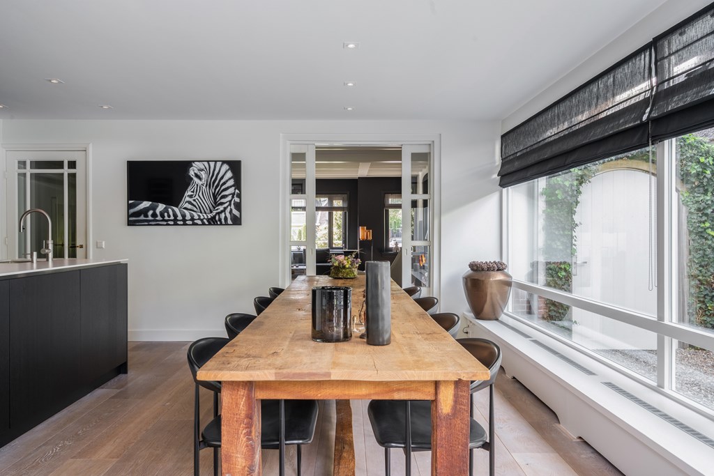 Aan de achterzijde bevindt zich de royale eethoek, voorzien van airconditioning, met directe toegang tot de moderne keuken. Deze is uitgerust met diverse hoogwaardige inbouwapparatuur, waaronder een Miele stoomoven en tweede oven, inductiekookplaat, Quooker en een ruime Liebherr-koelkast. Aansluitend bevindt zich de bijkeuken met extra bergruimte, aansluitingen voor wasmachine en droger, en toegang tot de achtertuin.
