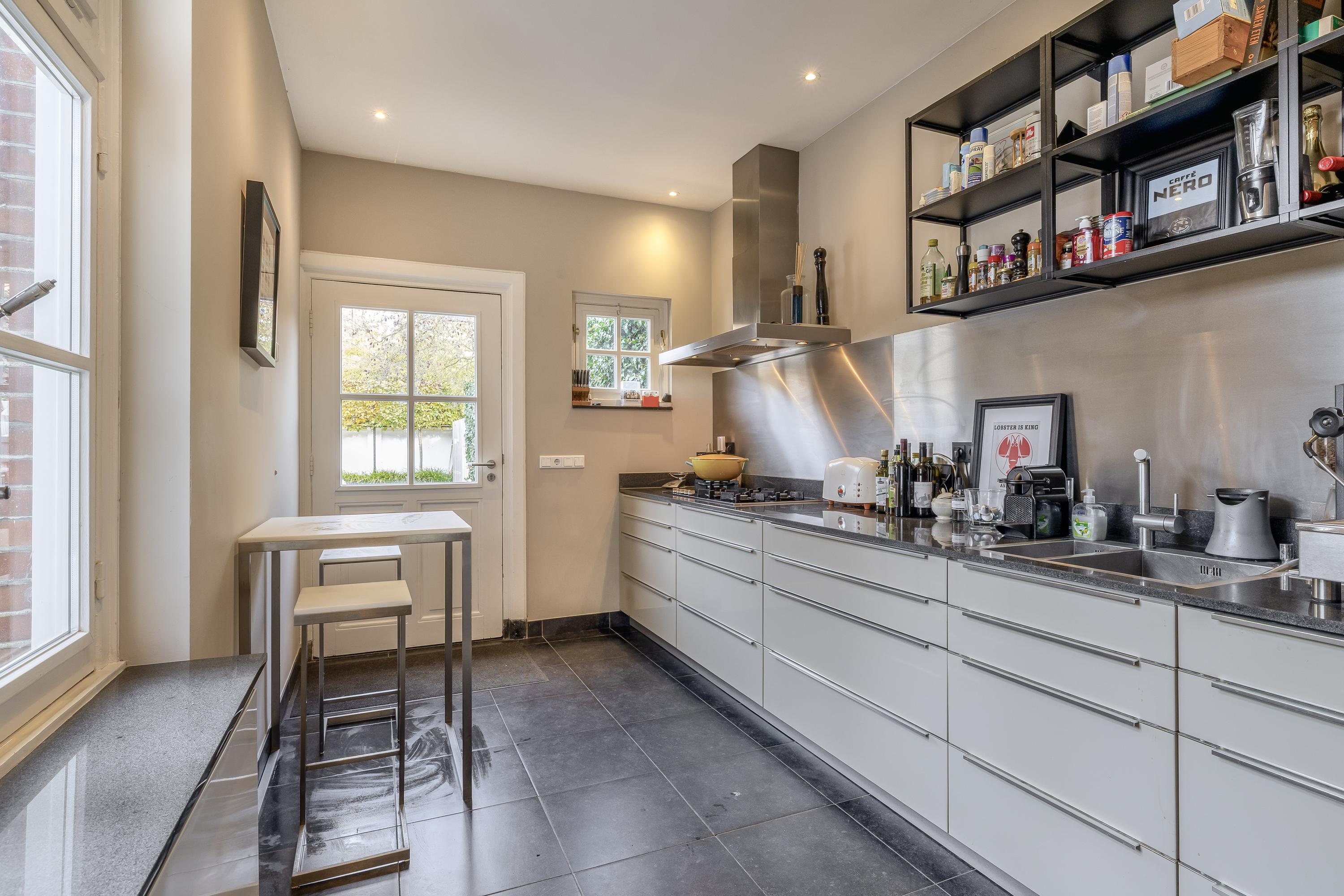 De keuken is volledig uitgerust en voorzien van een opstelling in de lengteweg. Er ligt een tegelvloer en er zijn een 5-pits gasfornuis, afzuigkap, oven, stoomoven, vaatwasser, koelkast, diepvries en apothekerskast aanwezig.