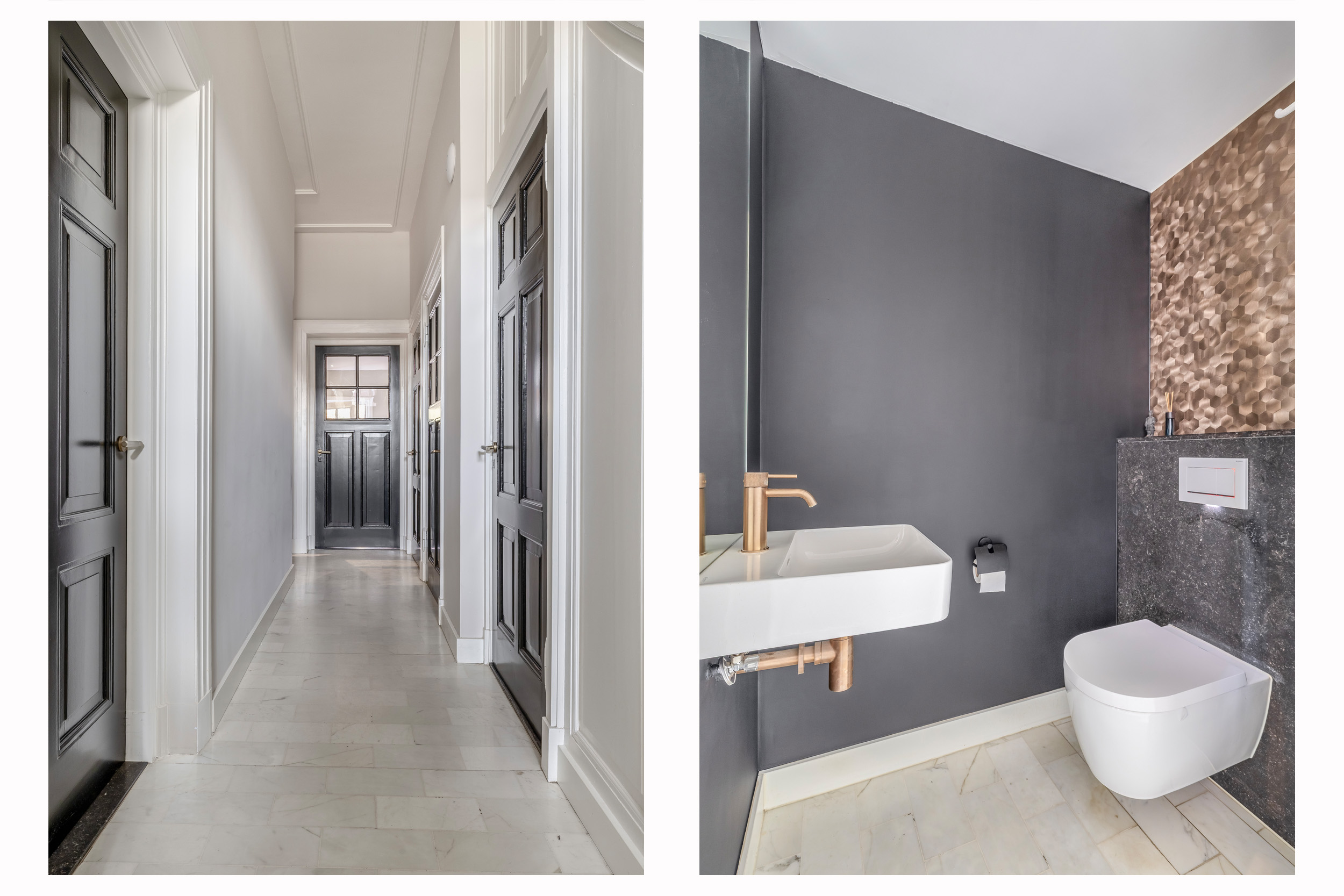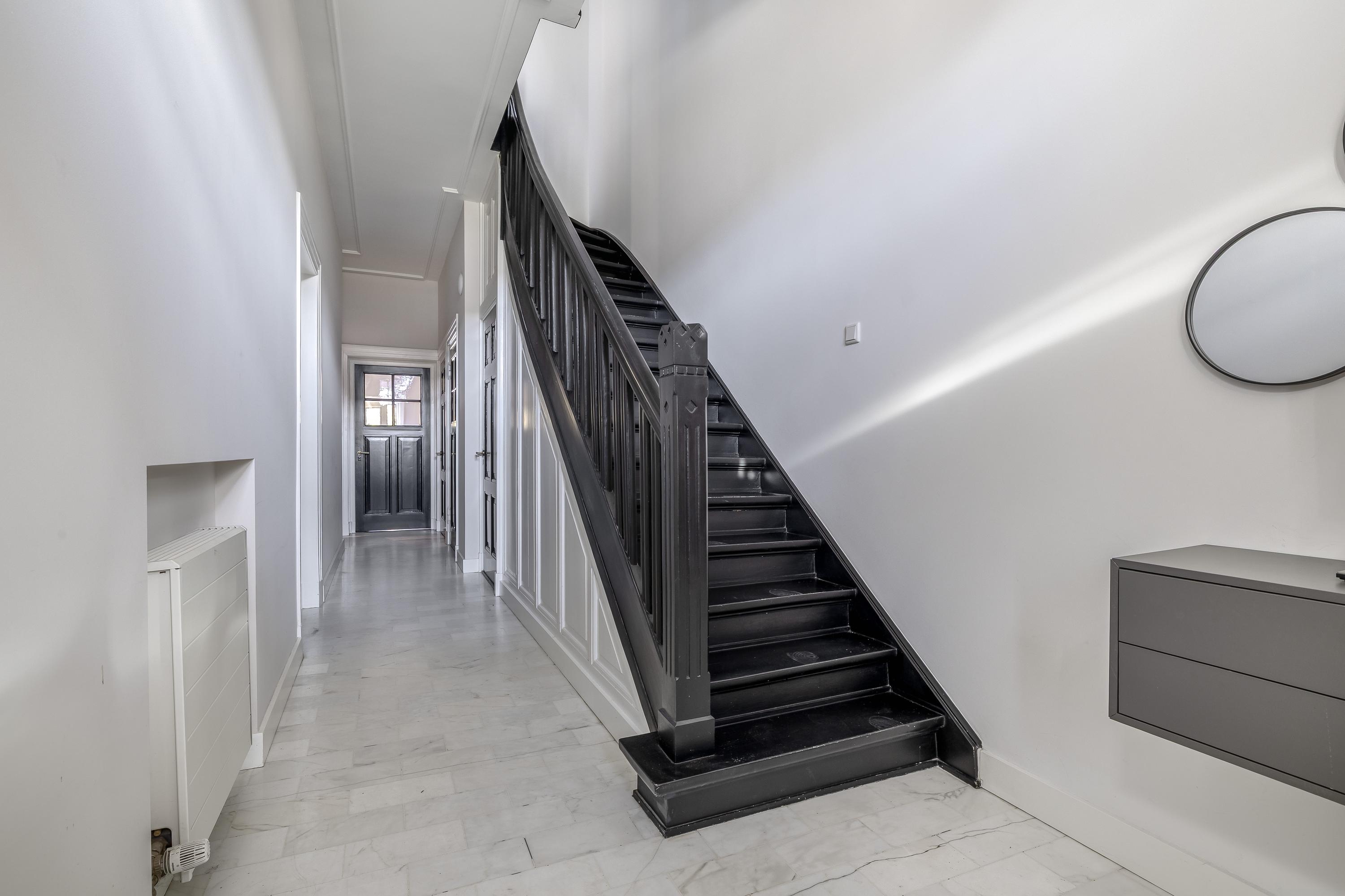 De brede entree hal is voorzien van een marmeren Bianco Carrara tegelvloer. Vanuit hier is er toegang tot het souterrain, het toilet met fonteintje en een bergkast met de warmtepomp en cv-ketel.