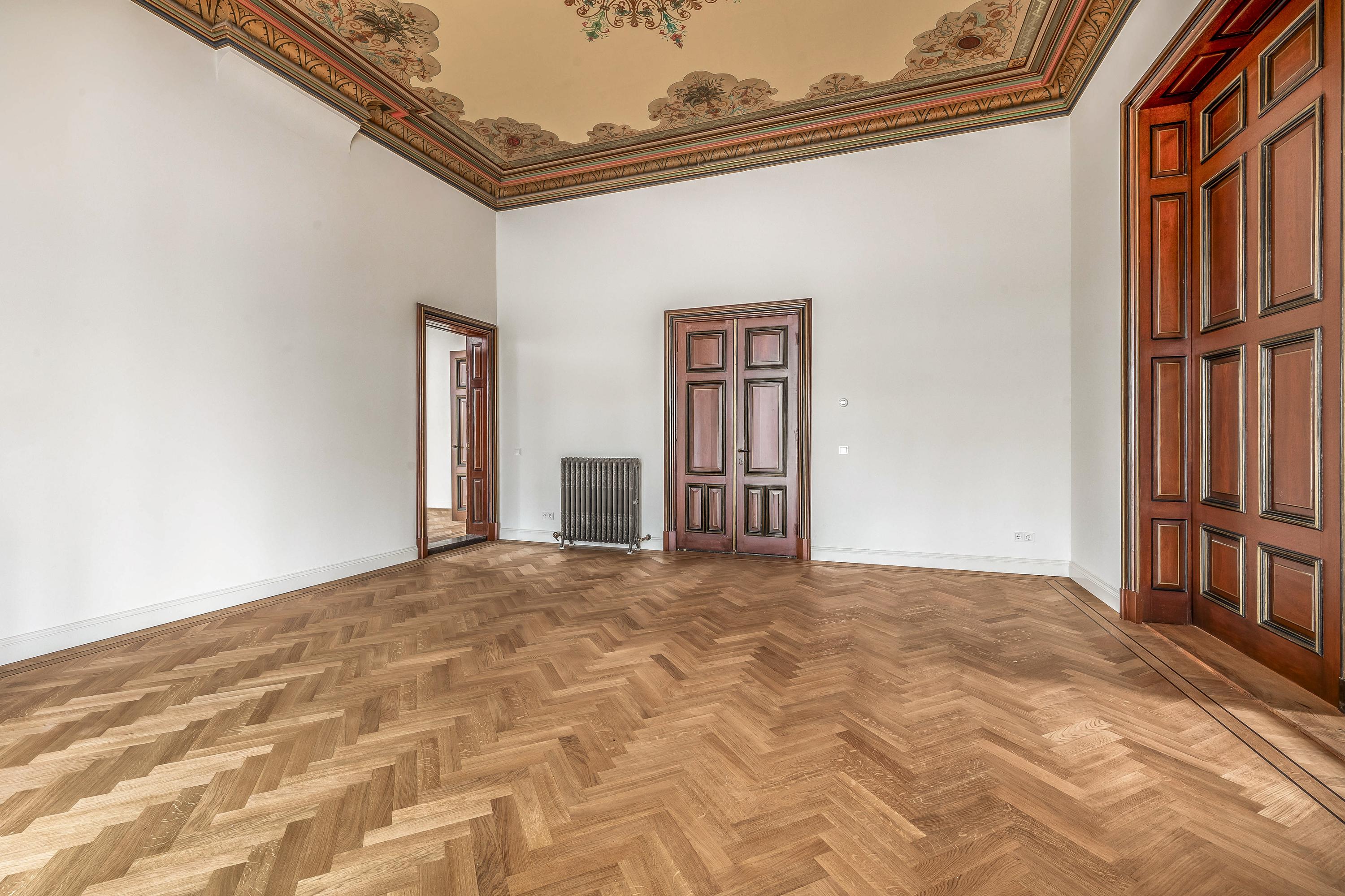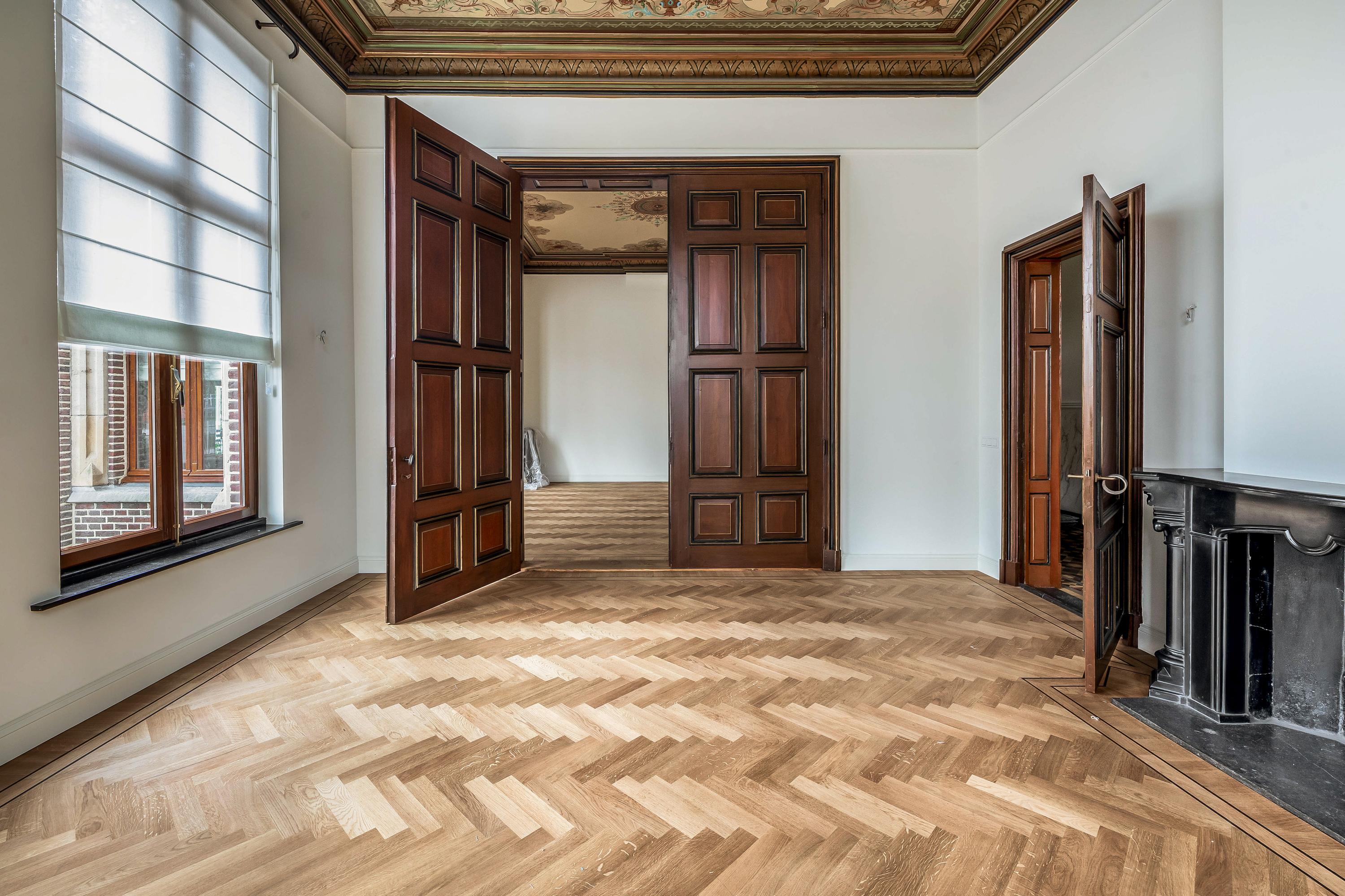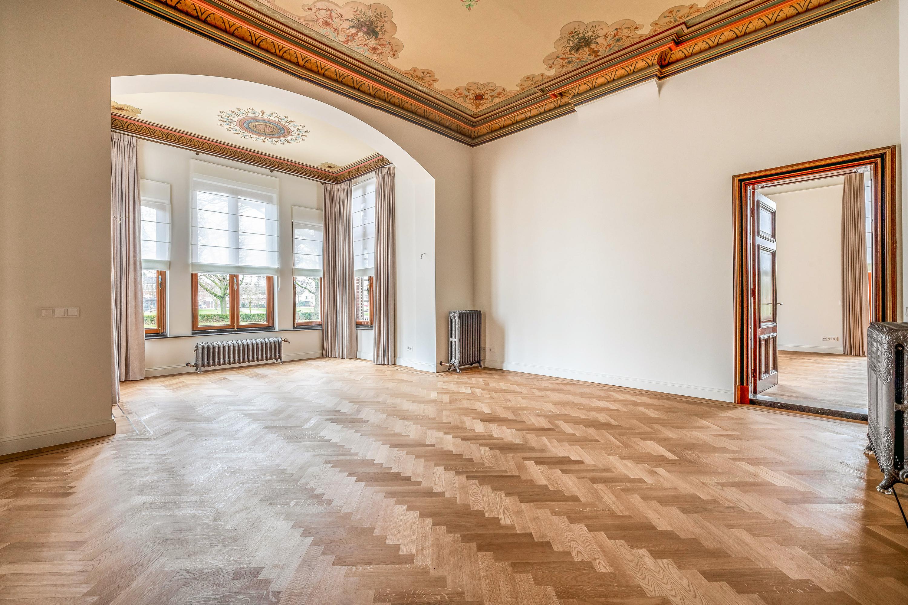 Vanuit de ontvangsthal bereikt u de royale en statige woonkamer, verdeeld in twee comfortabele zitgedeeltes die via grote, houten openslaande deuren van elkaar gescheiden kunnen worden. Zo kan er ook ruimte gecreëerd worden voor bijvoorbeeld een kantoor aan huis. Deze ruimtes worden gekenmerkt door de hoge plafonds en de indrukwekkende, authentieke plafondschilderingen die een tijdloze sfeer creëren. Het licht valt rijkelijk binnen en benadrukt de warme, uitnodigende ambiance van deze leefruimtes.